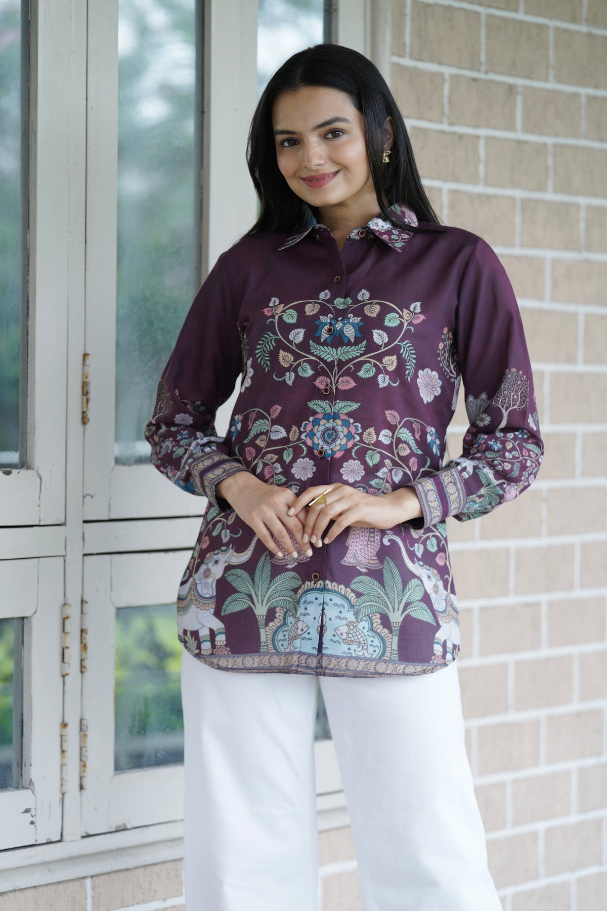 This shirt comes in a deep brown shade with beautiful floral and traditional prints. The front shows royal elephants, trees, and graceful figures that add a story-like feel. The back carries detailed floral and cultural patterns, making it eye-catching from every angle. A lovely mix of classic art and modern style.