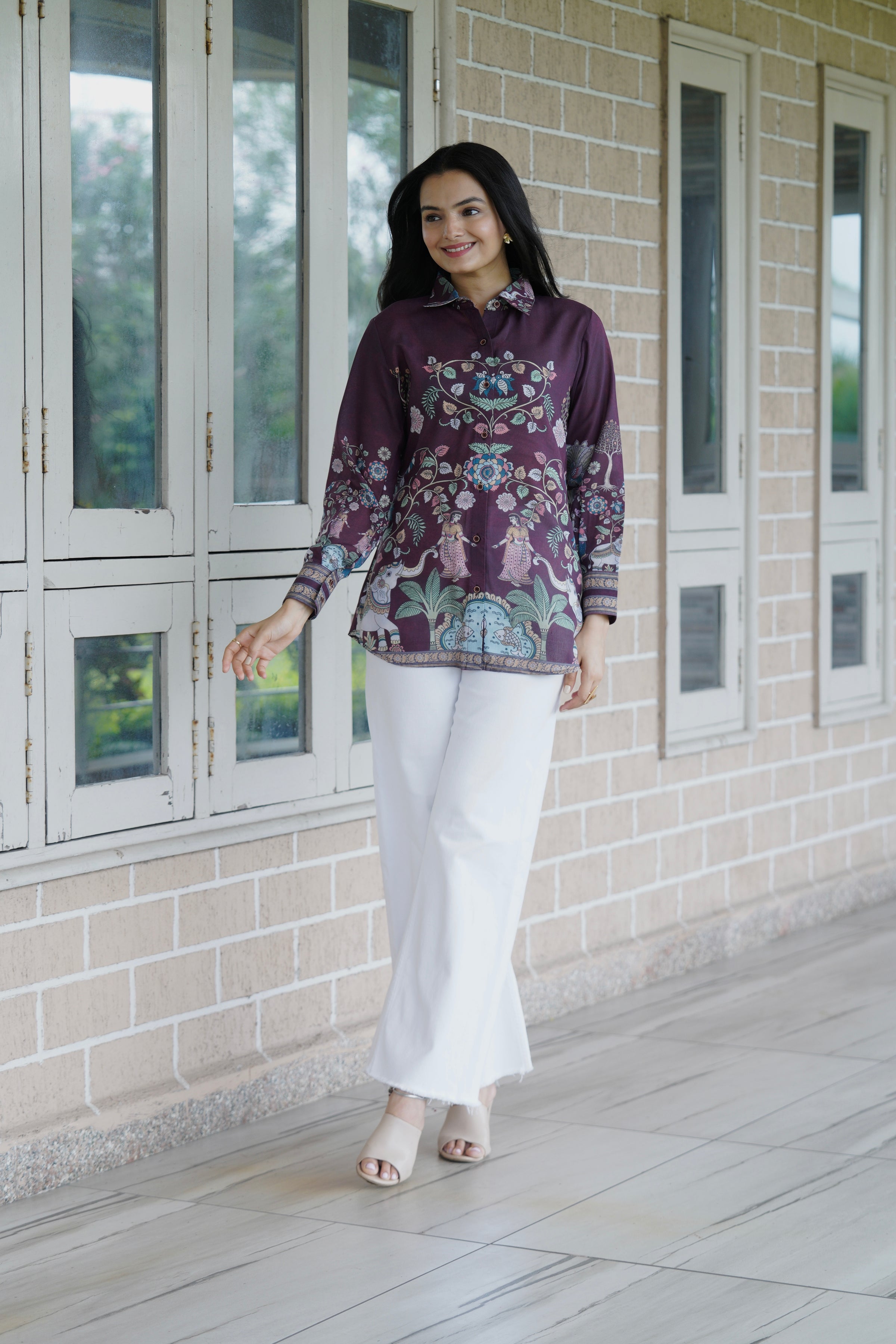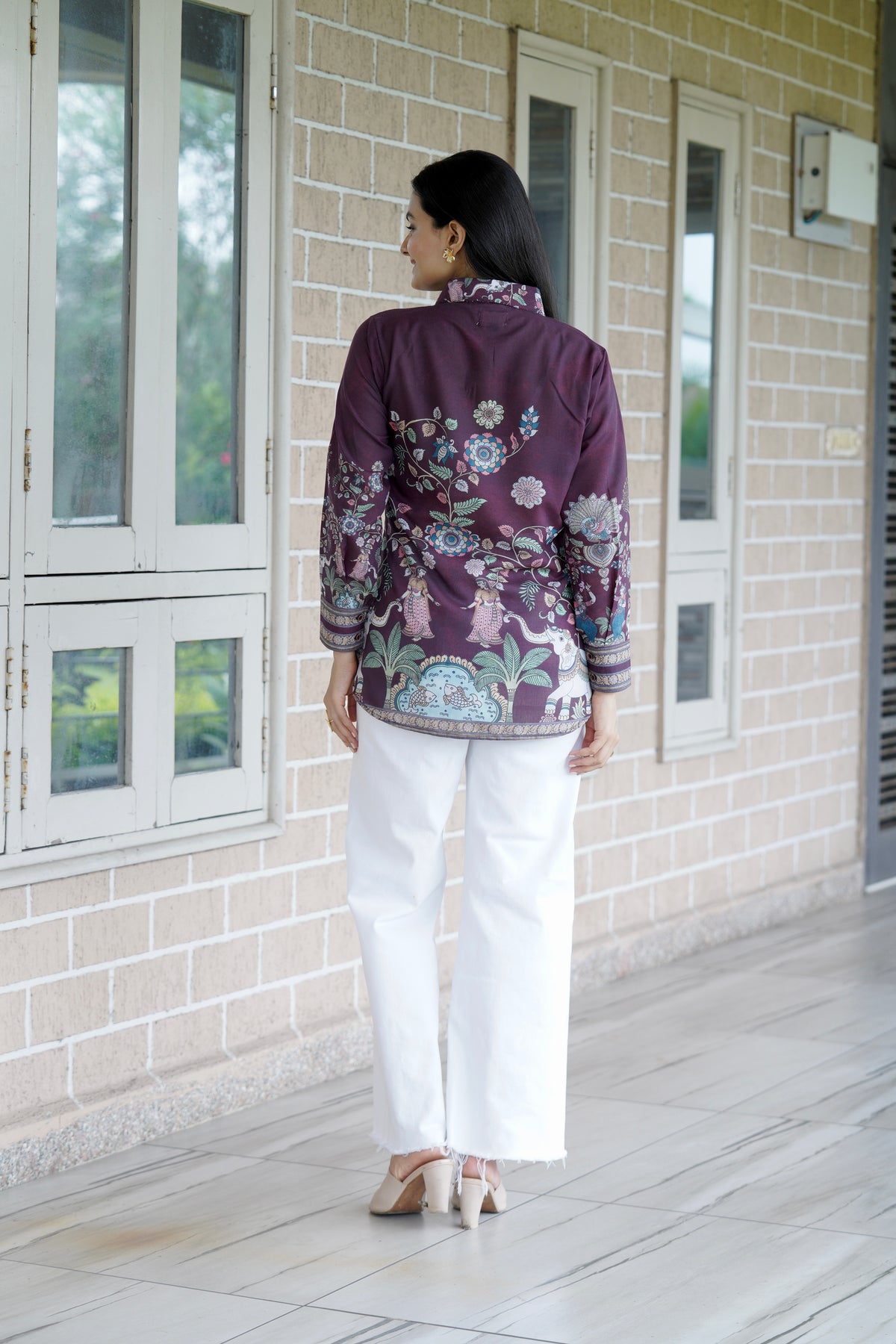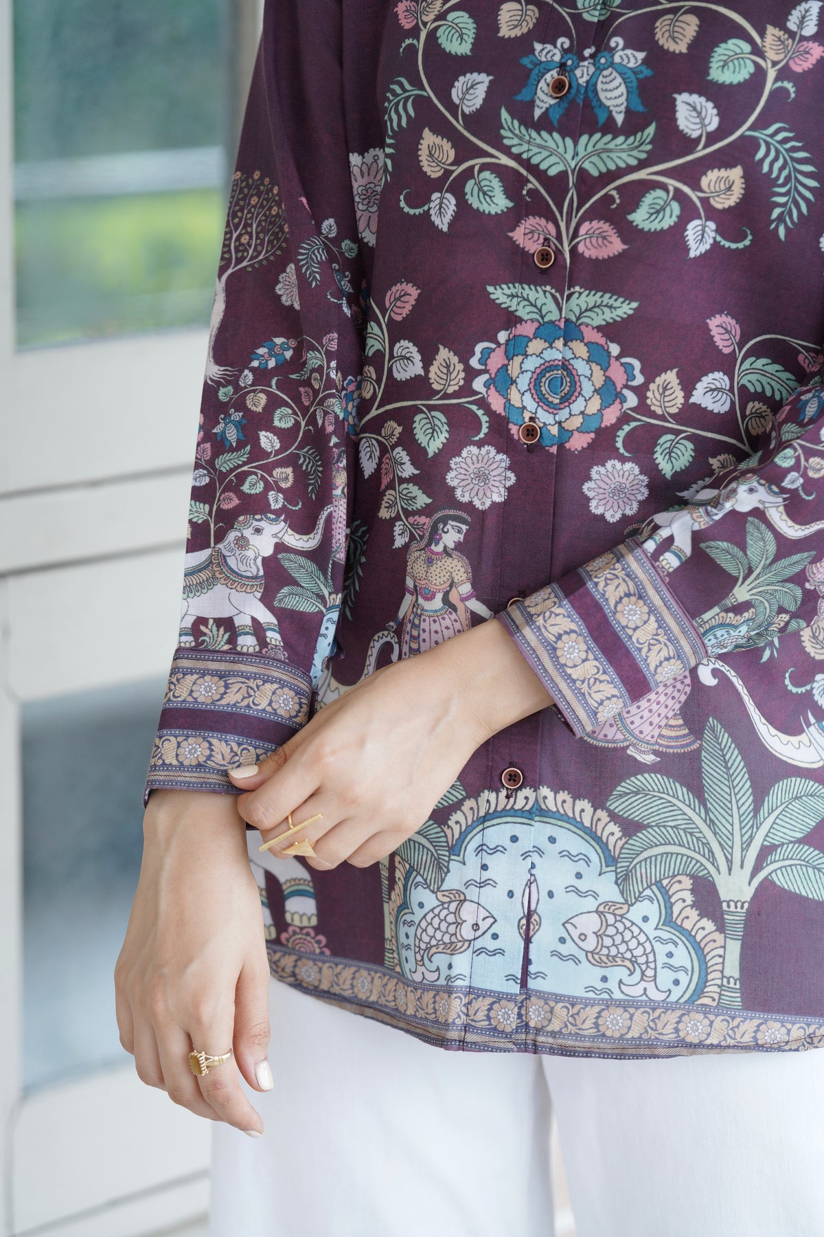 This shirt comes in a deep brown shade with beautiful floral and traditional prints. The front shows royal elephants, trees, and graceful figures that add a story-like feel. The back carries detailed floral and cultural patterns, making it eye-catching from every angle. A lovely mix of classic art and modern style.
