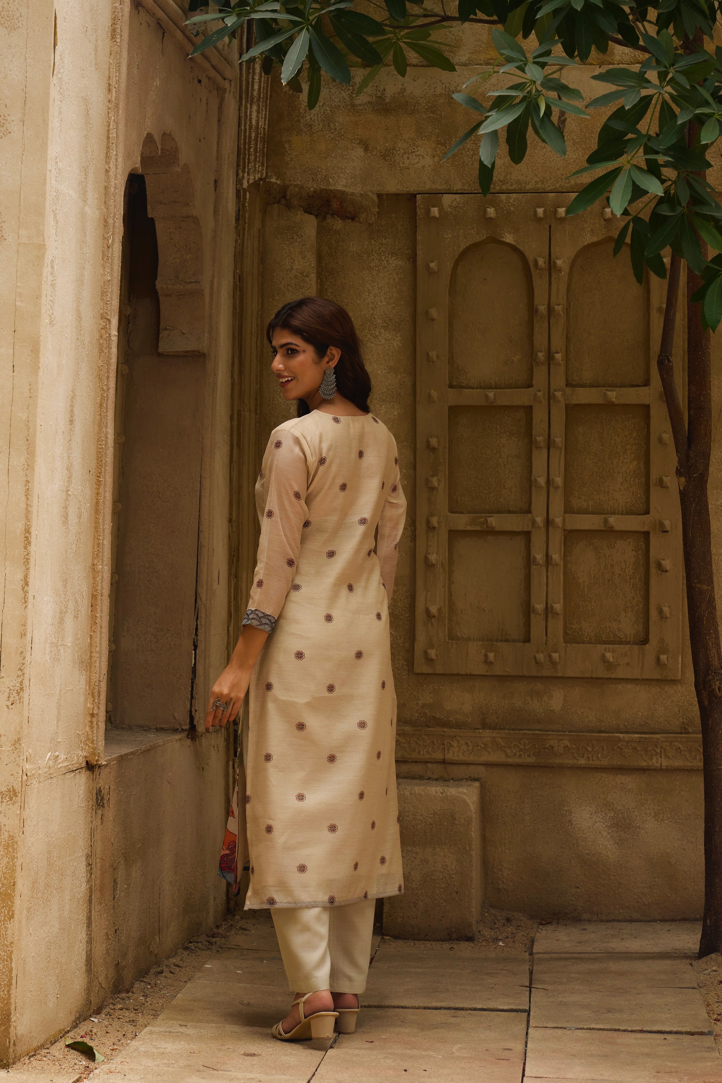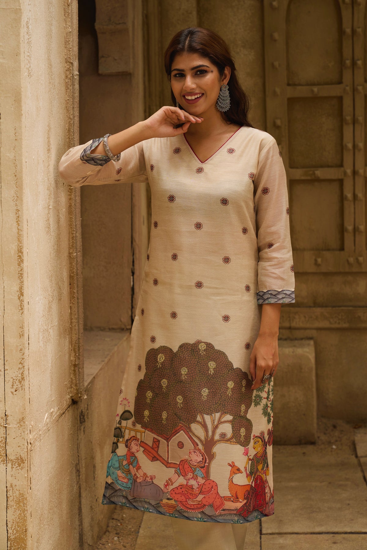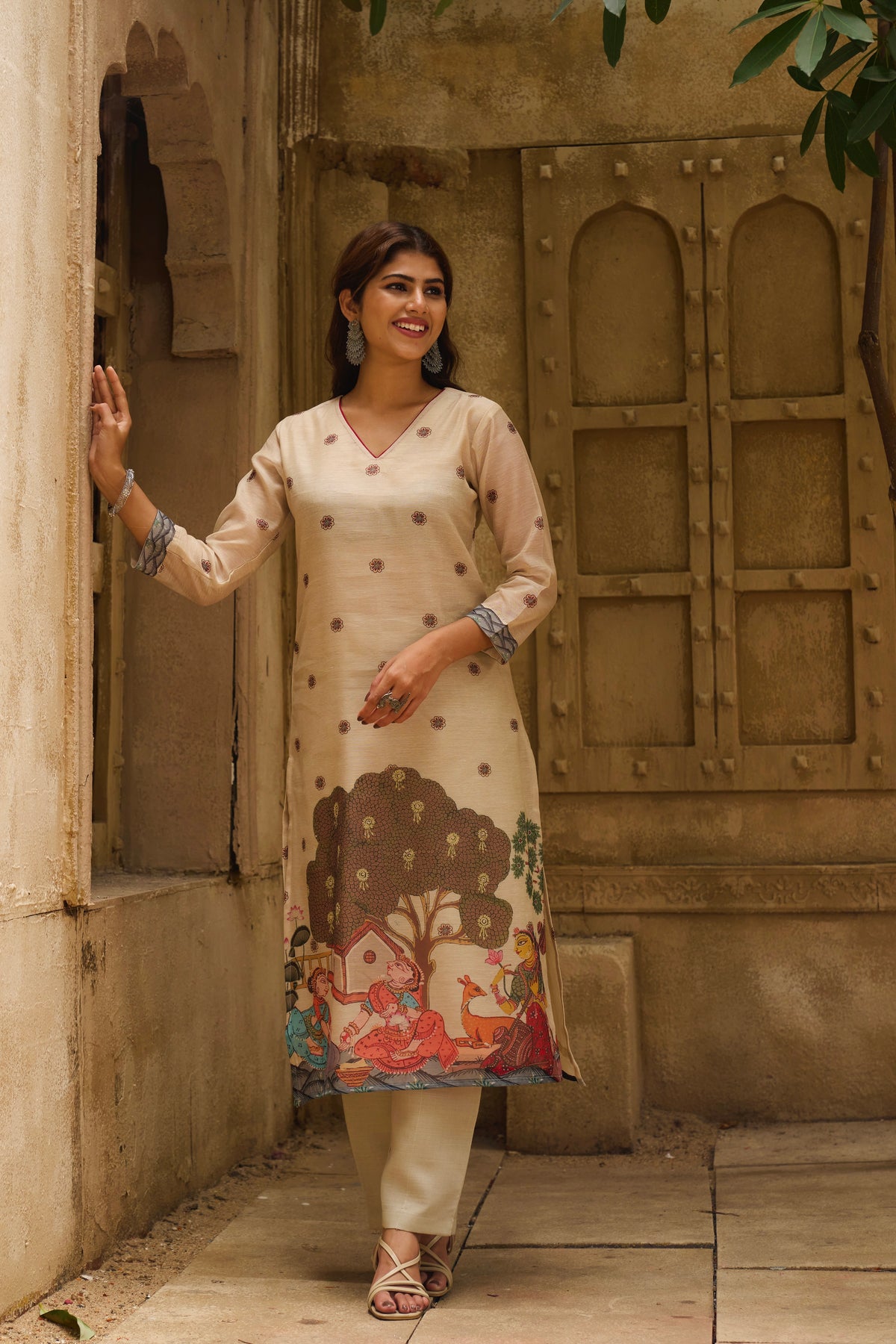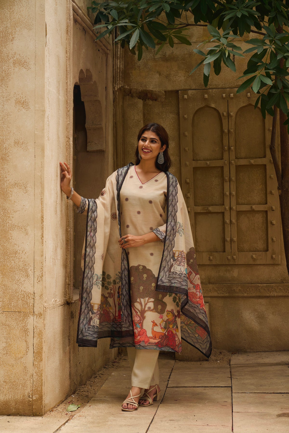 This grey suit is paired with a captivating cotton silk dupatta adorned with intricate folk art-inspired motifs and soft floral elements. The subtle earthy tones combined with traditional storytelling prints make it a timeless ensemble. A refined yet artistic pick for cultural gatherings.