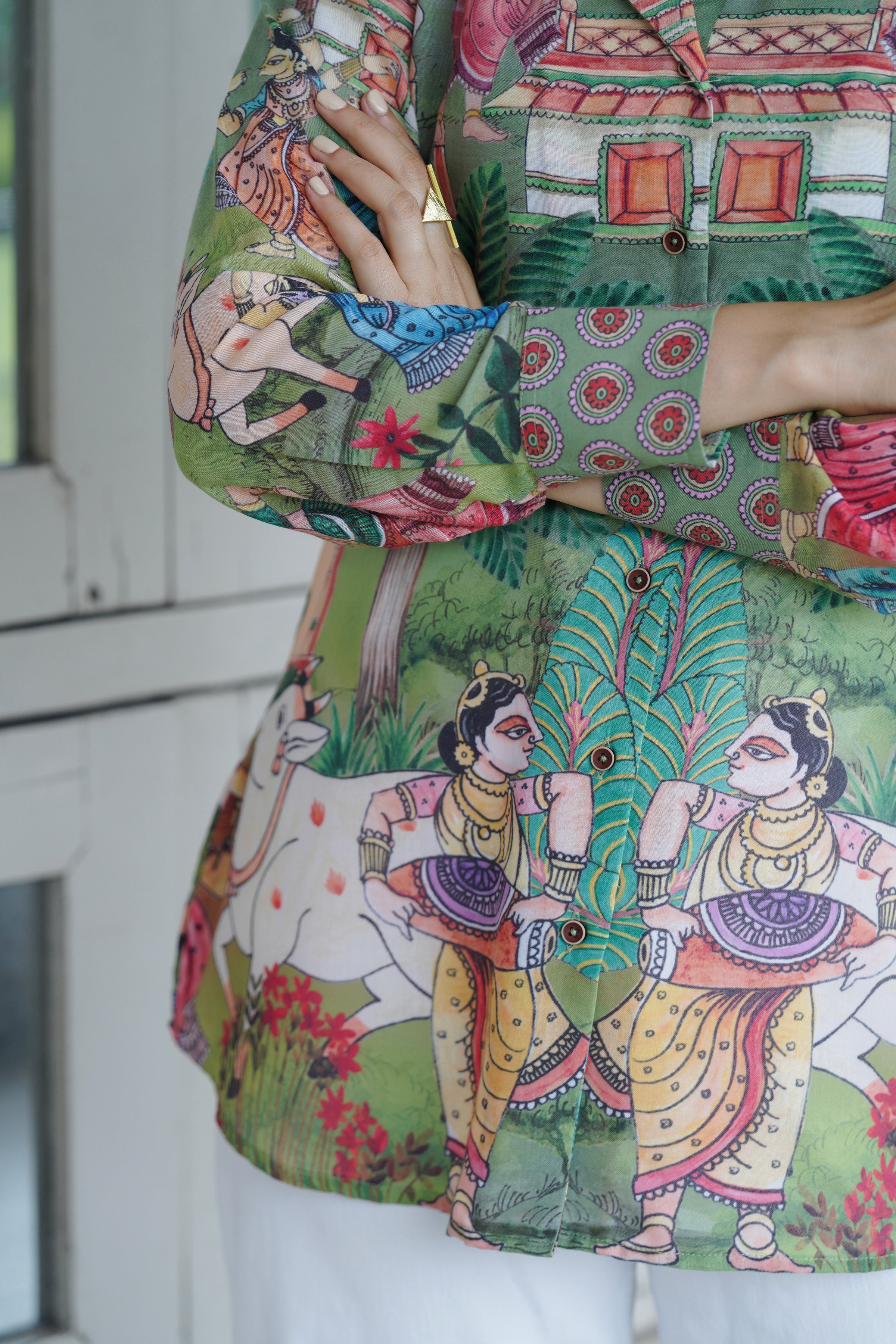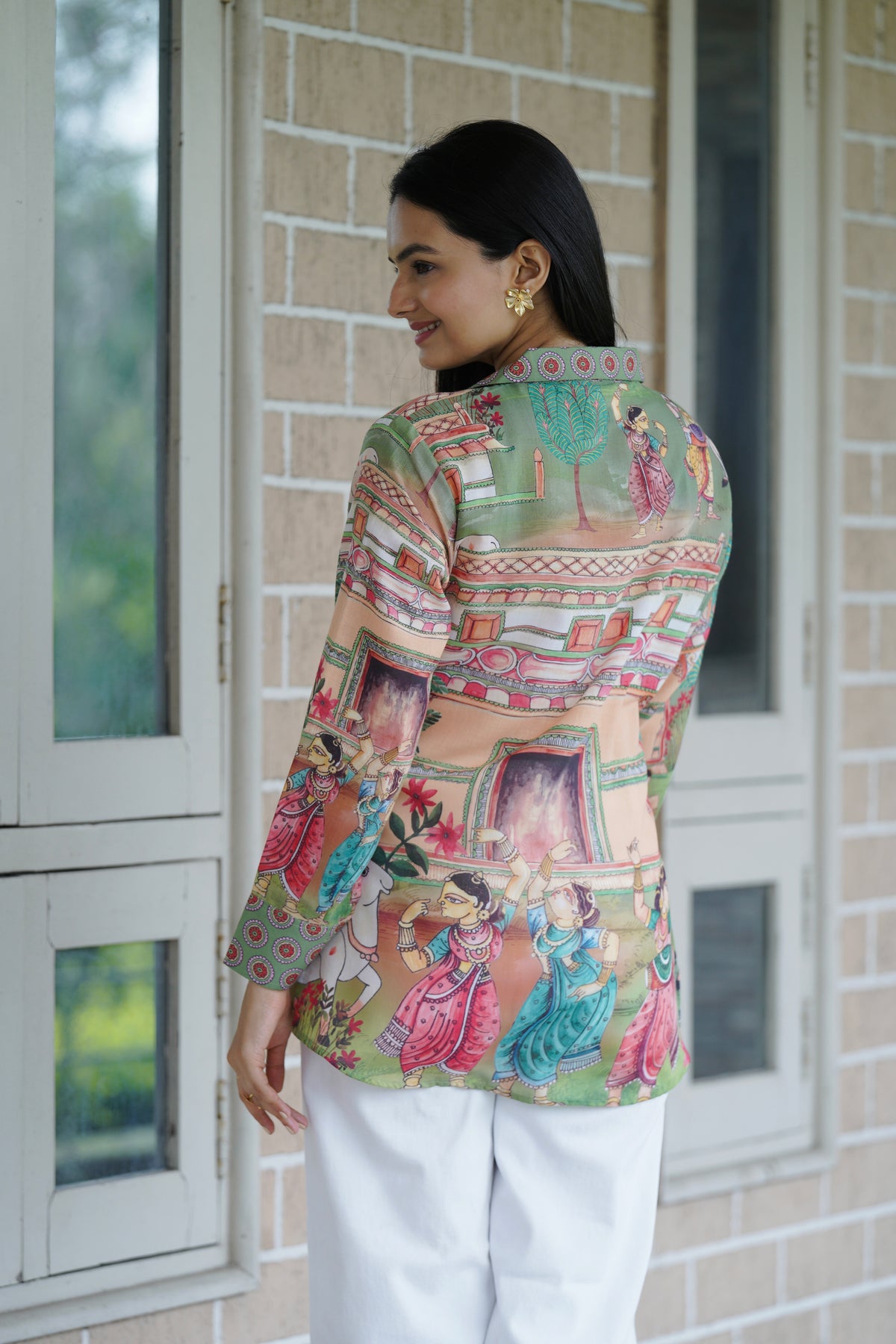 This shirt has a bright and detailed design inspired by traditional Indian scenes. The front shows royal figures, trees, and beautiful patterns. The back continues the look with women in traditional clothes and festive moments. It adds a touch of culture and charm to your everyday style. A perfect choice for a unique and eye-catching outfit.
