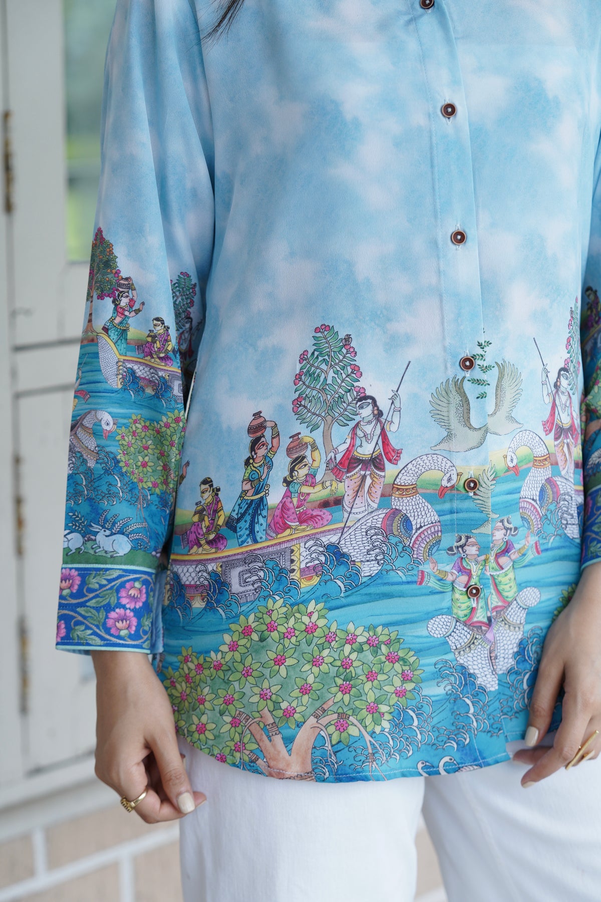 This shirt features a soft sky-blue base with detailed and colorful prints of royal boats, trees, and traditional figures. The artwork along the border and sleeves brings a story-like charm inspired by cultural scenes. With its rich design and fresh color, it’s perfect for adding a unique and graceful touch to your wardrobe. A blend of tradition and style in every look.