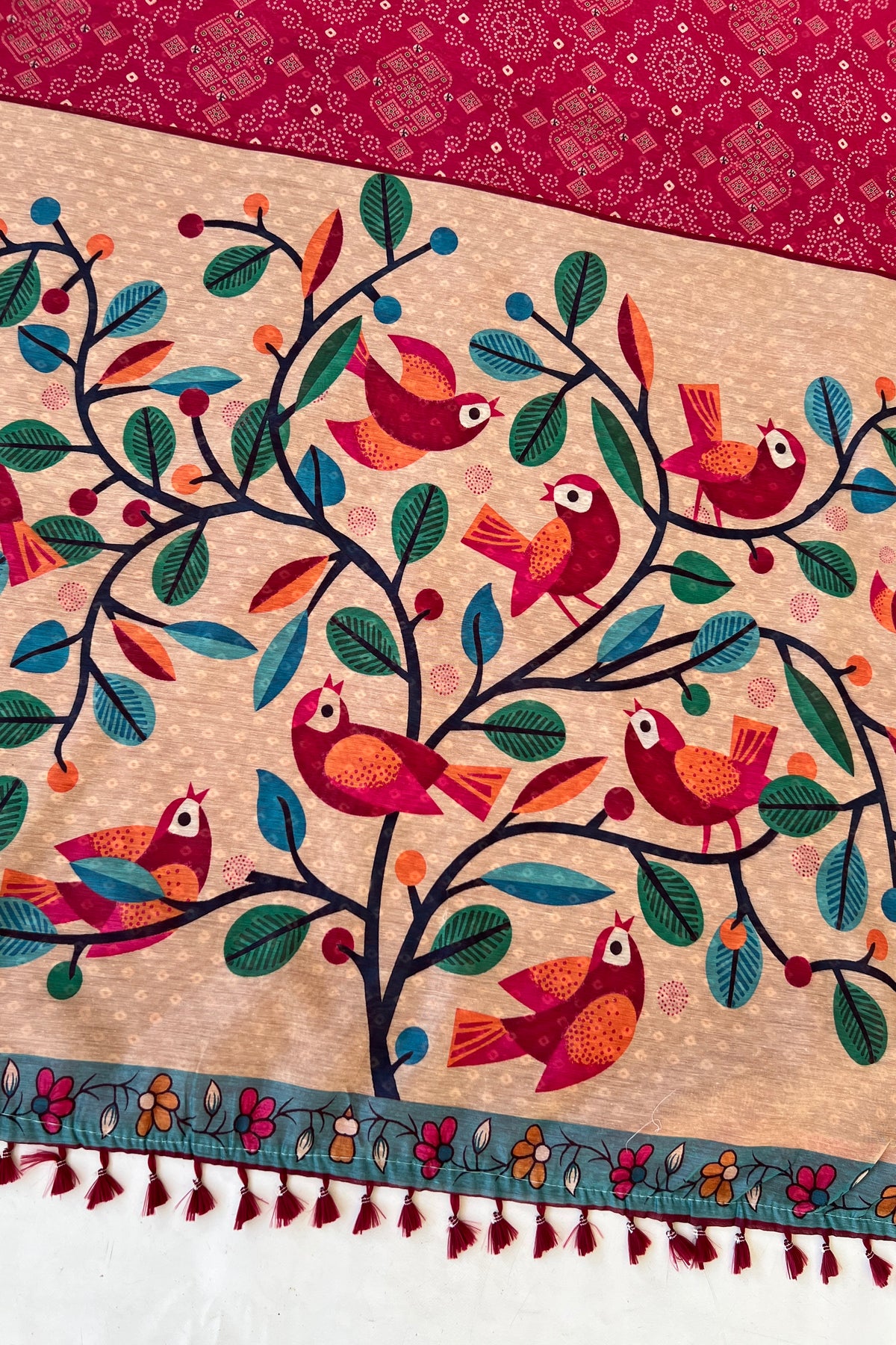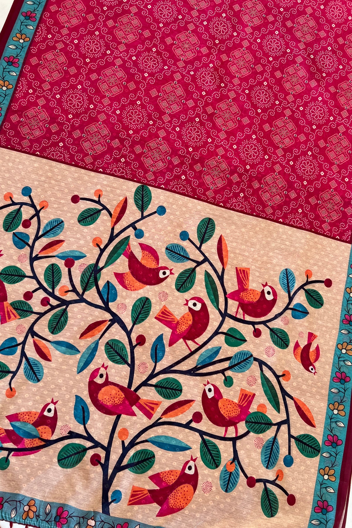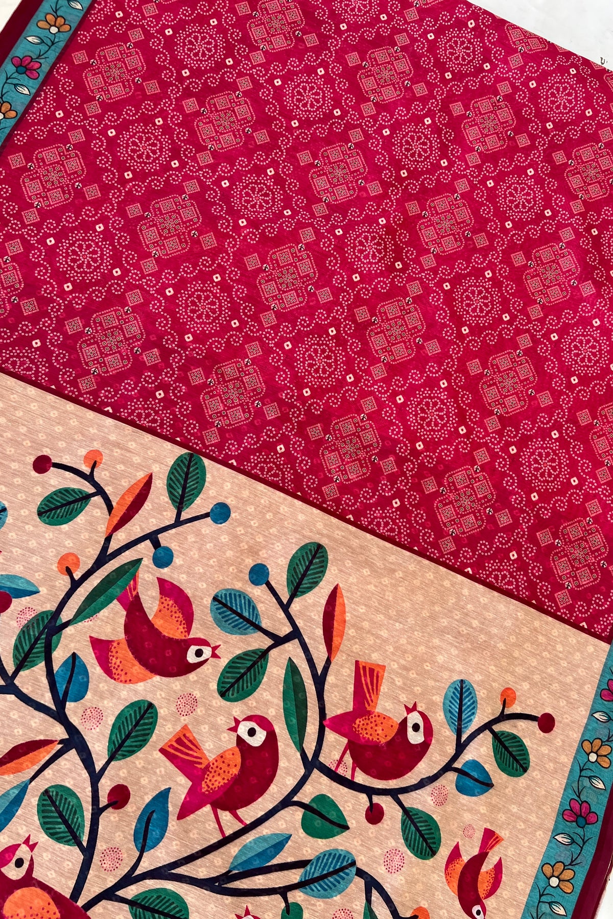 This saree features classic bandhani patterns in a rich pink base, lending it a traditional yet vibrant appeal. The pallu steals the spotlight with a colorful bird-on-branches design, full of playful details and lively hues. A contrasting floral border with tassel finishing adds charm and completes its eye-catching look.