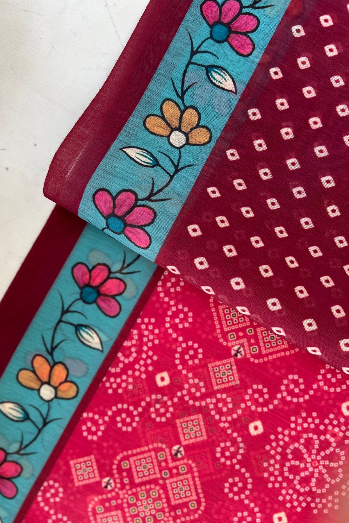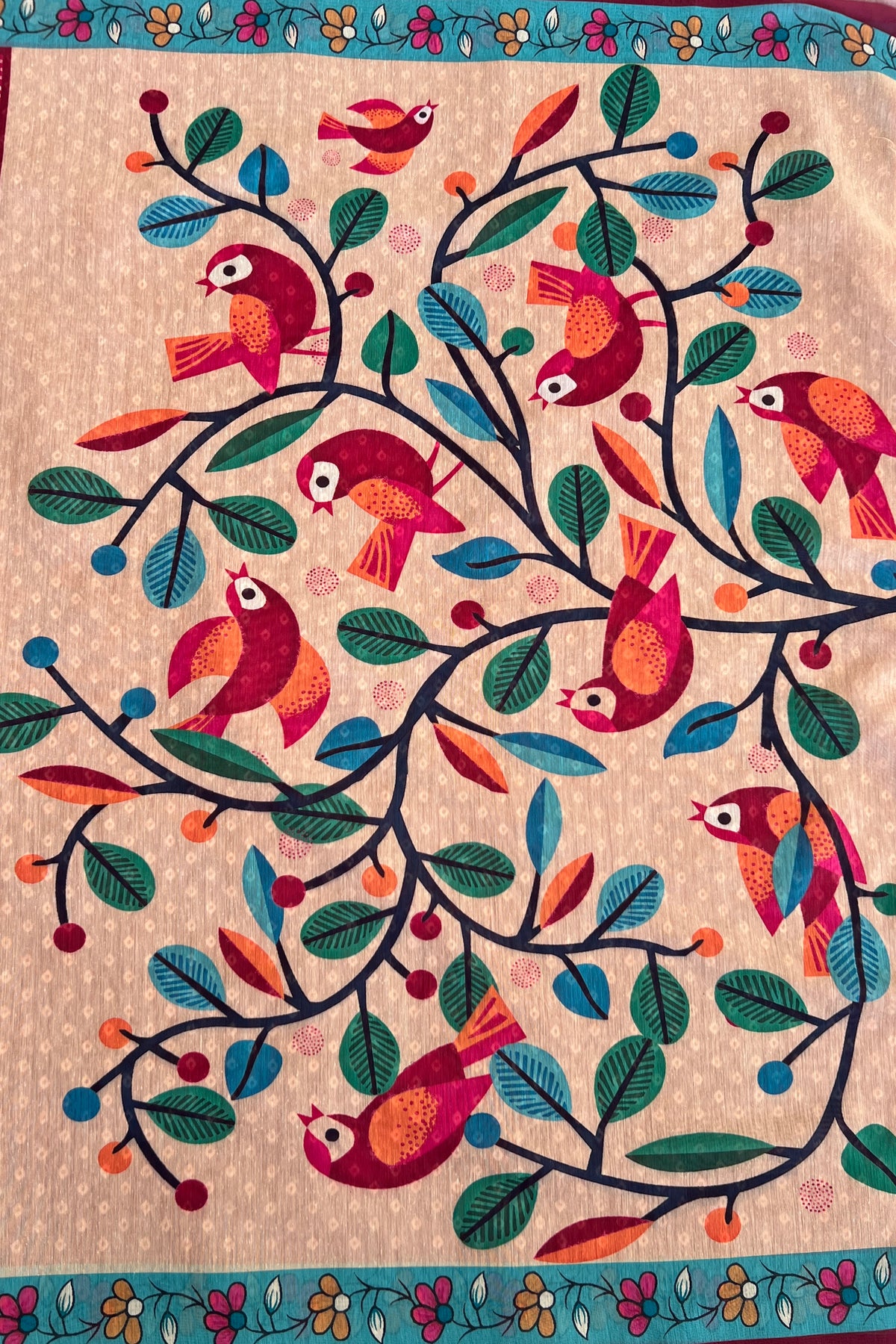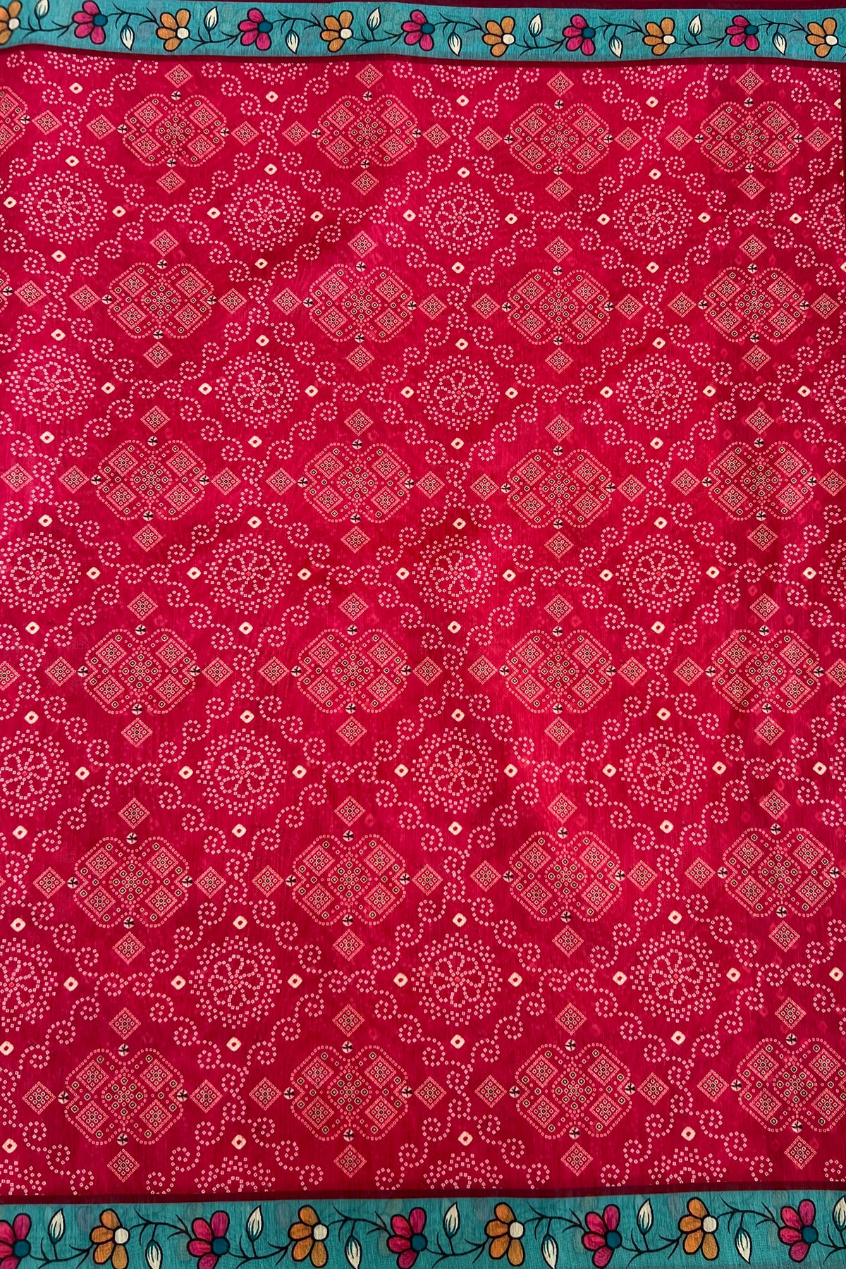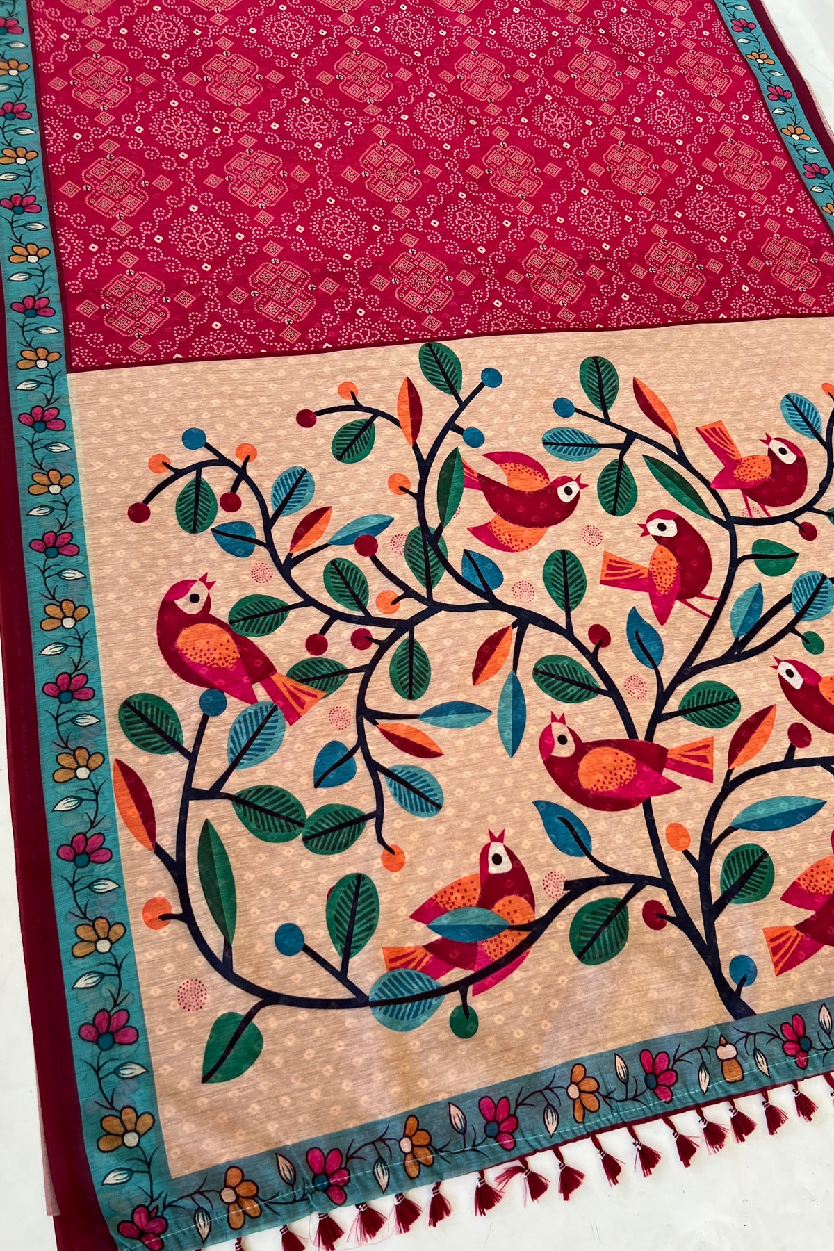 This saree features classic bandhani patterns in a rich pink base, lending it a traditional yet vibrant appeal. The pallu steals the spotlight with a colorful bird-on-branches design, full of playful details and lively hues. A contrasting floral border with tassel finishing adds charm and completes its eye-catching look.