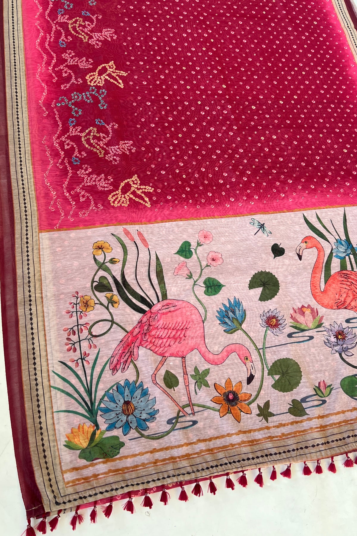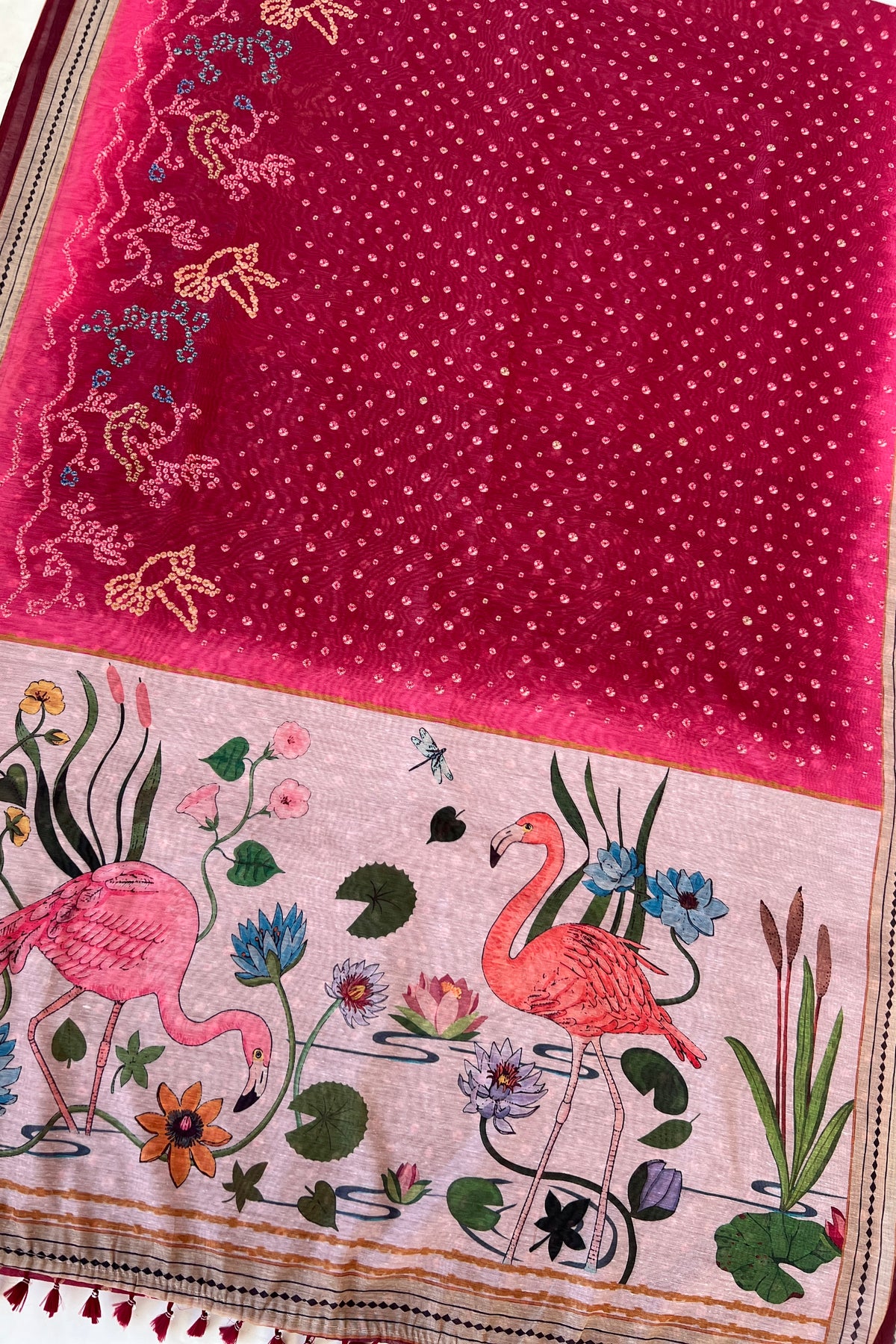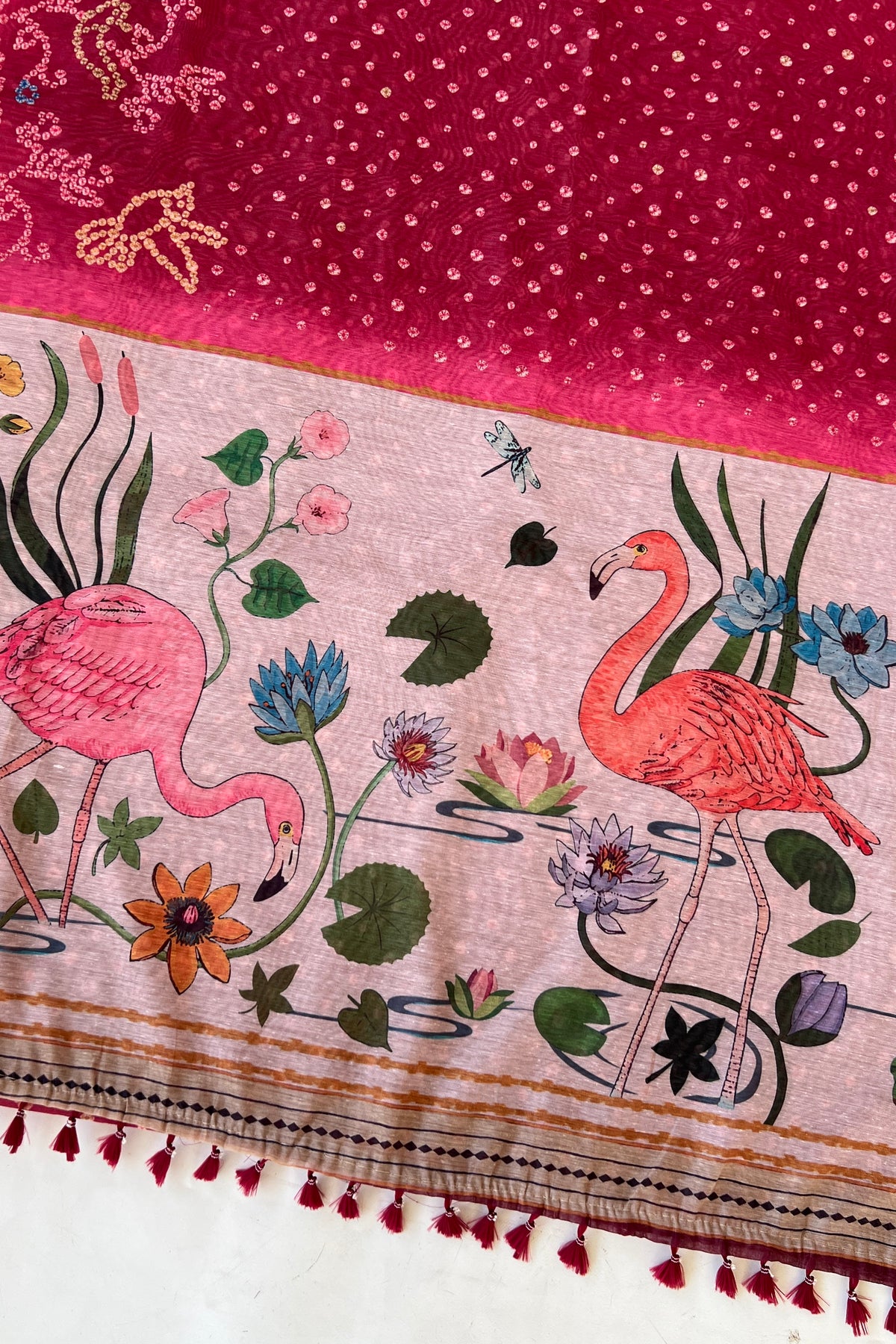 A vibrant bandhani saree featuring delicate dotted patterns on a rich pink base. The border is enhanced with floral and bow motifs, while the pallu highlights artistic flamingo and lotus pond prints with colorful blooms. Finished with playful tassels, it blends tradition and contemporary charm effortlessly.