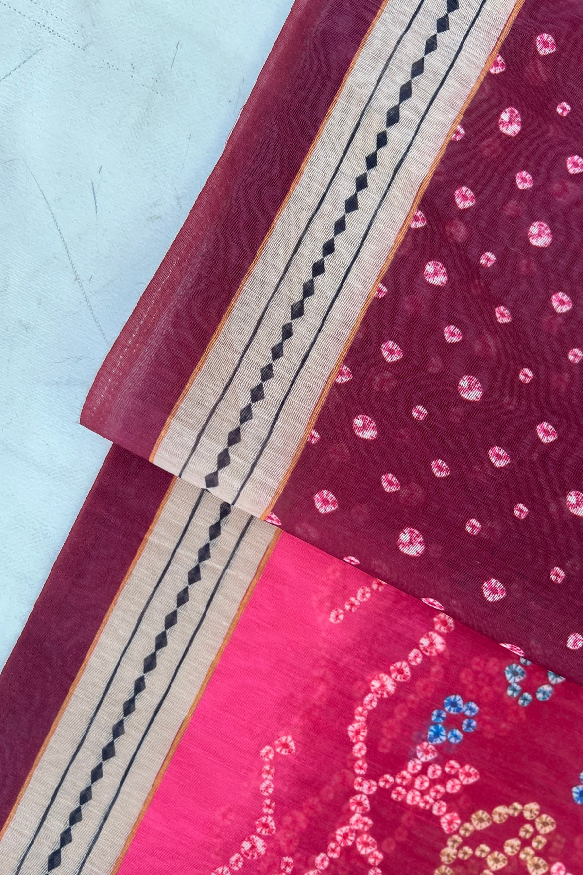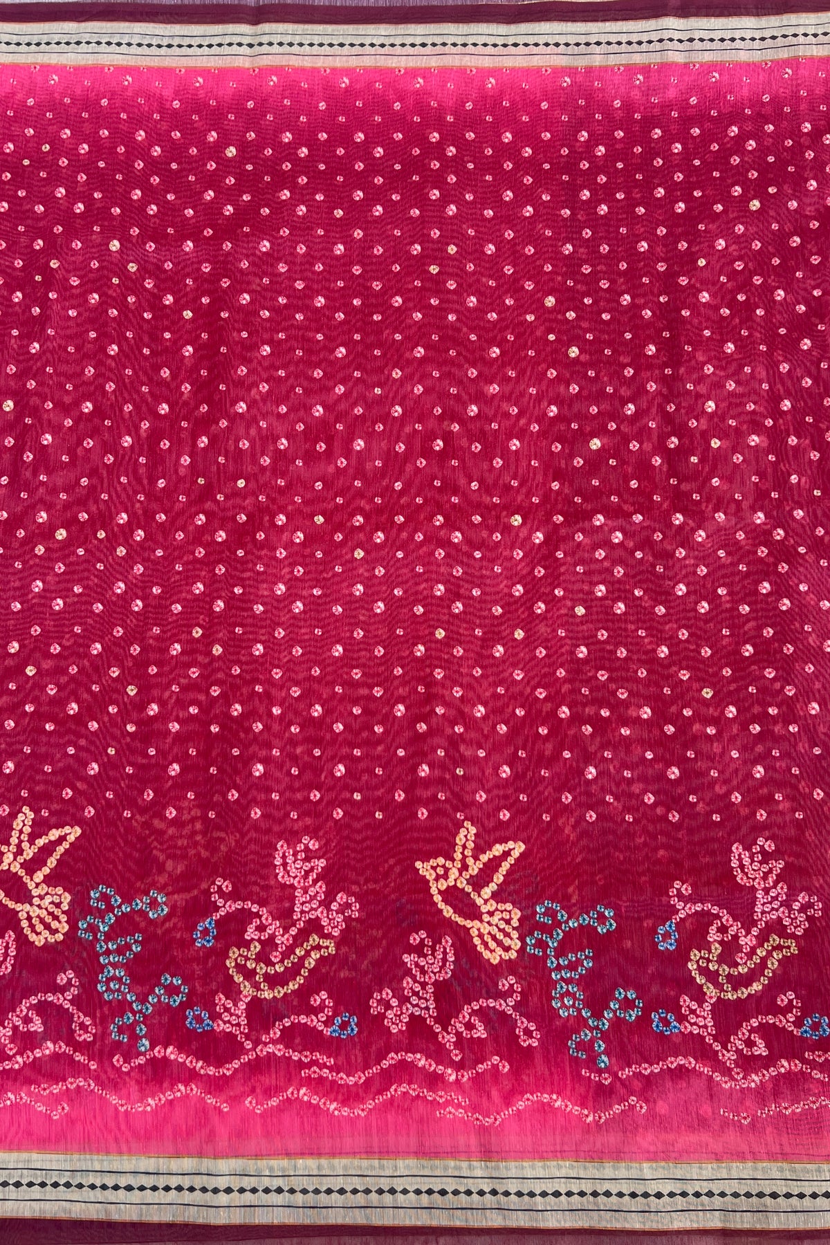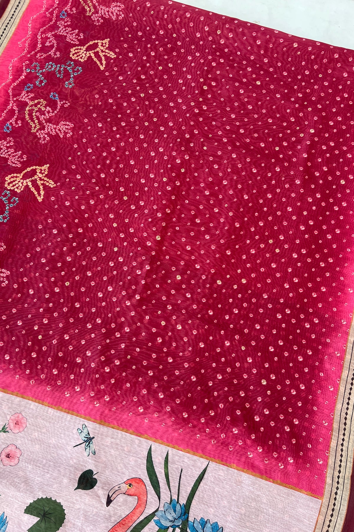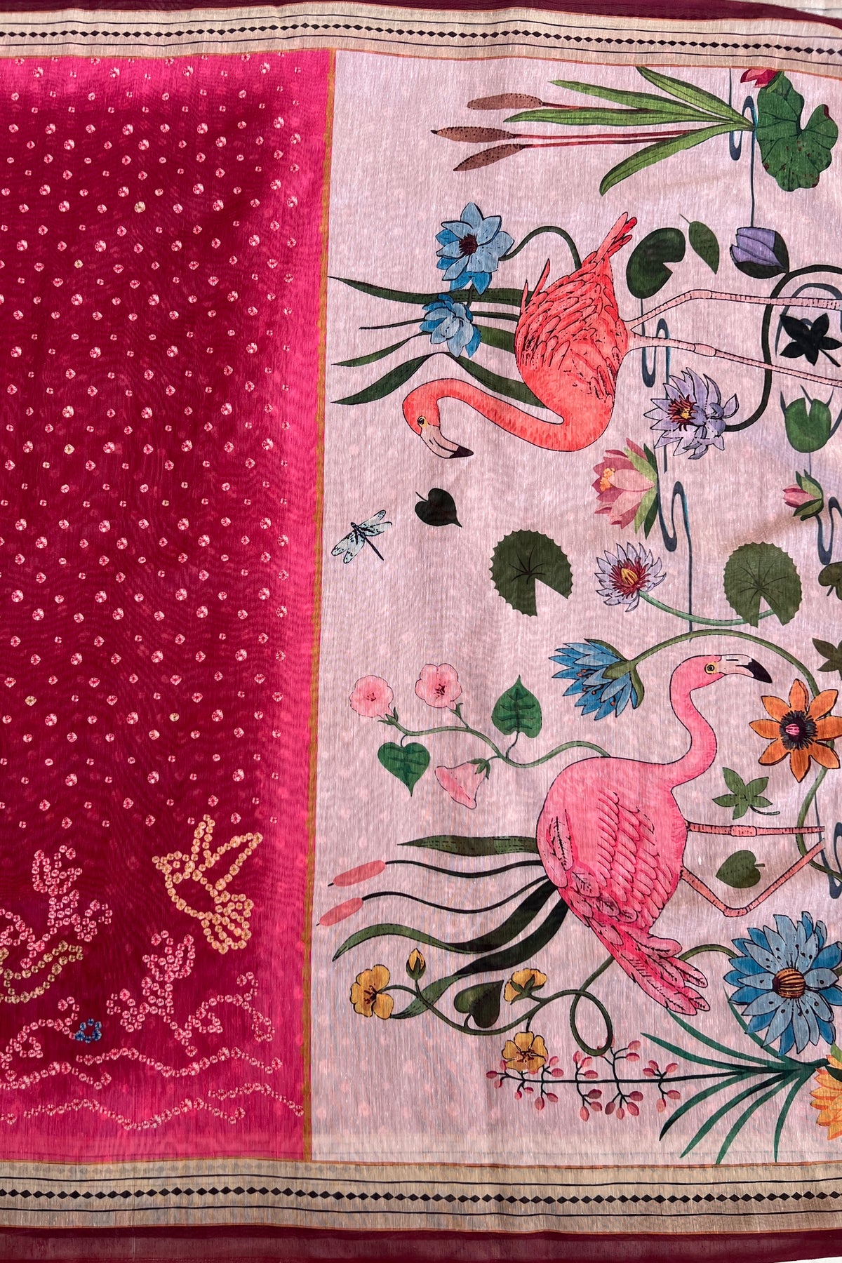 A vibrant bandhani saree featuring delicate dotted patterns on a rich pink base. The border is enhanced with floral and bow motifs, while the pallu highlights artistic flamingo and lotus pond prints with colorful blooms. Finished with playful tassels, it blends tradition and contemporary charm effortlessly.