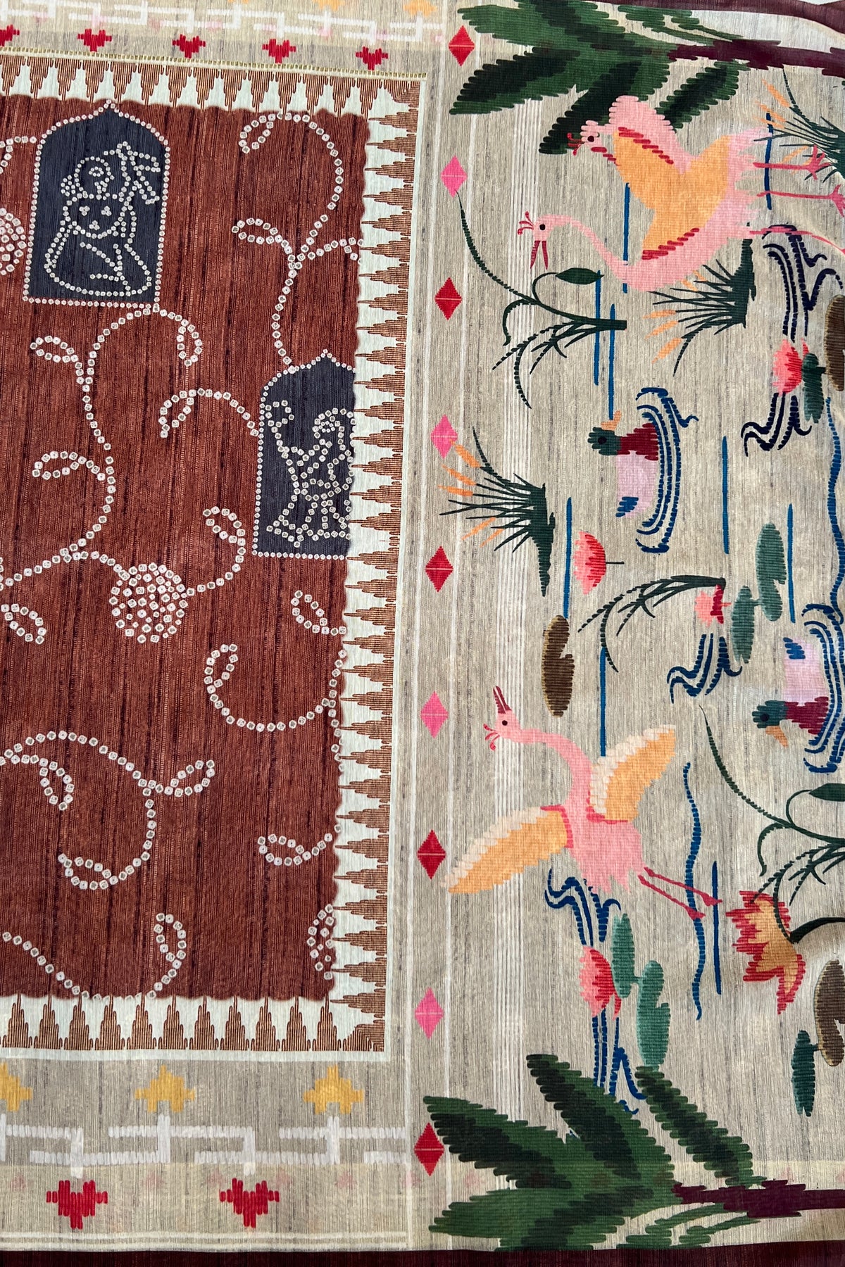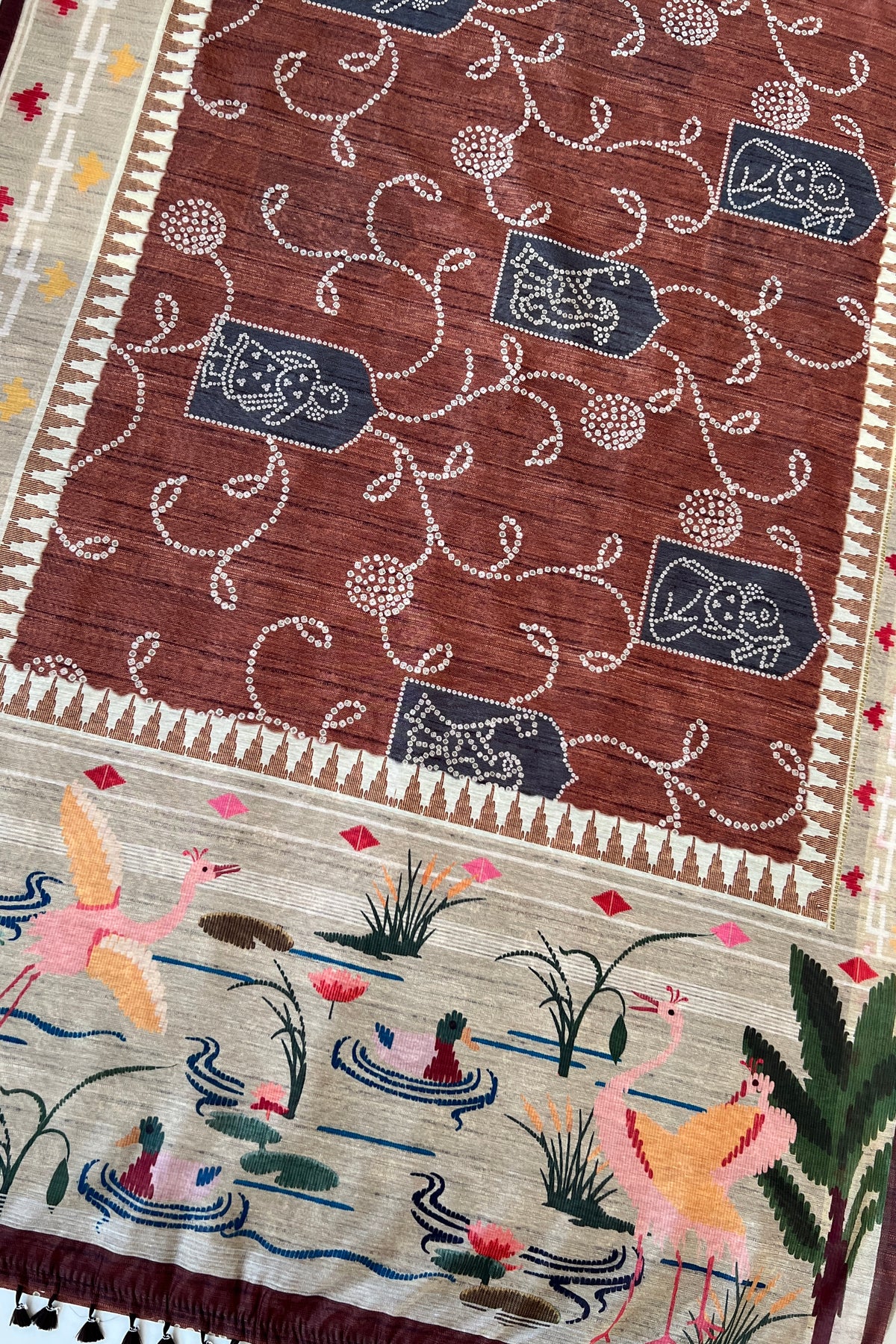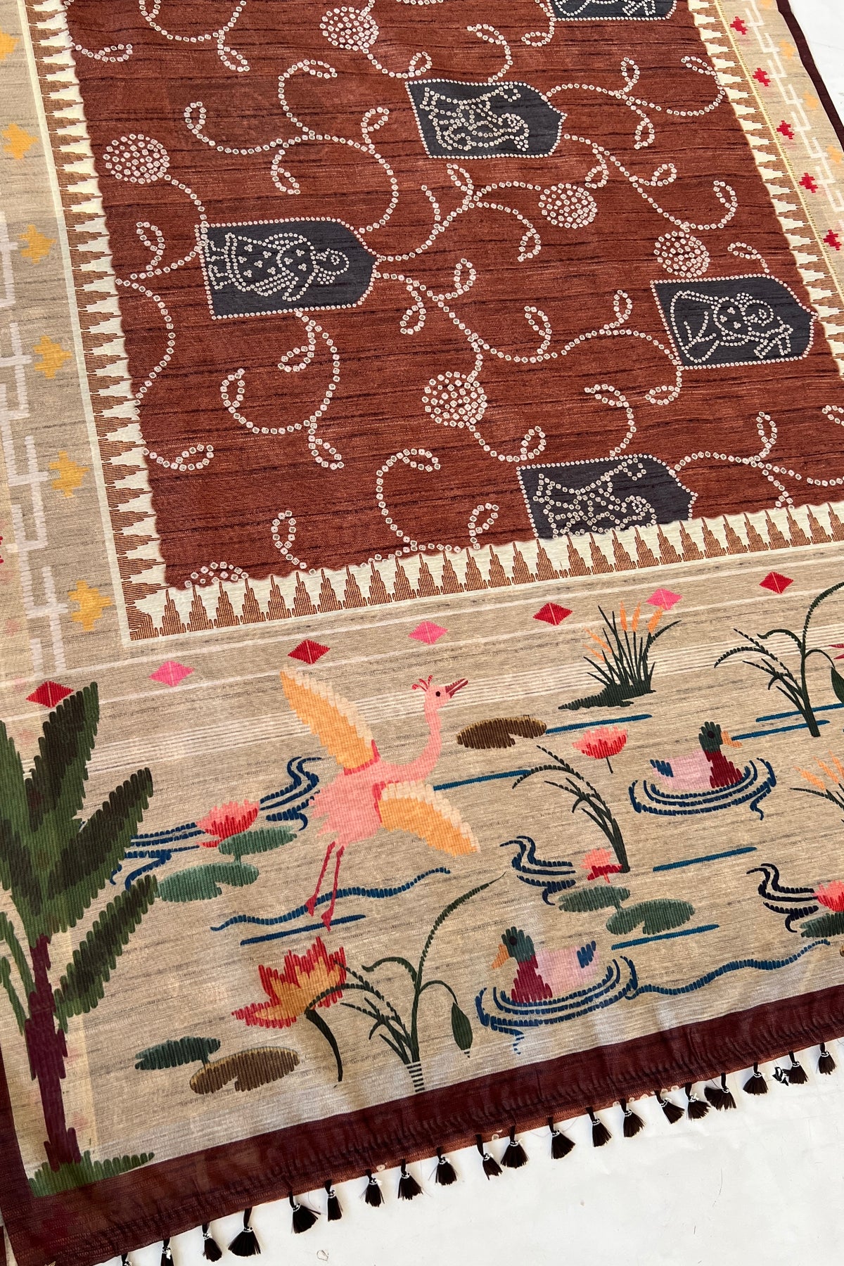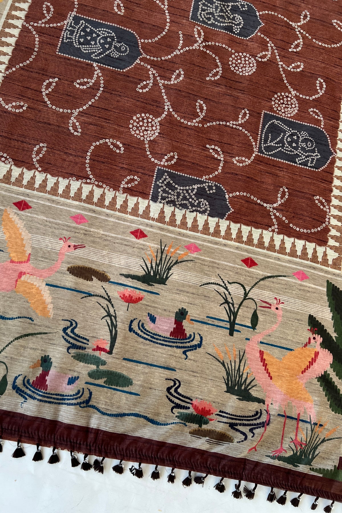 This saree features a rich rust bandhani-inspired pattern across the body, highlighted with delicate dotted motifs. The pallu stands out with a scenic pond design – cranes, ducks, and blooming lotuses come together to create a serene, nature-inspired story. A perfect mix of earthy and artistic.