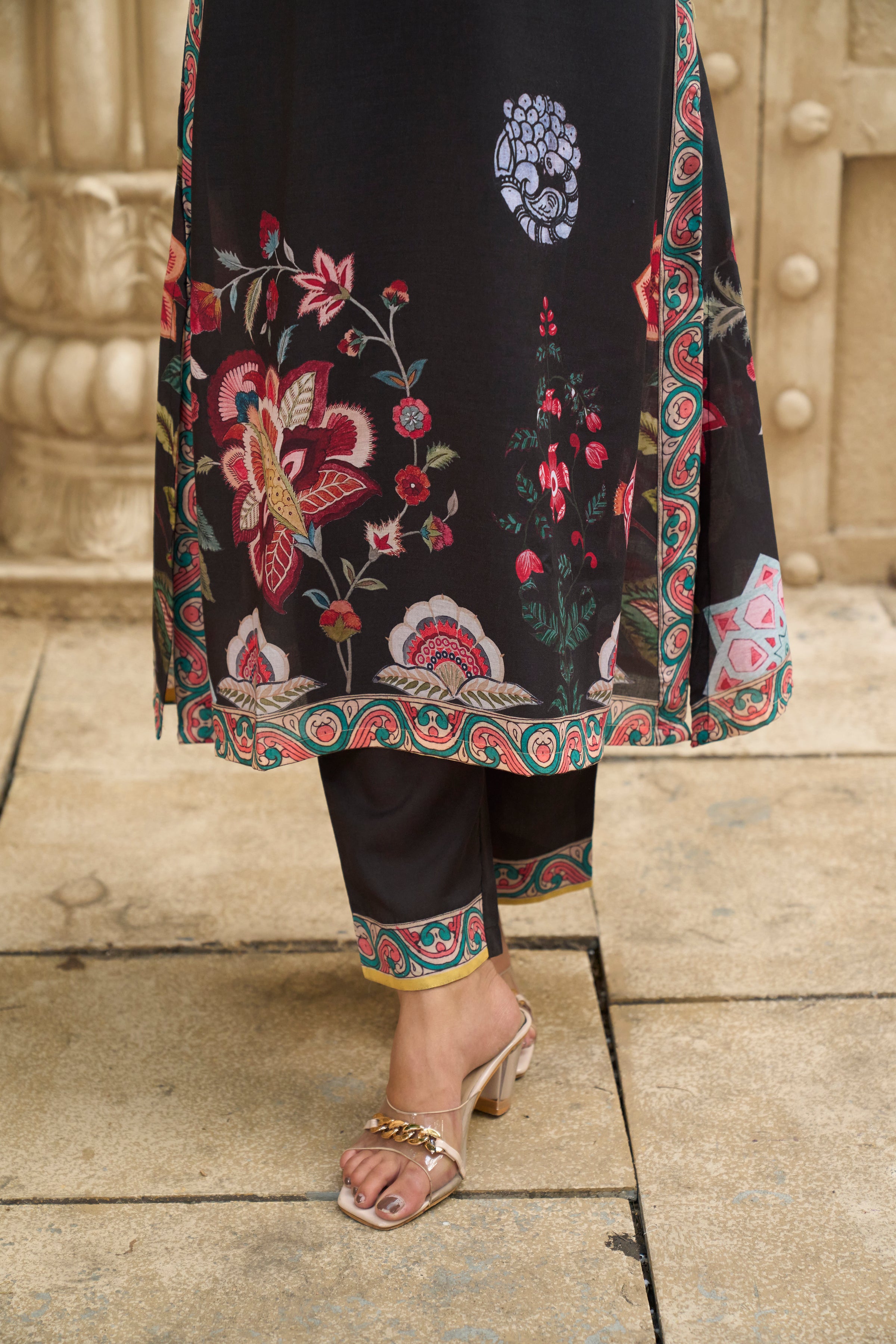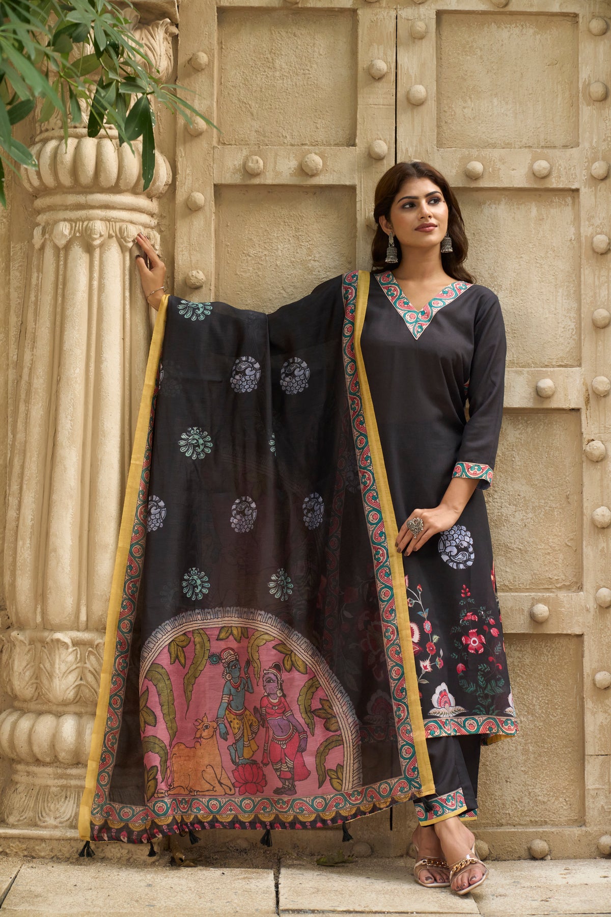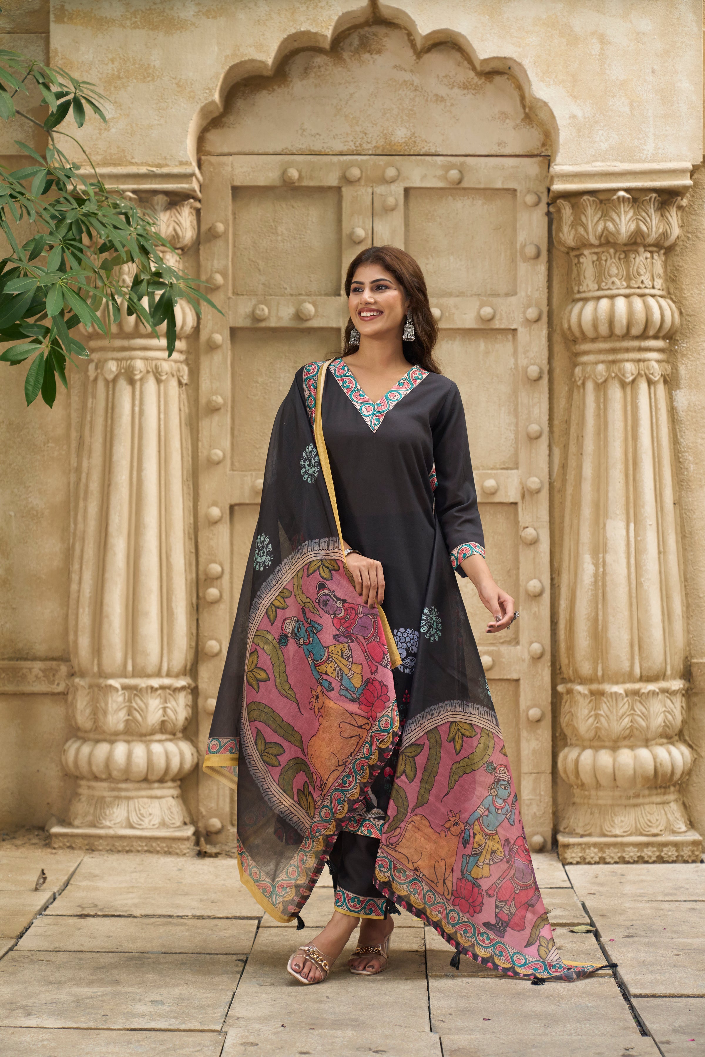 This vibrant suit set beautifully blends folk art with contemporary charm. The kurta features scattered floral motifs, a colourful eye-catching border, and a handy pocket for convenience. For added comfort, you can wear it with an inner, though the model is wearing it without one. The standout dupatta showcases a traditional storytelling panel, framed with intricate patterns and vibrant hues. Perfect for festive moments or days when you want your outfit to spark conversation.
