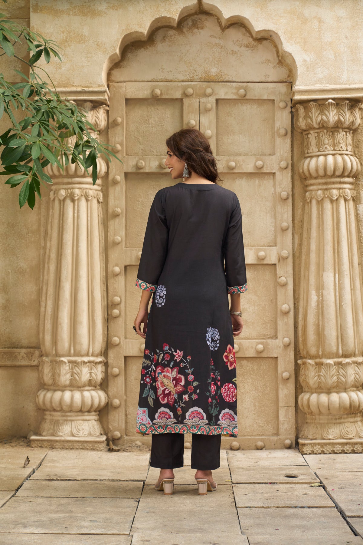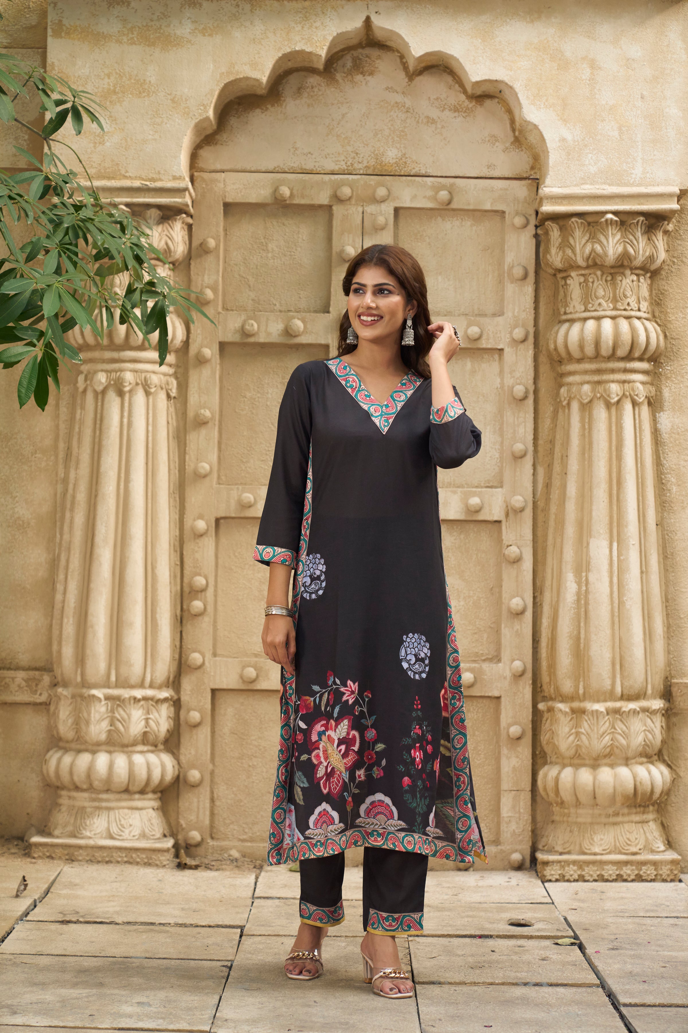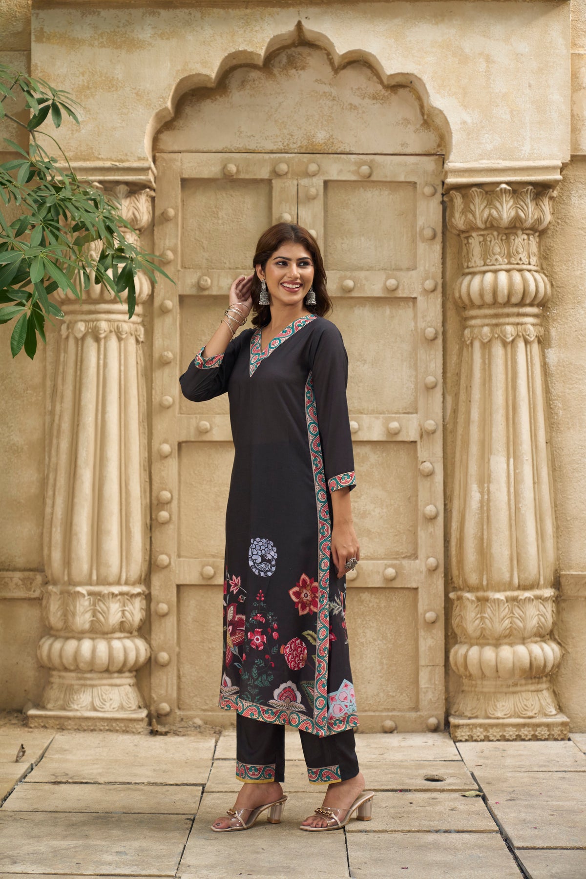This vibrant suit set beautifully blends folk art with contemporary charm. The kurta features scattered floral motifs, a colourful eye-catching border, and a handy pocket for convenience. For added comfort, you can wear it with an inner, though the model is wearing it without one. The standout dupatta showcases a traditional storytelling panel, framed with intricate patterns and vibrant hues. Perfect for festive moments or days when you want your outfit to spark conversation.