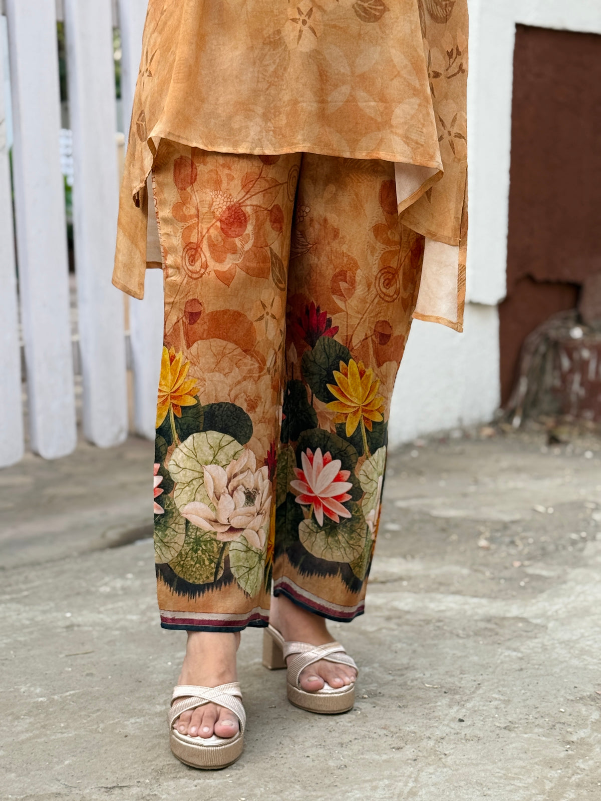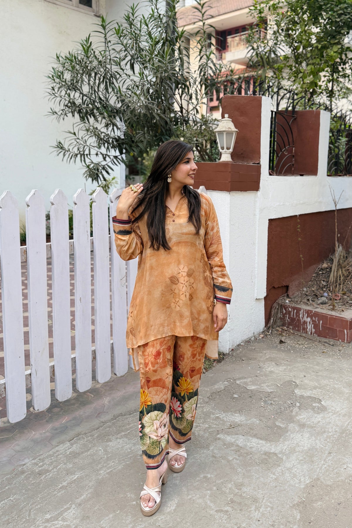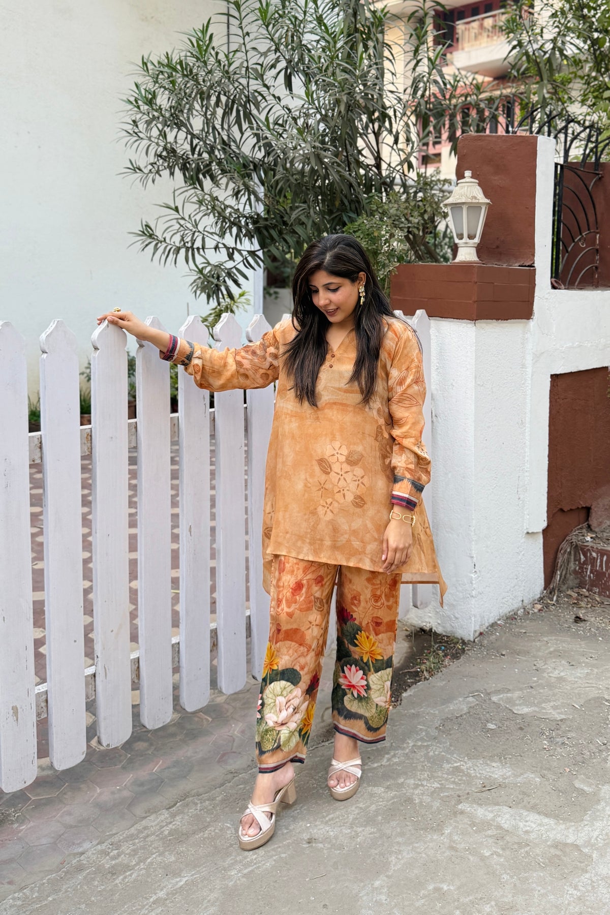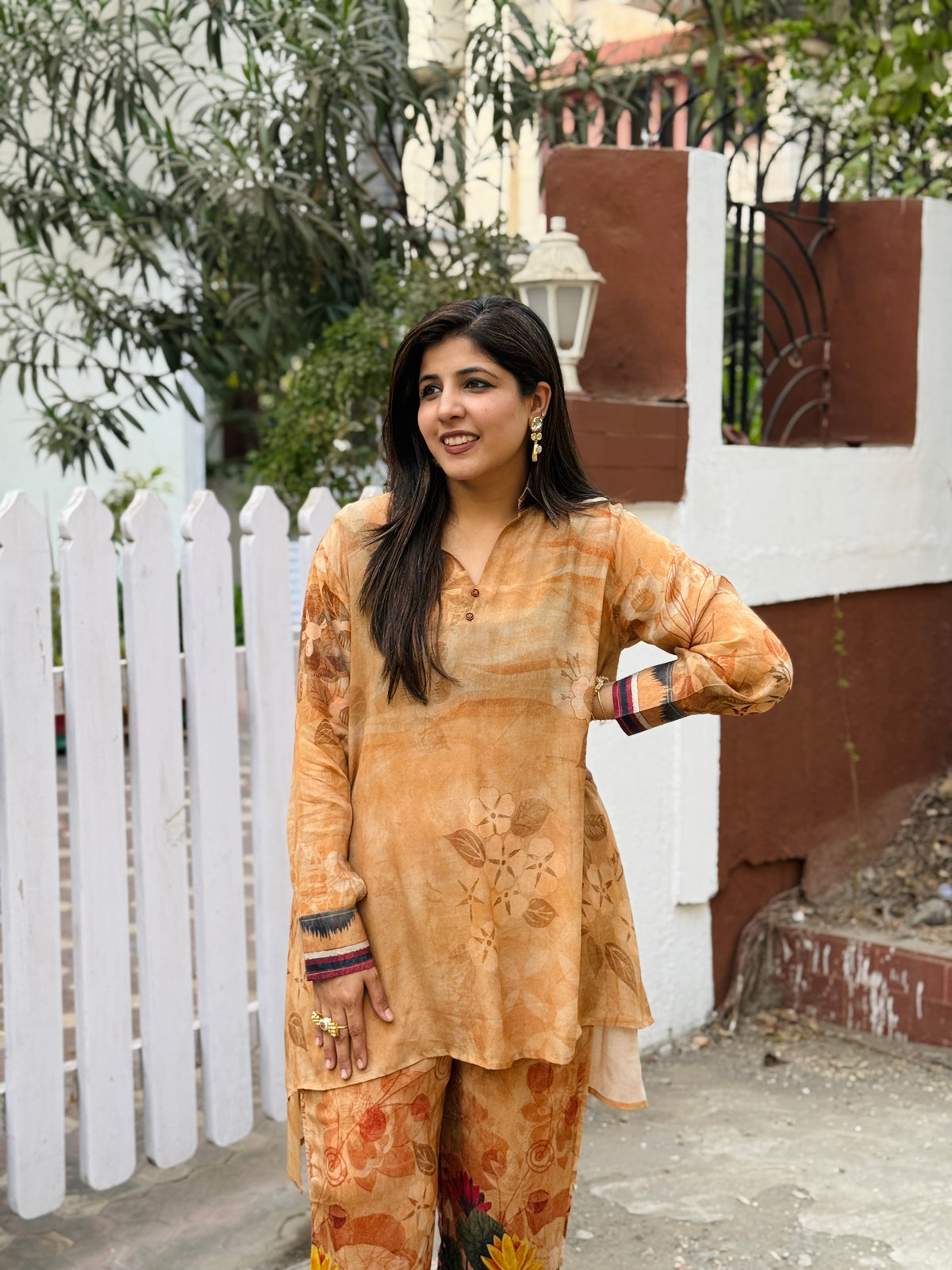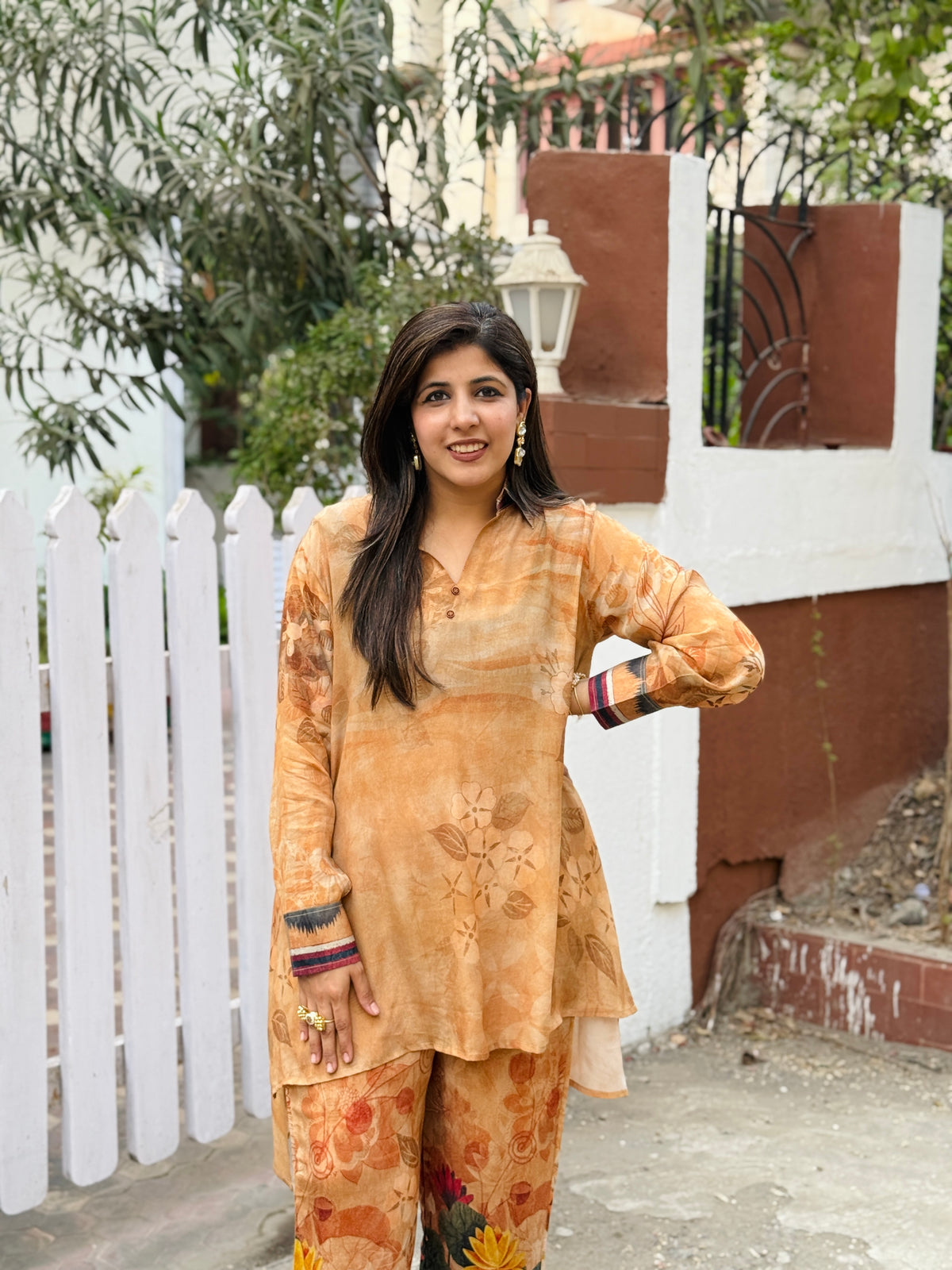 Check out our beautiful Viscose crepe co-ord set! Color in Mustrad with Unique Floral print. its Up-down Pattern And it's Pant has Floral Prints and with a Pocket. It will make you look Comfort with Classy and Sutable For Office wear, College Wear!