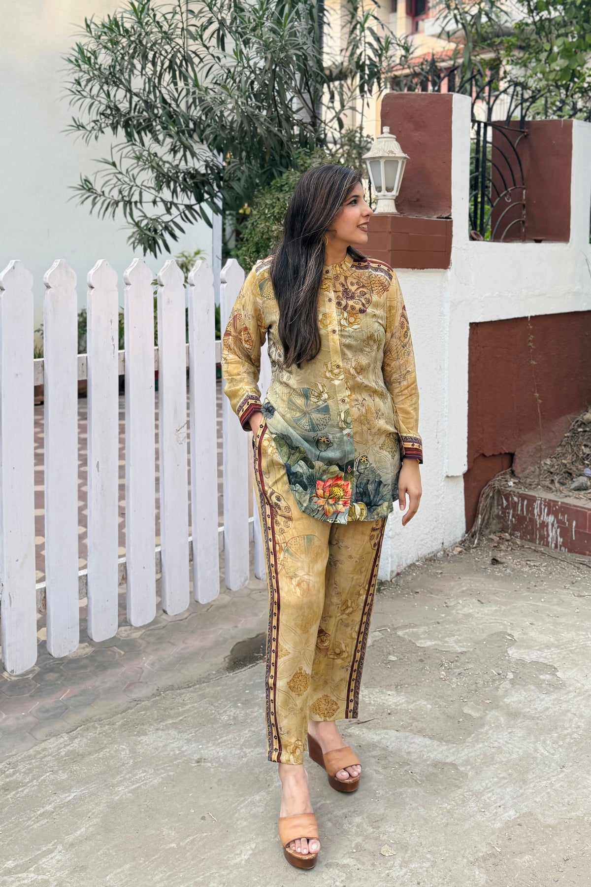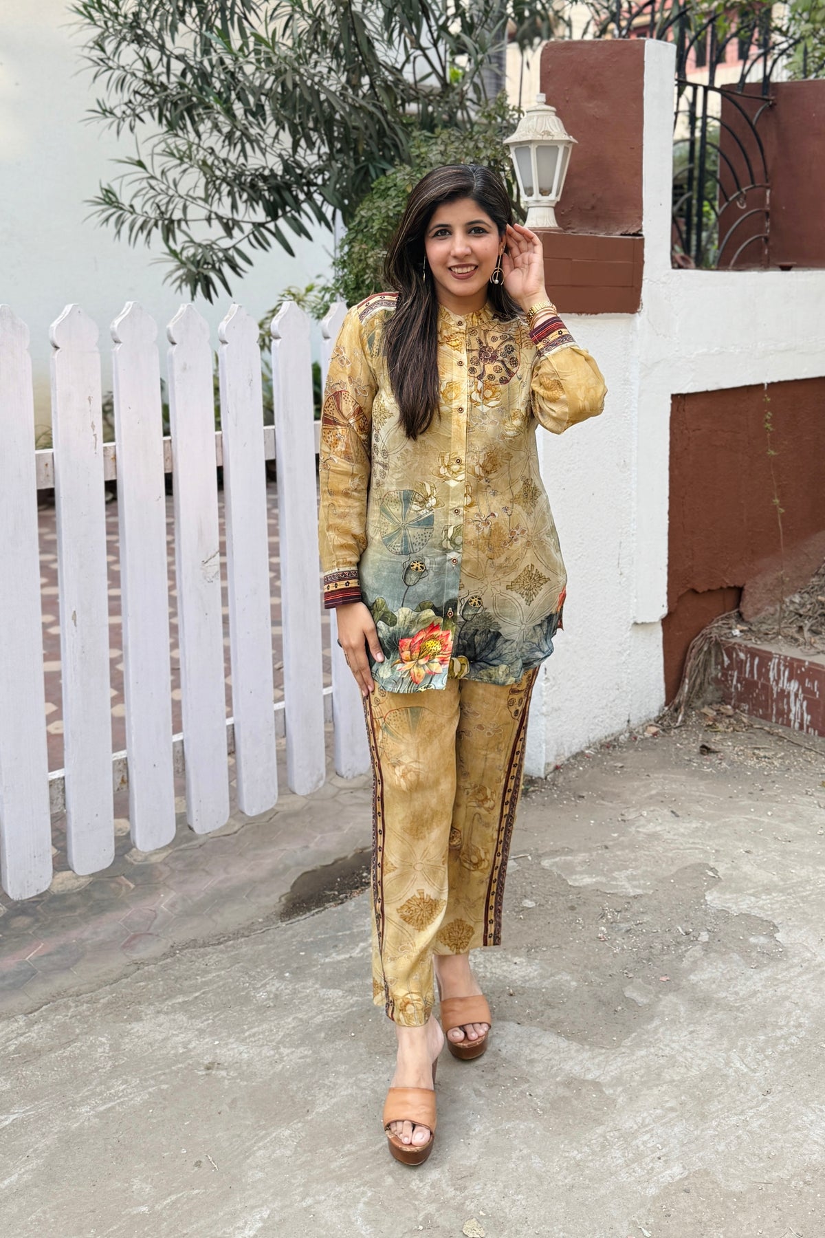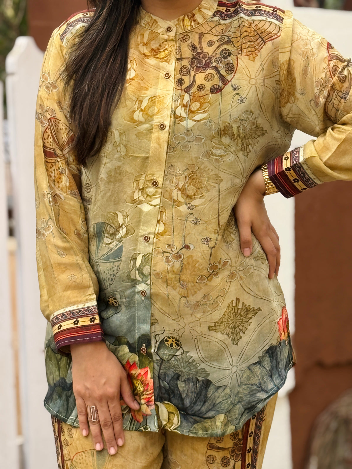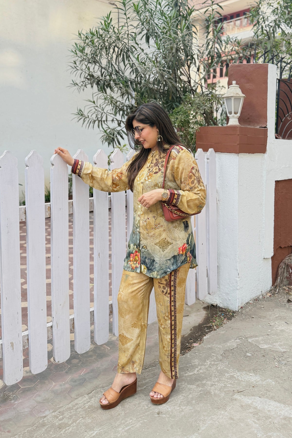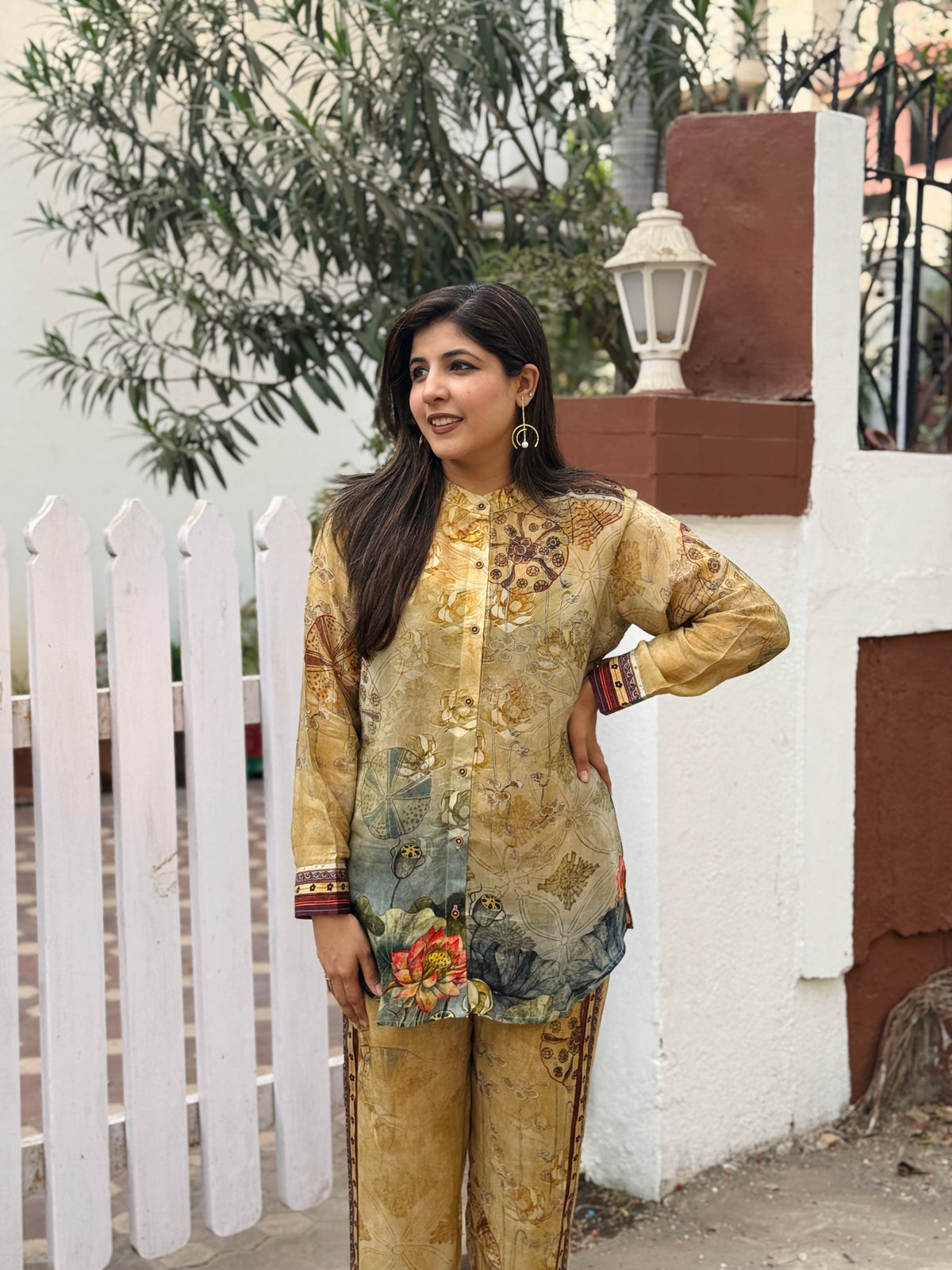 Check out our beautiful Viscose crepe co-ord set! Color in Yellow with Floral pretty print. It comes in Front Opening with Buttons. And it's Pant has Floral Prints and with a Pocket. It will make you look Comfort and Classy!