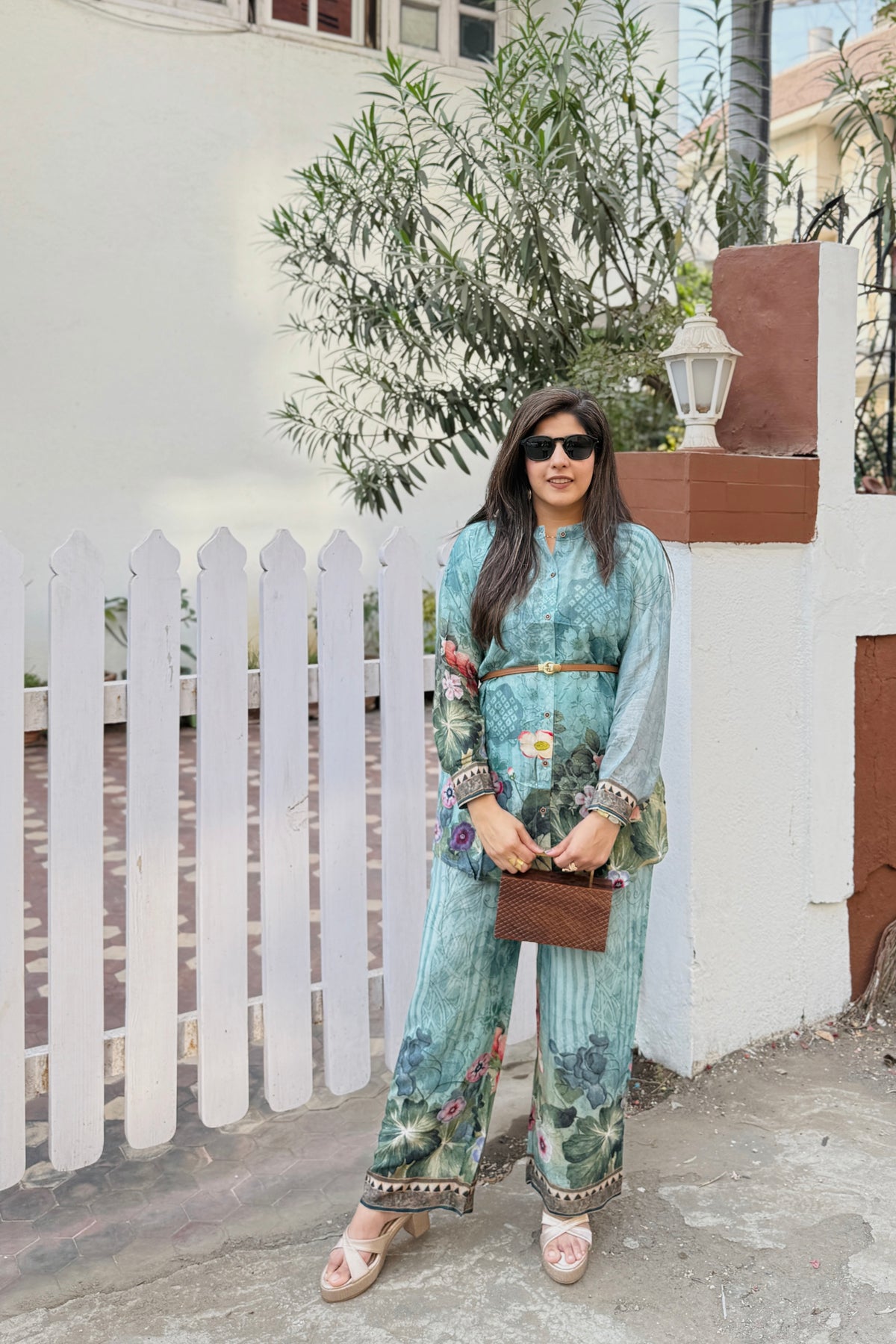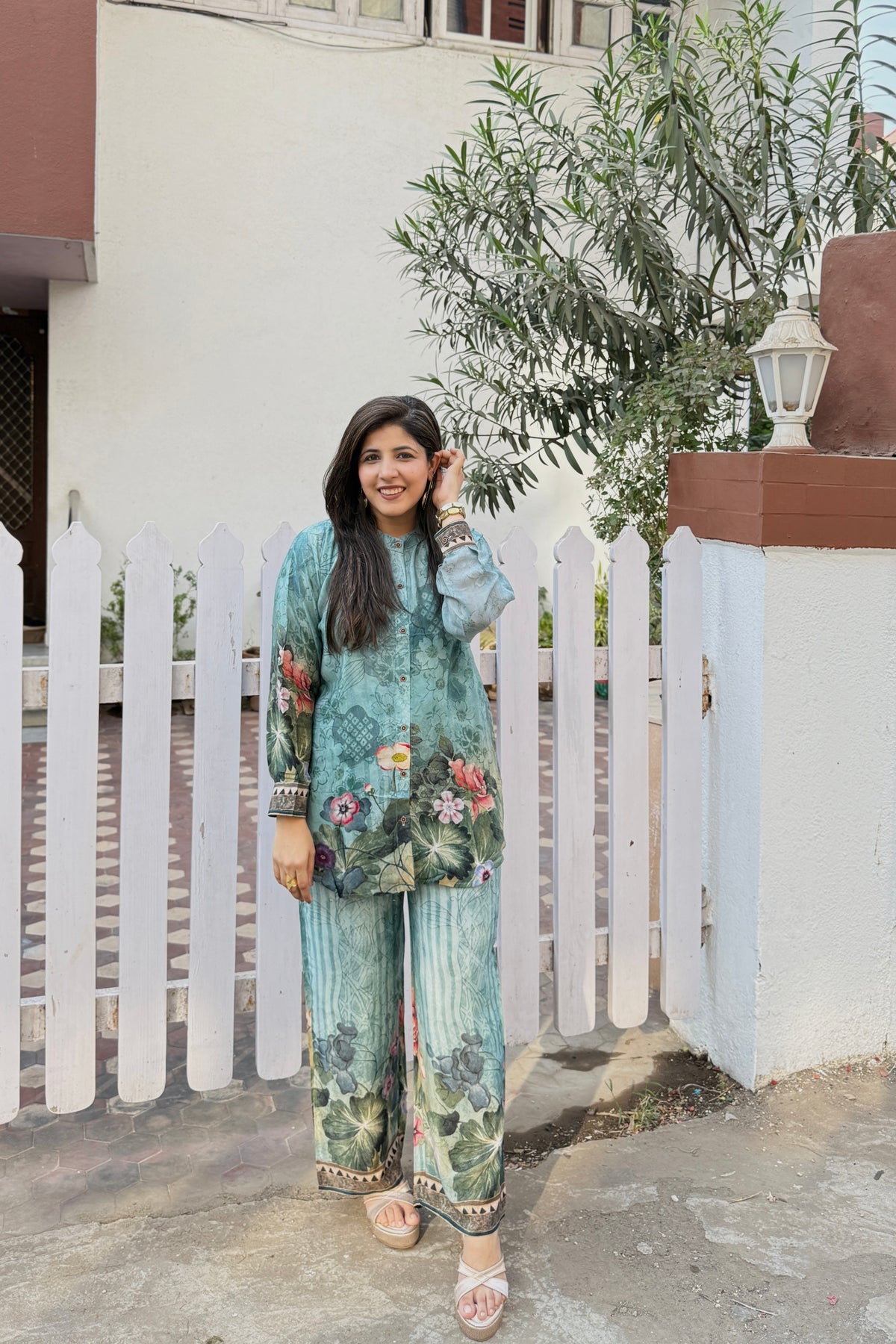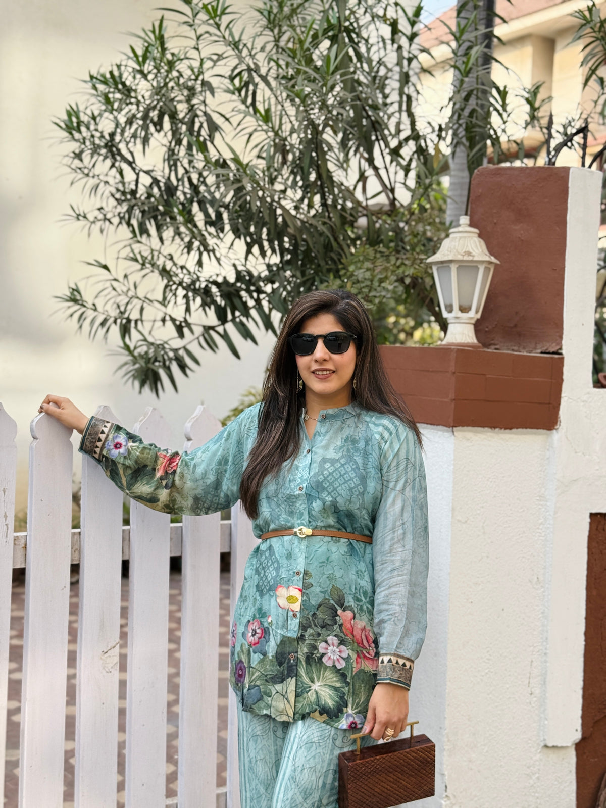 Check out our beautiful Viscose crepe co-ord set! Color in Sky Blue with Floral pretty print. It comes in Front Opening with Buttons. And it's Pant has Floral Prints and with a Pocket. It will make you look Comfort and Classy!