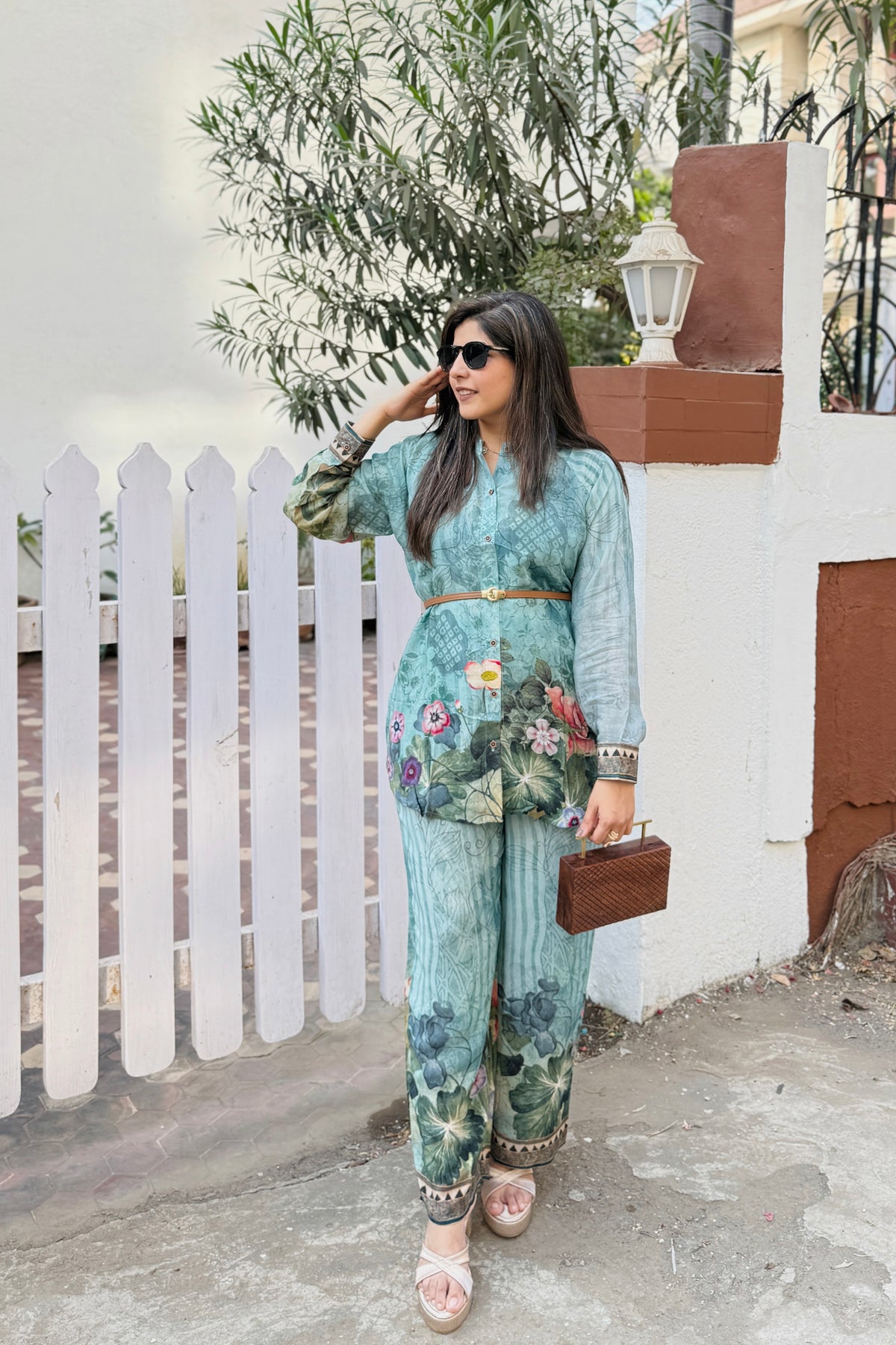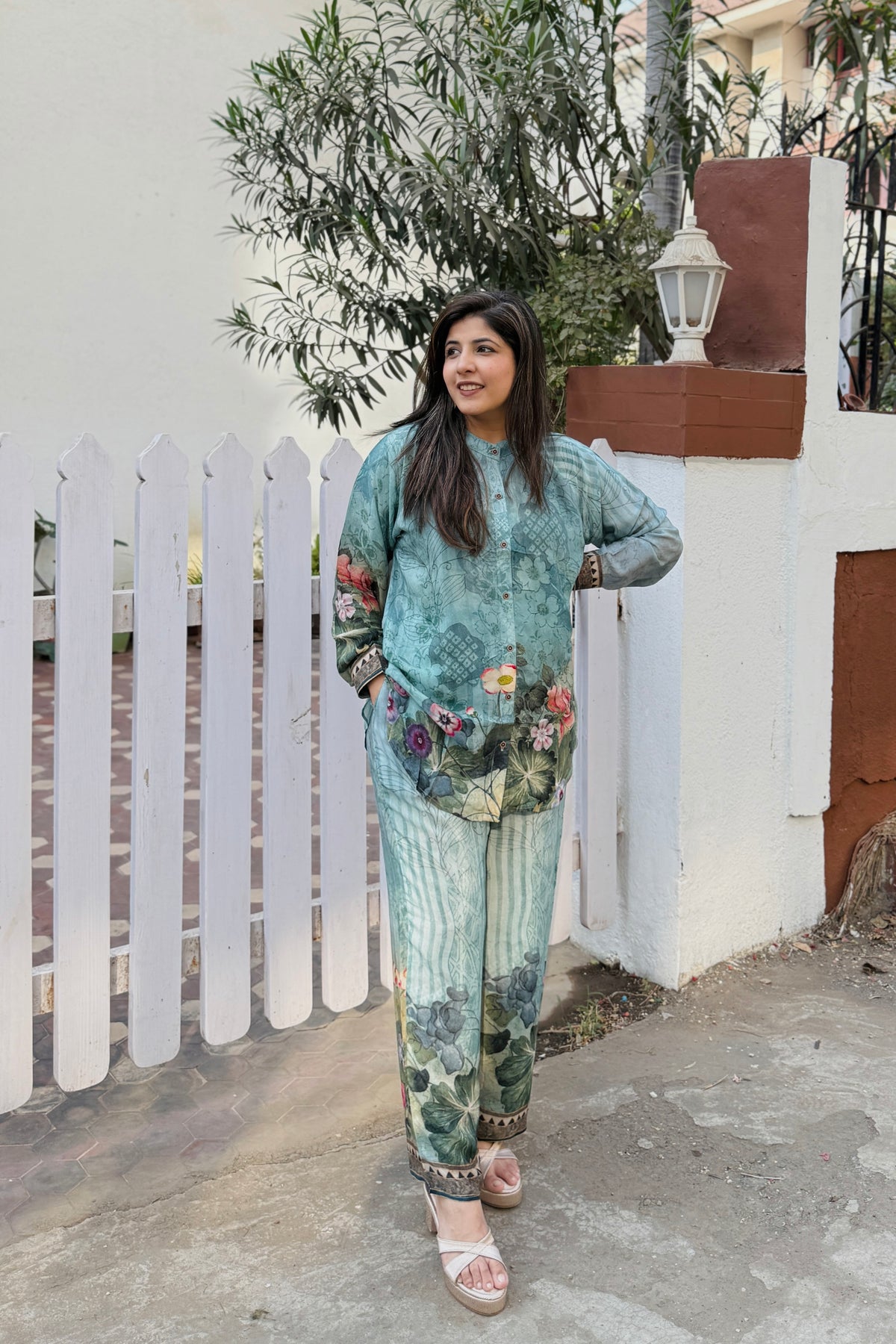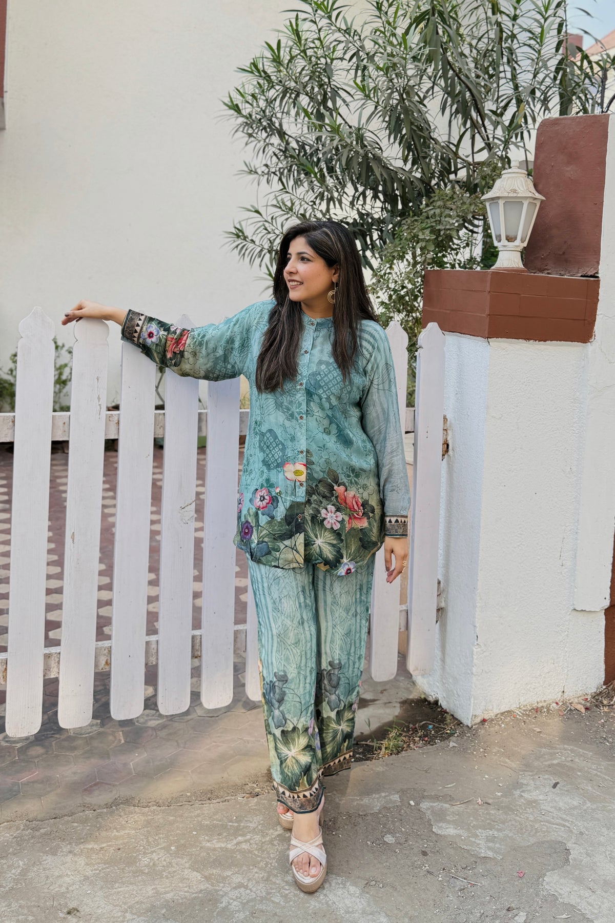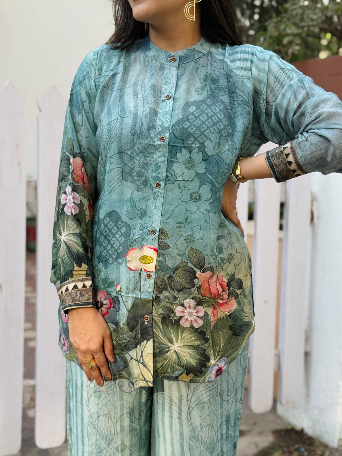 Check out our beautiful Viscose crepe co-ord set! Color in Sky Blue with Floral pretty print. It comes in Front Opening with Buttons. And it's Pant has Floral Prints and with a Pocket. It will make you look Comfort and Classy!