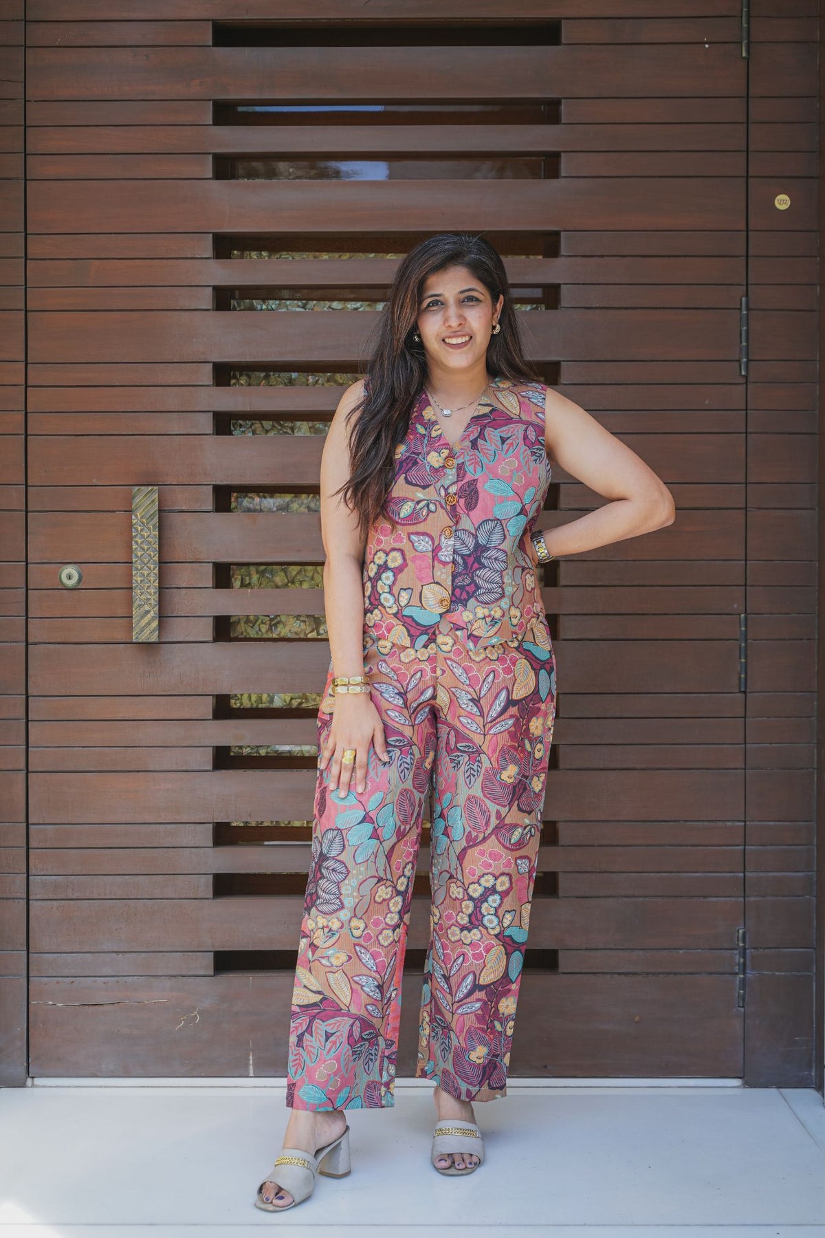 Make a statement with this vibrant printed co-ord set! The bold mix of floral and leaf patterns in earthy tones adds a fresh and artistic touch. Designed with a sleeveless V-neck top and comfy straight-fit pants, this set is both stylish and easy to wear. Perfect for a breezy, effortless look!