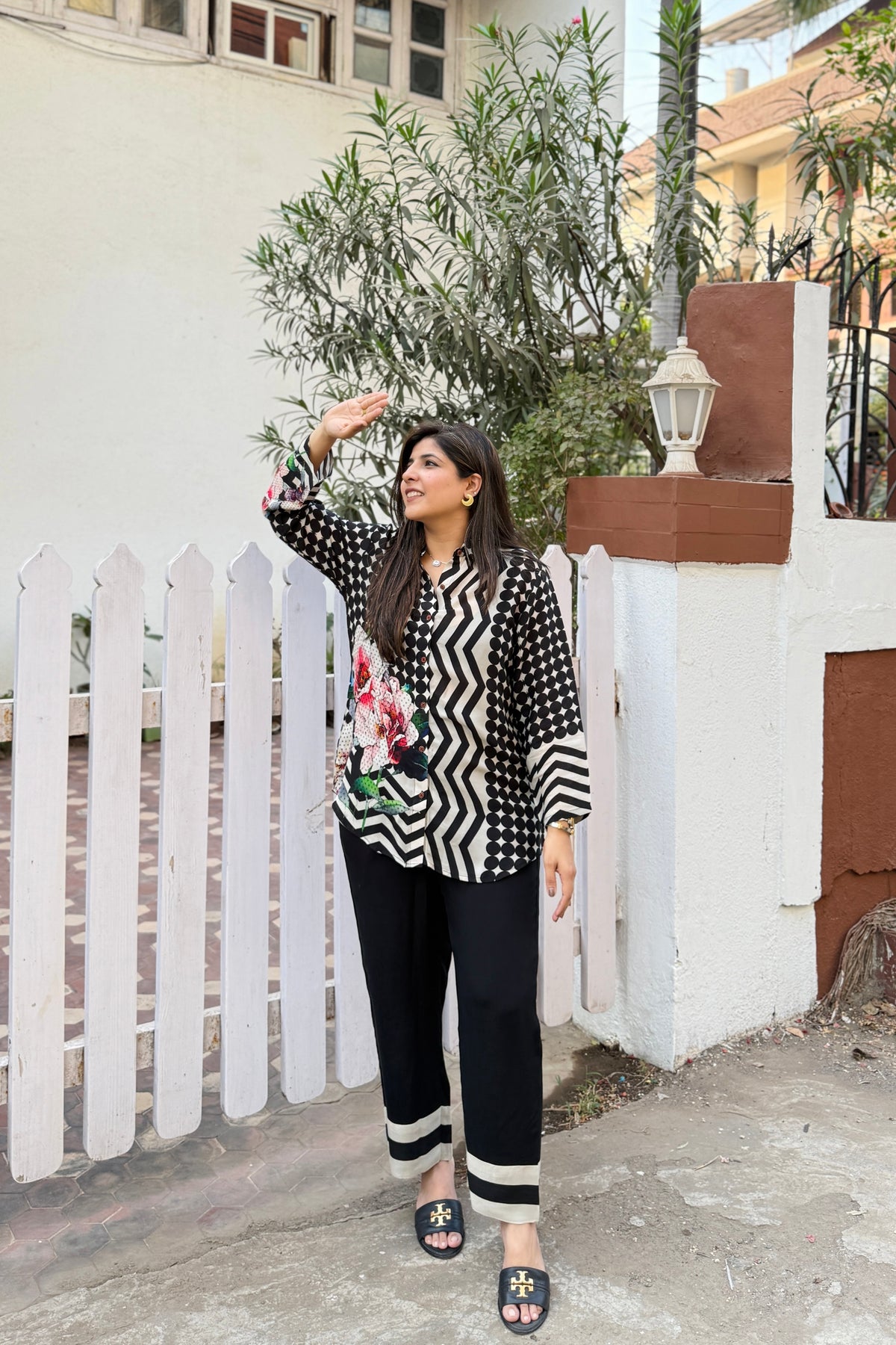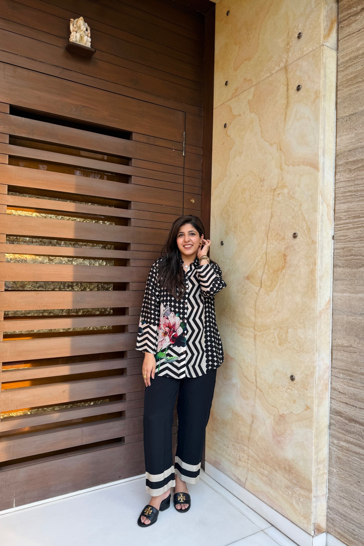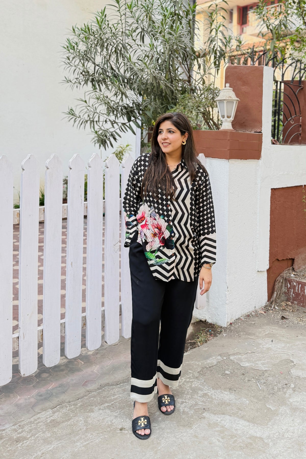 Check out our beautiful Viscose crepe co-ord set! Black Polka Dots with Floral print. Pants with a Pocket in Black with White Strips in Ankel. And it's all Look in Black and White color combition with unique print that will make you look great. Get ready with Comfort to grab attention without any effort!