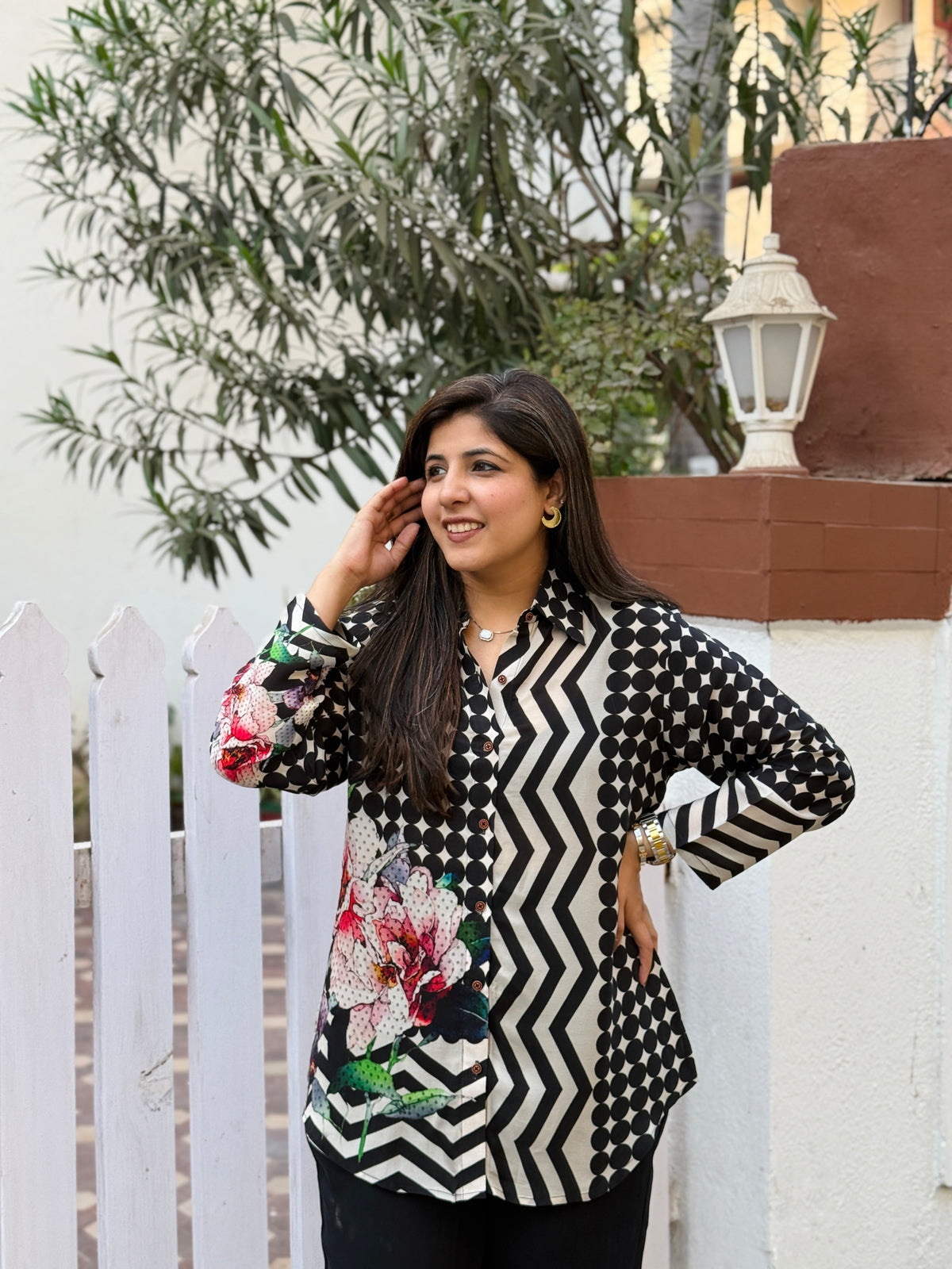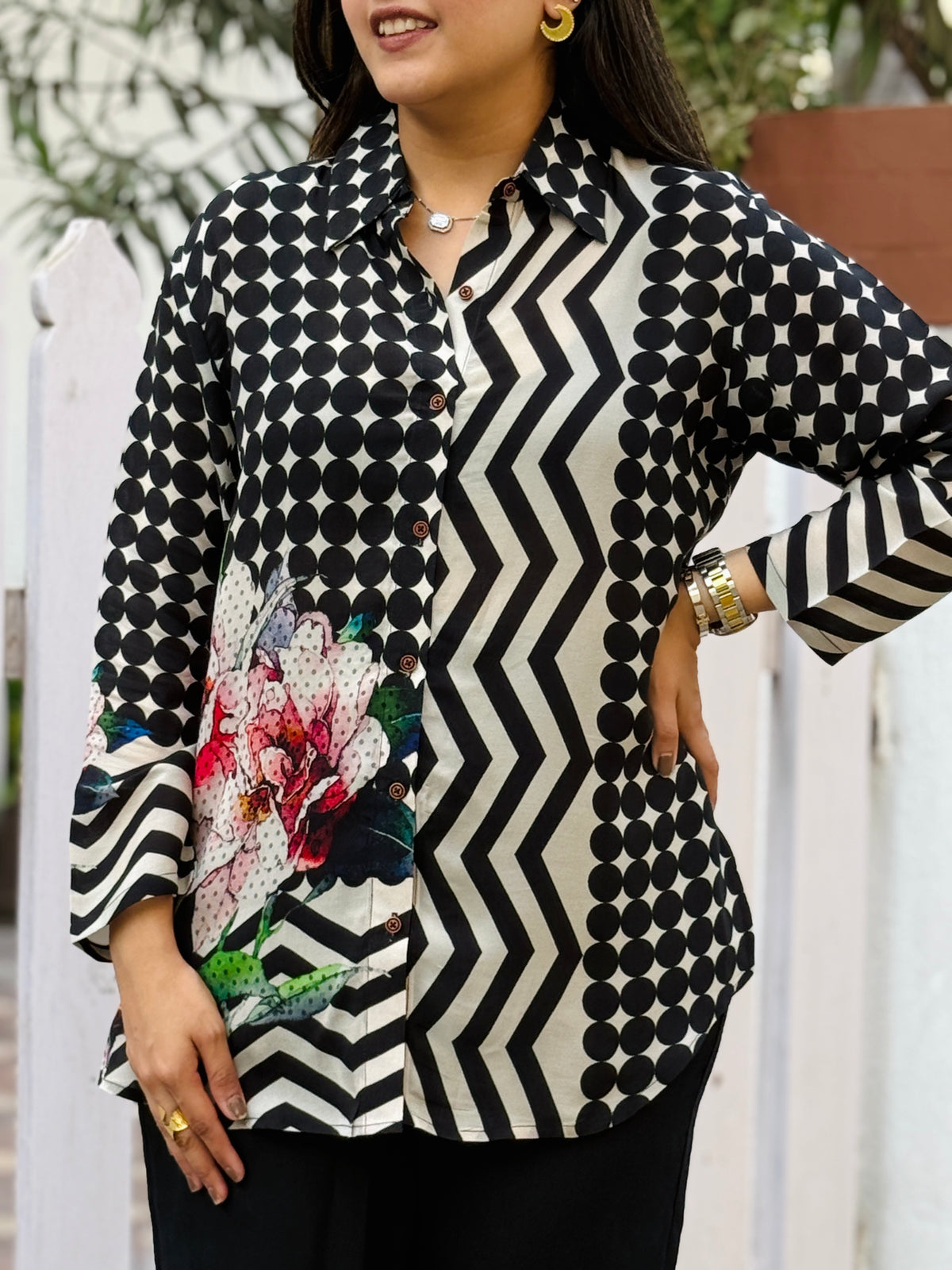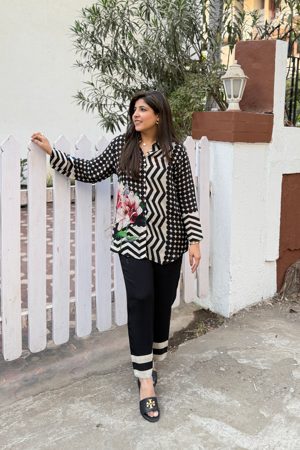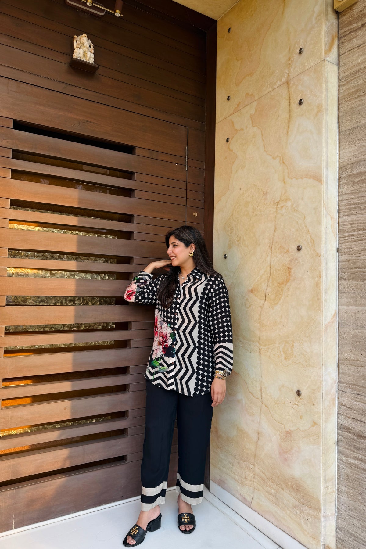 Check out our beautiful Viscose crepe co-ord set! Black Polka Dots with Floral print. Pants with a Pocket in Black with White Strips in Ankel. And it's all Look in Black and White color combition with unique print that will make you look great. Get ready with Comfort to grab attention without any effort!