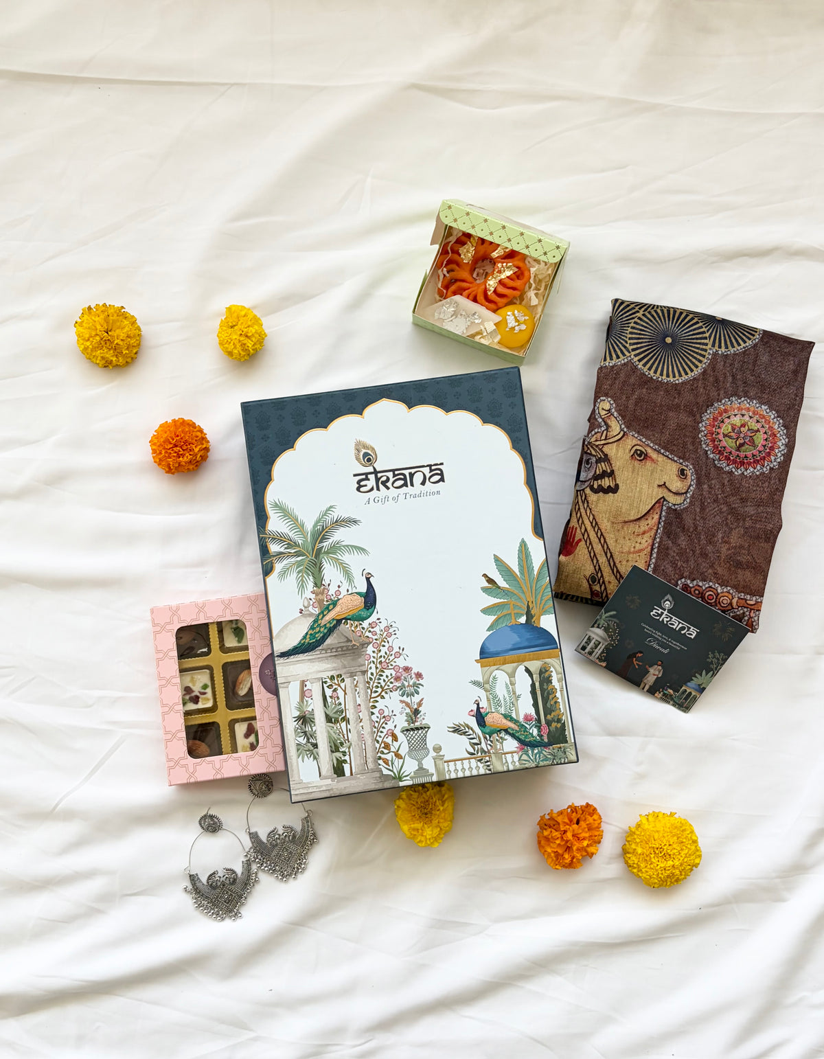 Celebrate the festival of lights with our Diwali Gift Hamper, featuring 3 mithai-shaped candles (peda, kaju katli & imarti) – ₹299, a Chocolate Box (₹199) with 6 chocolates filled with dry fruits and berries, a Cotton-Silk Dupatta (₹849), Handpicked Jewellery (₹299), and a Heartfelt Diwali Note, all beautifully packed in a Festive Gift Box (₹249) — a perfect blend of warmth, sweetness & elegance!