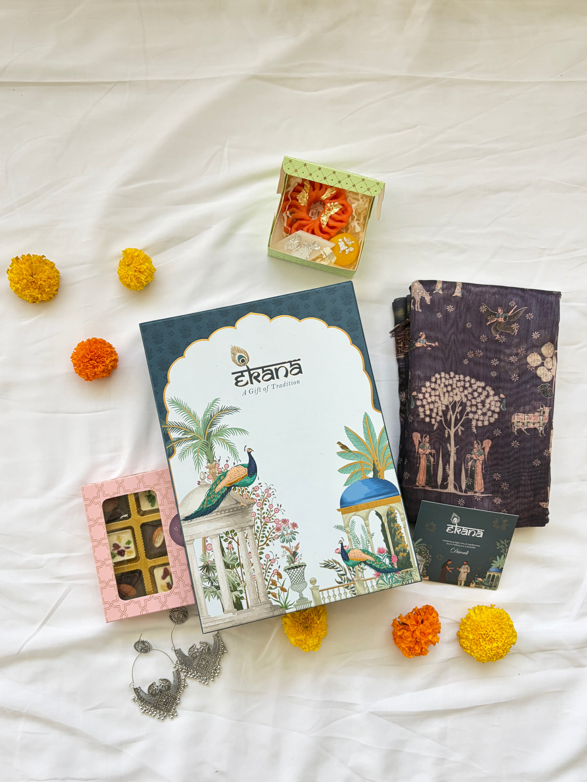 Celebrate the festival of lights with our Diwali Gift Hamper, featuring 3 mithai-shaped candles (peda, kaju katli & imarti) – ₹299, a Chocolate Box (₹199) with 6 chocolates filled with dry fruits and berries, a Cotton-Silk Dupatta (₹849), Handpicked Jewellery (₹299), and a Heartfelt Diwali Note, all beautifully packed in a Festive Gift Box (₹249) — a perfect blend of warmth, sweetness & elegance!
