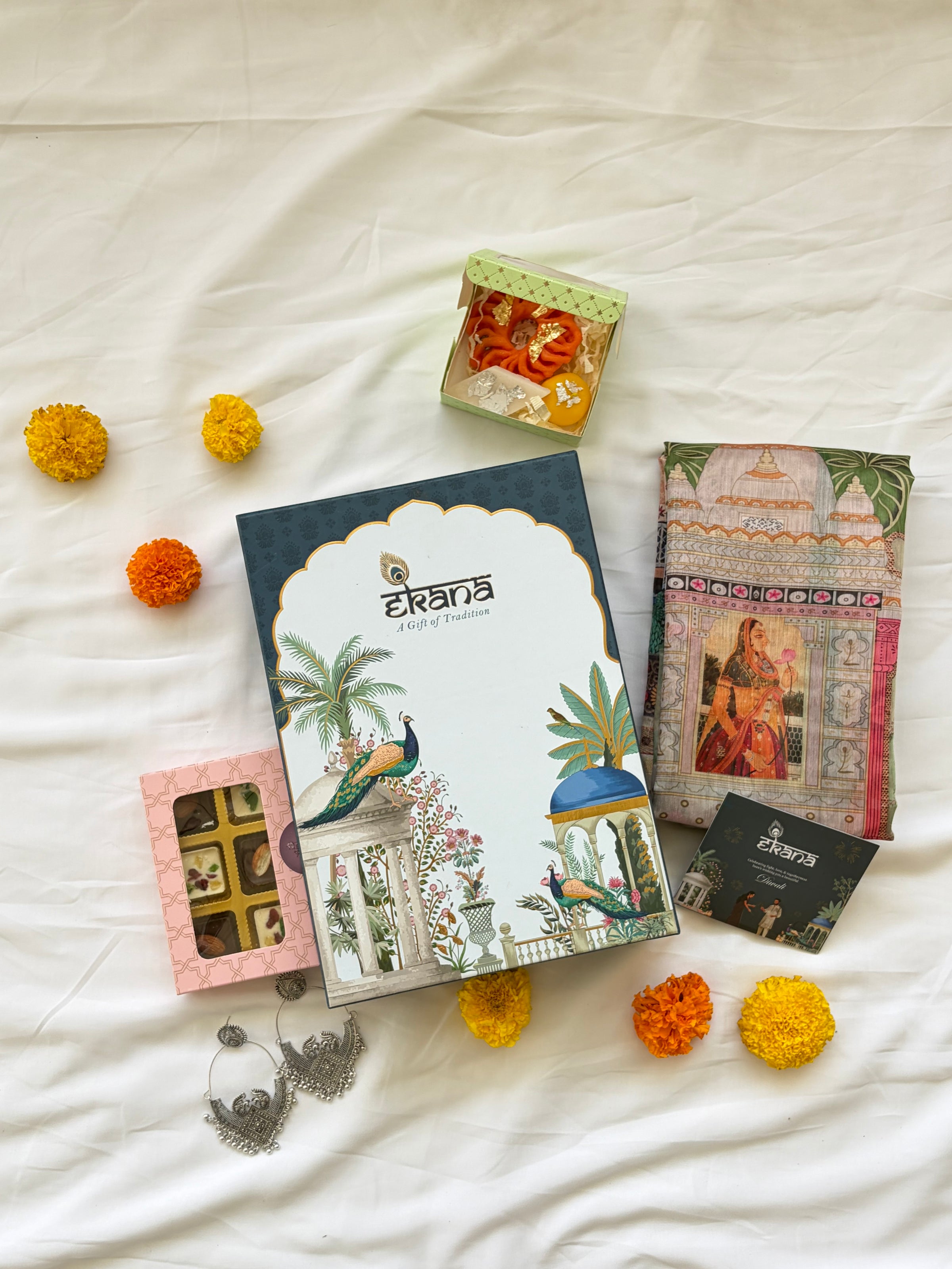 Celebrate the festival of lights with our Diwali Gift Hamper, featuring 3 mithai-shaped candles (peda, kaju katli & imarti) – ₹299, a Chocolate Box (₹199) with 6 chocolates filled with dry fruits and berries, a Cotton-Silk Dupatta (₹849), Handpicked Jewellery (₹299), and a Heartfelt Diwali Note, all beautifully packed in a Festive Gift Box (₹249) — a perfect blend of warmth, sweetness & elegance!