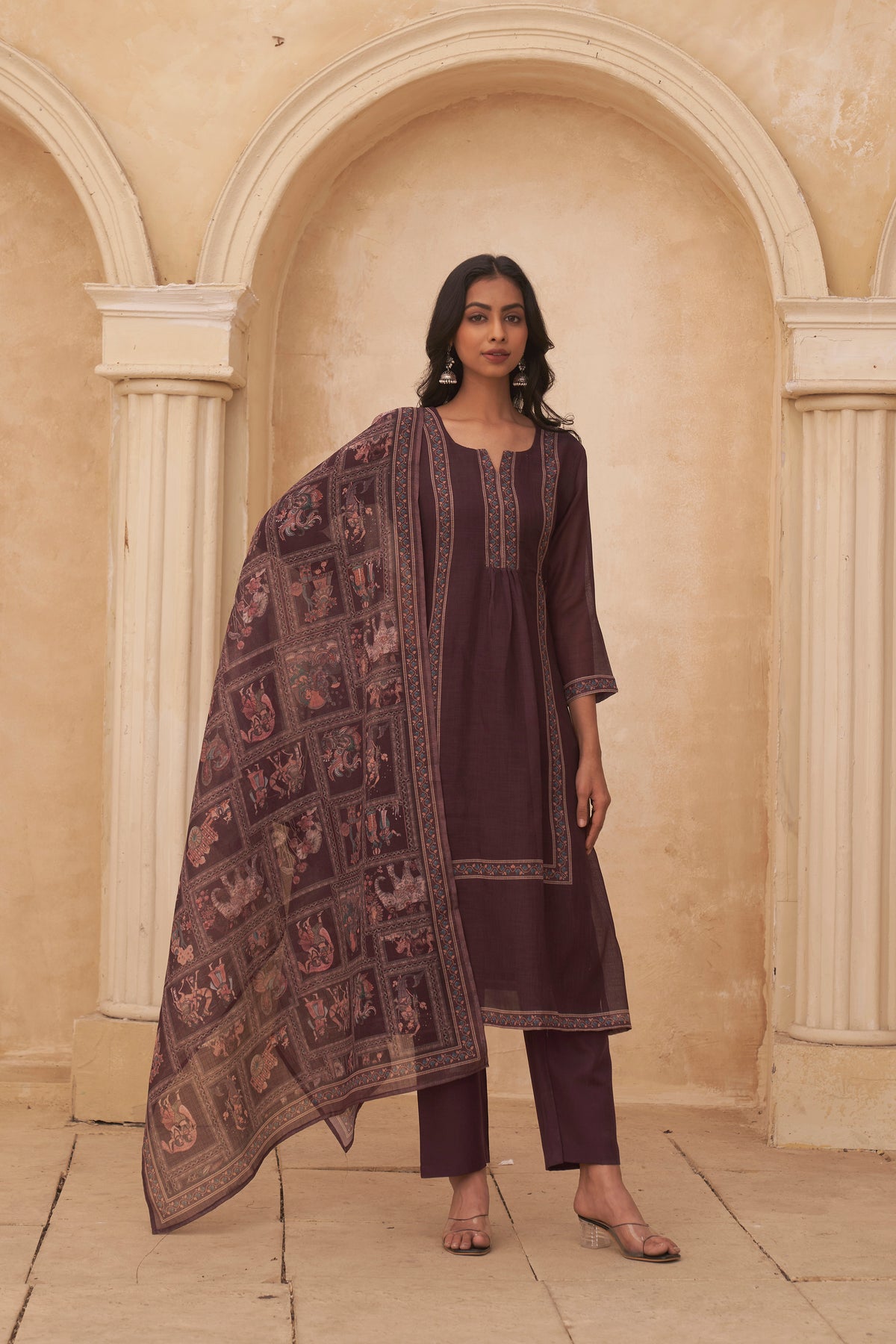 This dupatta features exquisite traditional artwork with detailed figurative and animal motifs in a classic block layout. The rich plum hue adds a regal touch, making it perfect for cultural gatherings or festive celebrations. A piece that beautifully blends heritage with style.