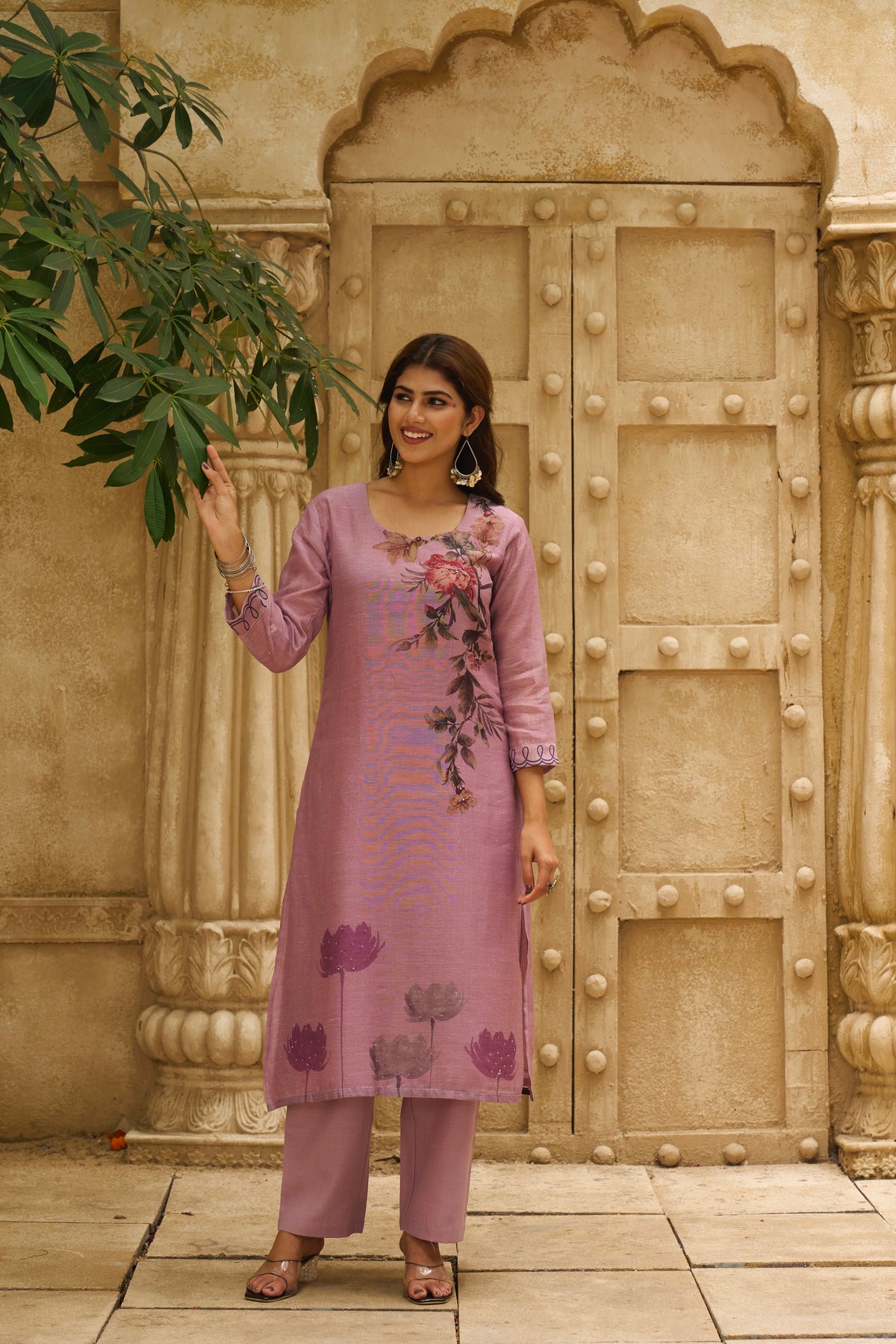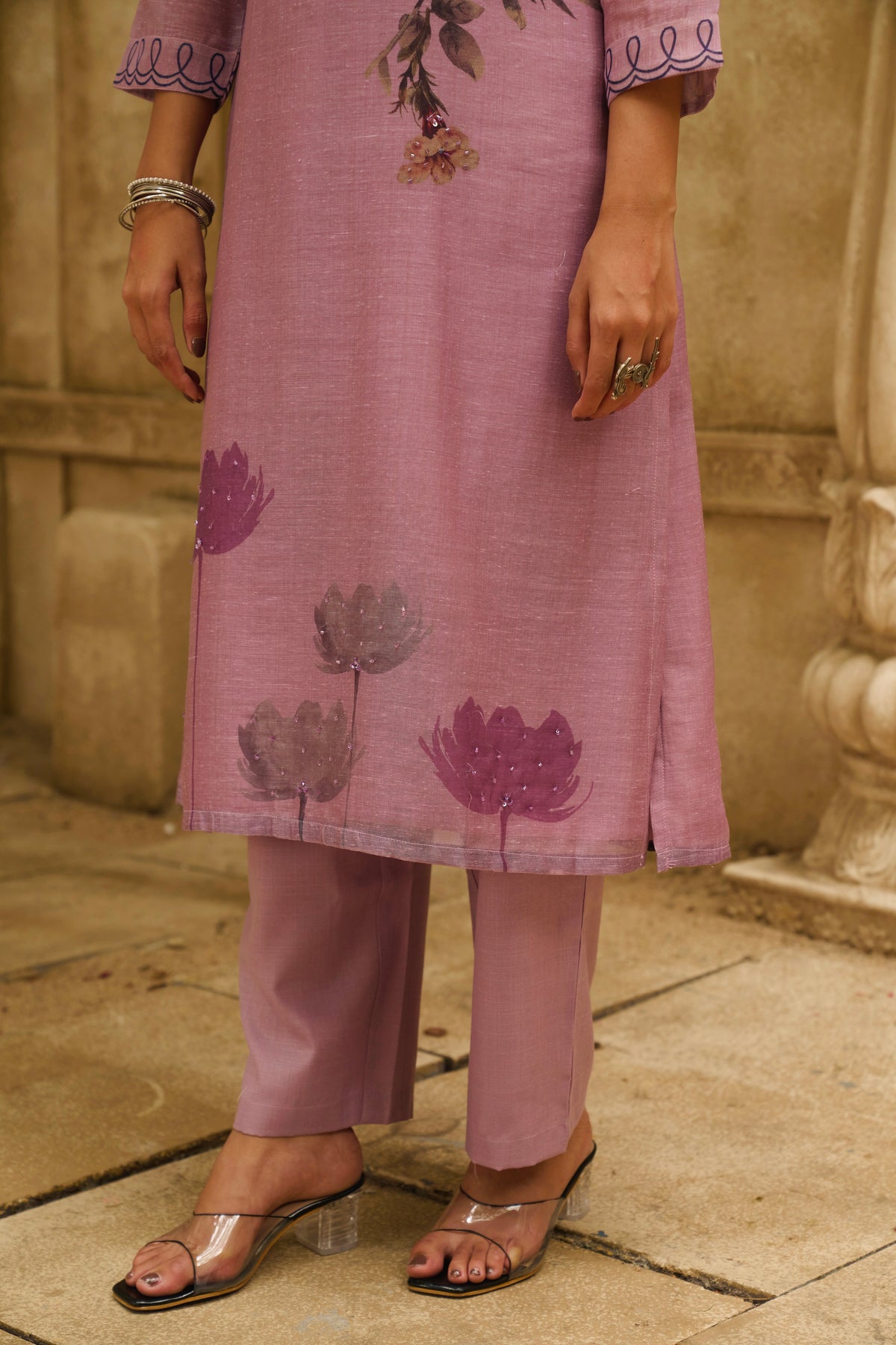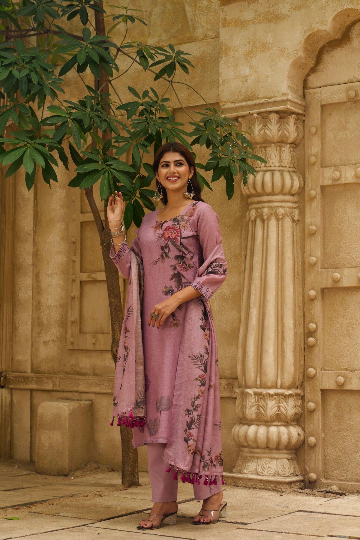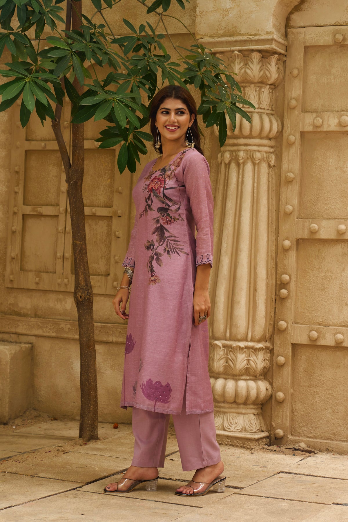 Soft and serene, this lavender suit set in handwork Chanderi weave is elegance in motion. The floral tassel dupatta adds a delicate charm, while cotton slub pants and a mul-lining ensure comfort throughout the day. A perfect choice for daytime festivities or refined celebrations.