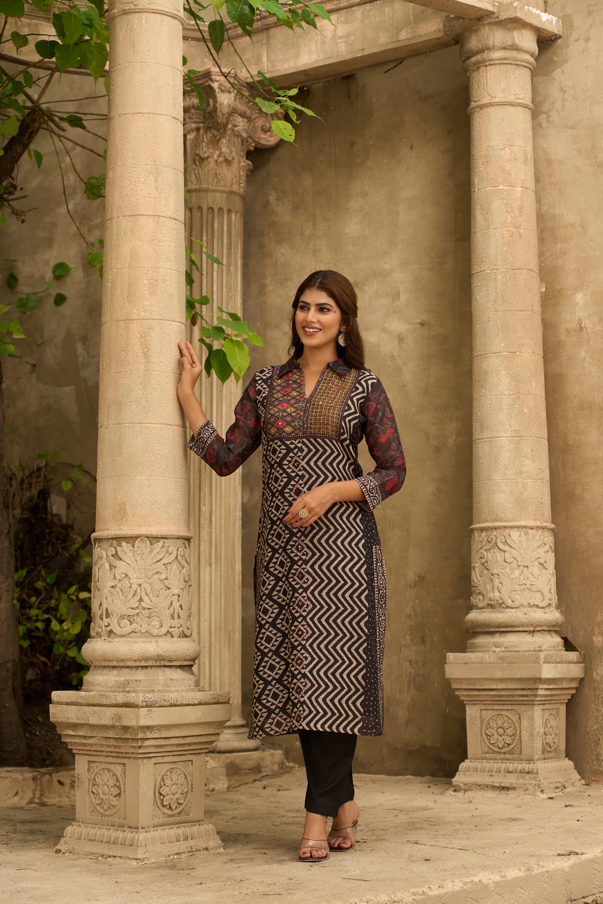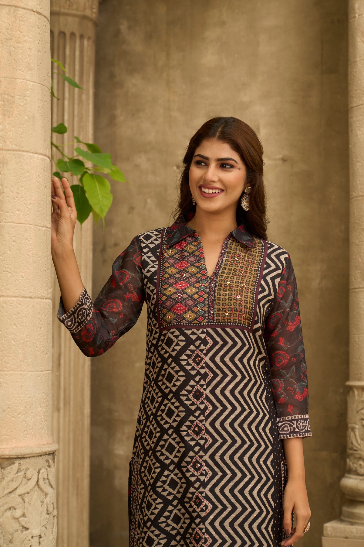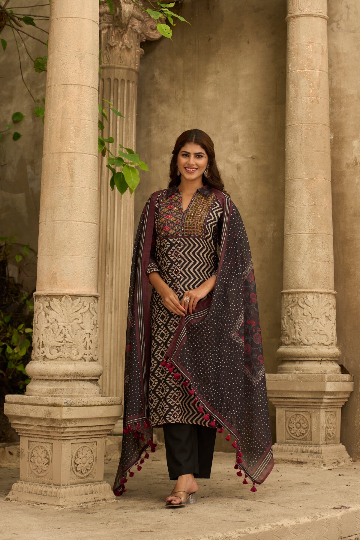 A seamless blend of tradition and modernity, this black and ivory cotton suit set features bold chevron prints paired with intricate ethnic motifs on the yoke. The contrasting printed dupatta, detailed with florals, fine dots, and tassel edging, adds a touch of festive drama. Perfect for casual celebrations or statement daytime looks, this set stands out with its refined craftsmanship and contemporary aesthetic.