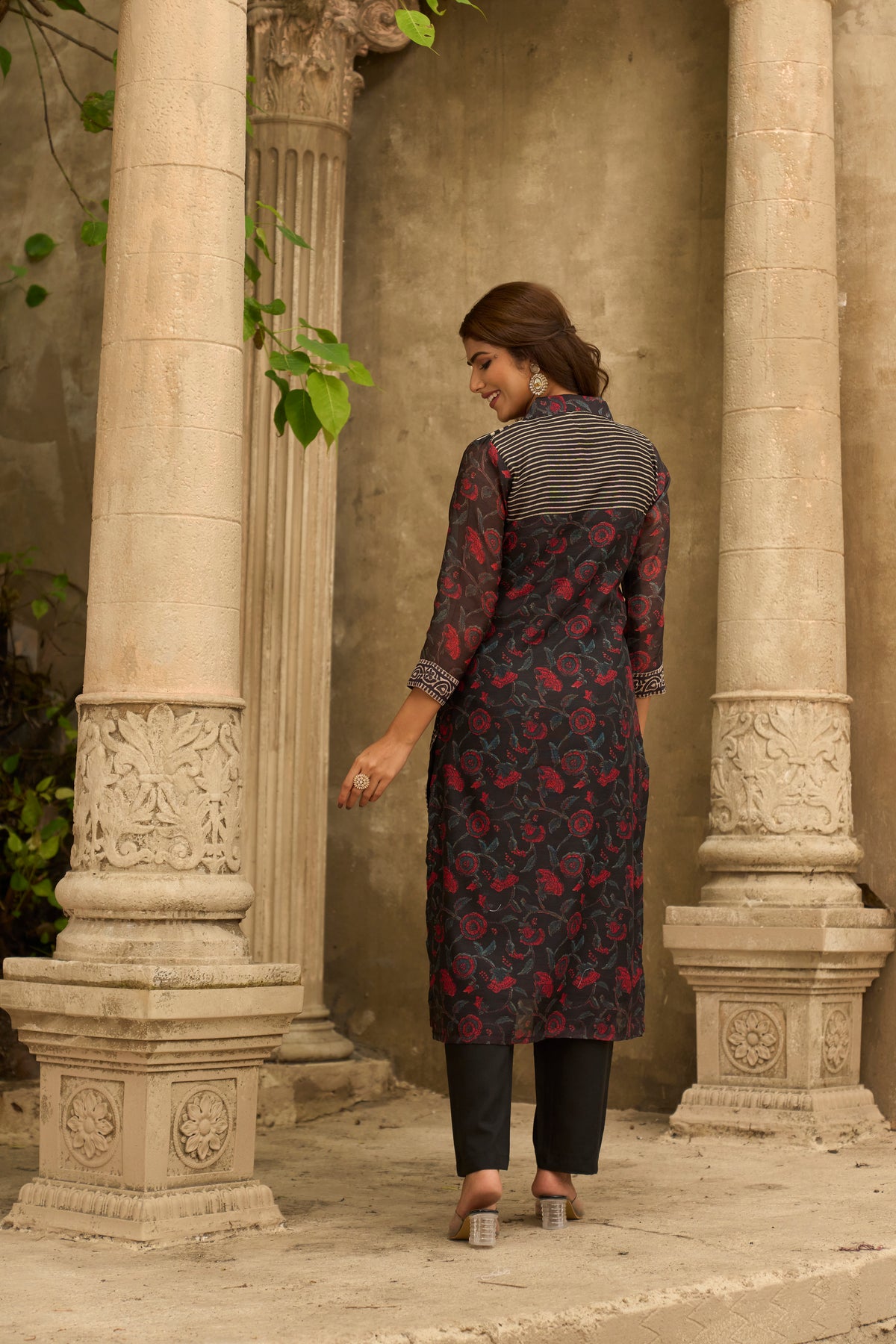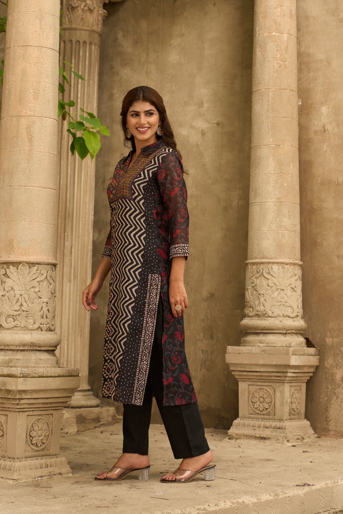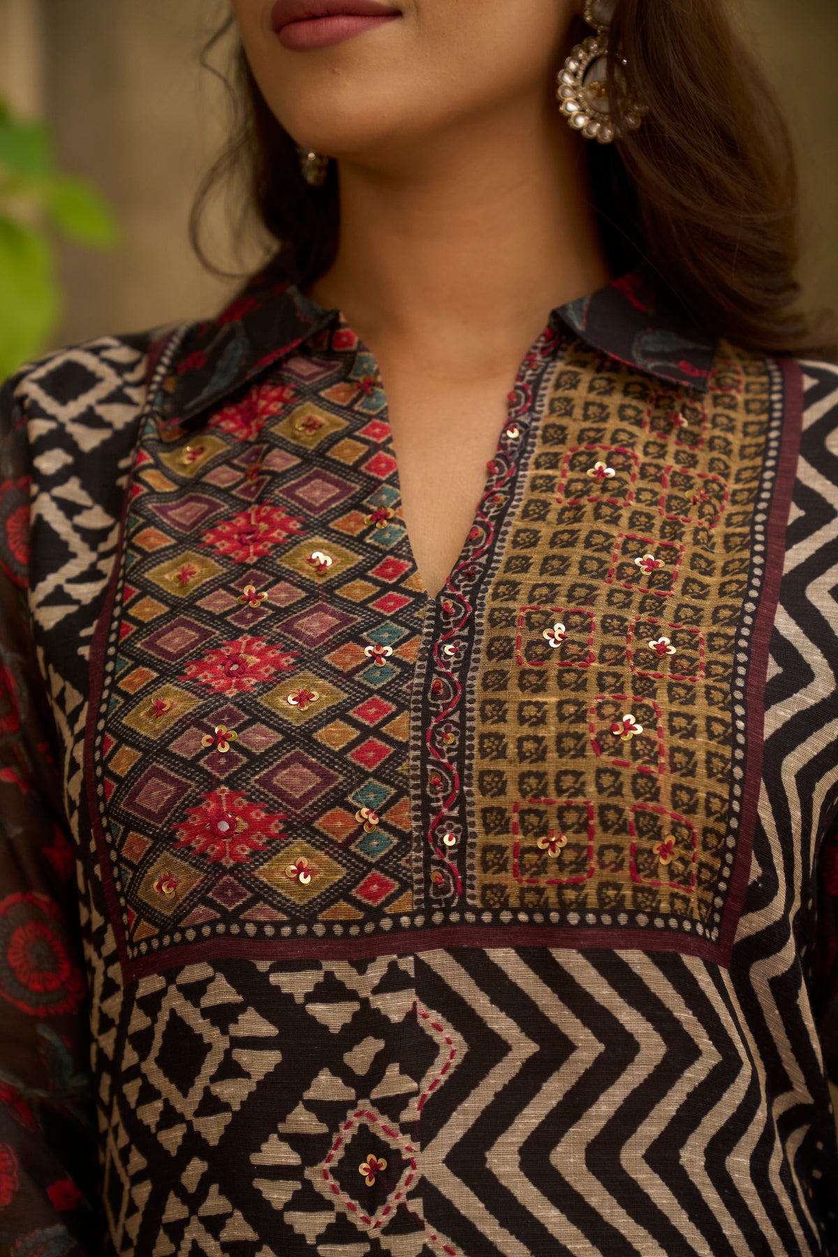 A seamless blend of tradition and modernity, this black and ivory cotton suit set features bold chevron prints paired with intricate ethnic motifs on the yoke. The contrasting printed dupatta, detailed with florals, fine dots, and tassel edging, adds a touch of festive drama. Perfect for casual celebrations or statement daytime looks, this set stands out with its refined craftsmanship and contemporary aesthetic.