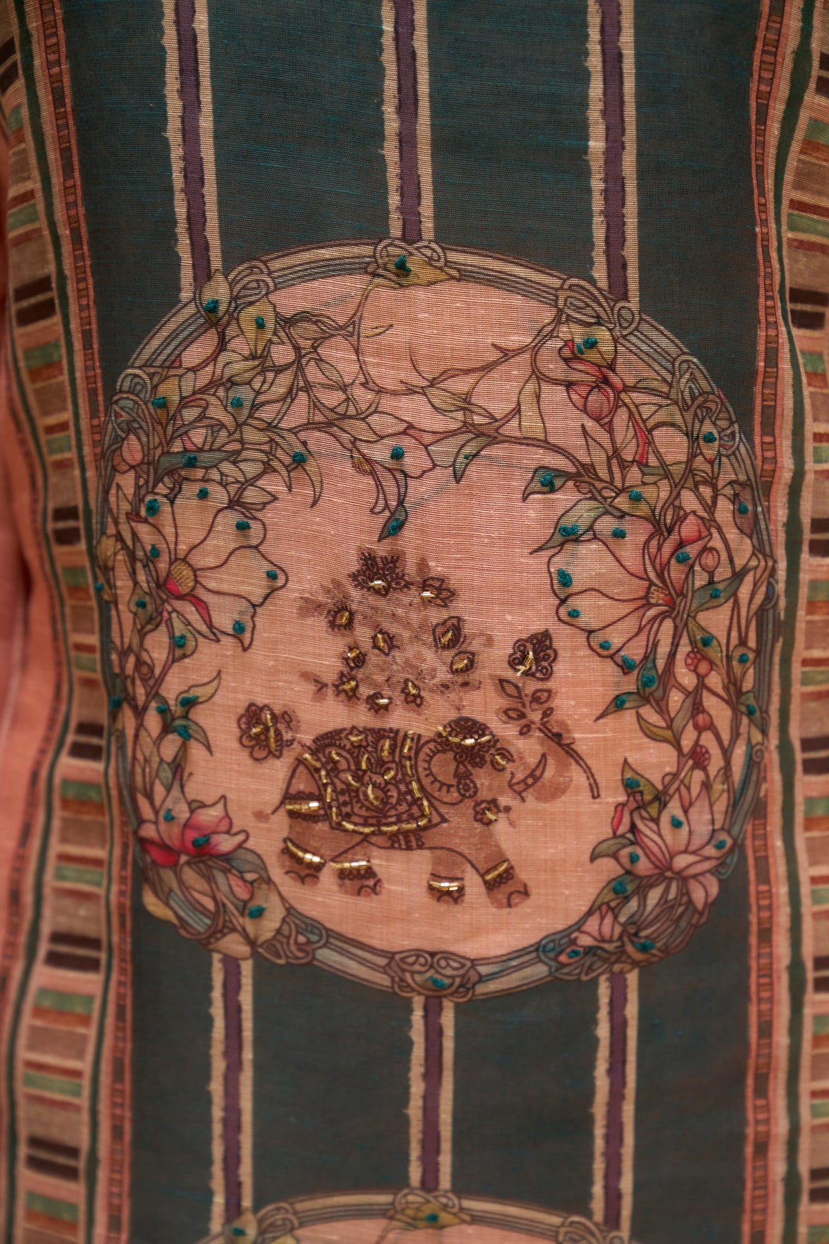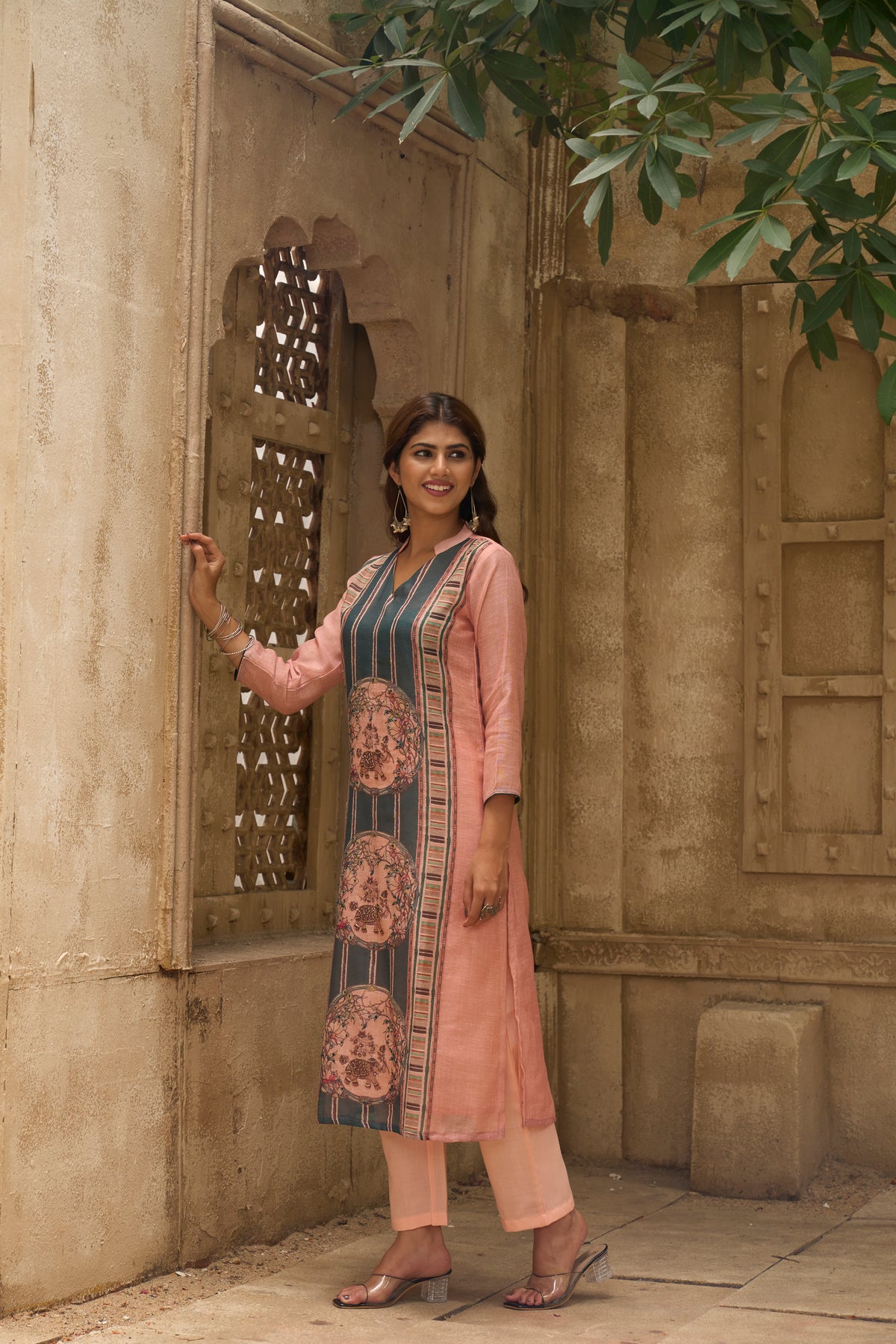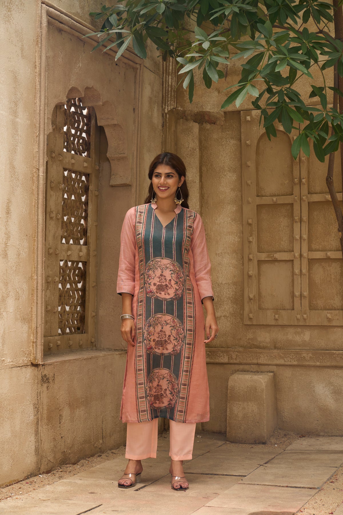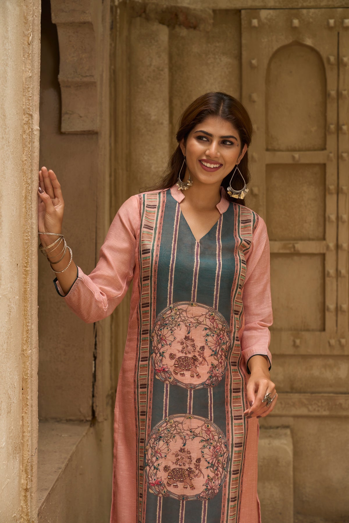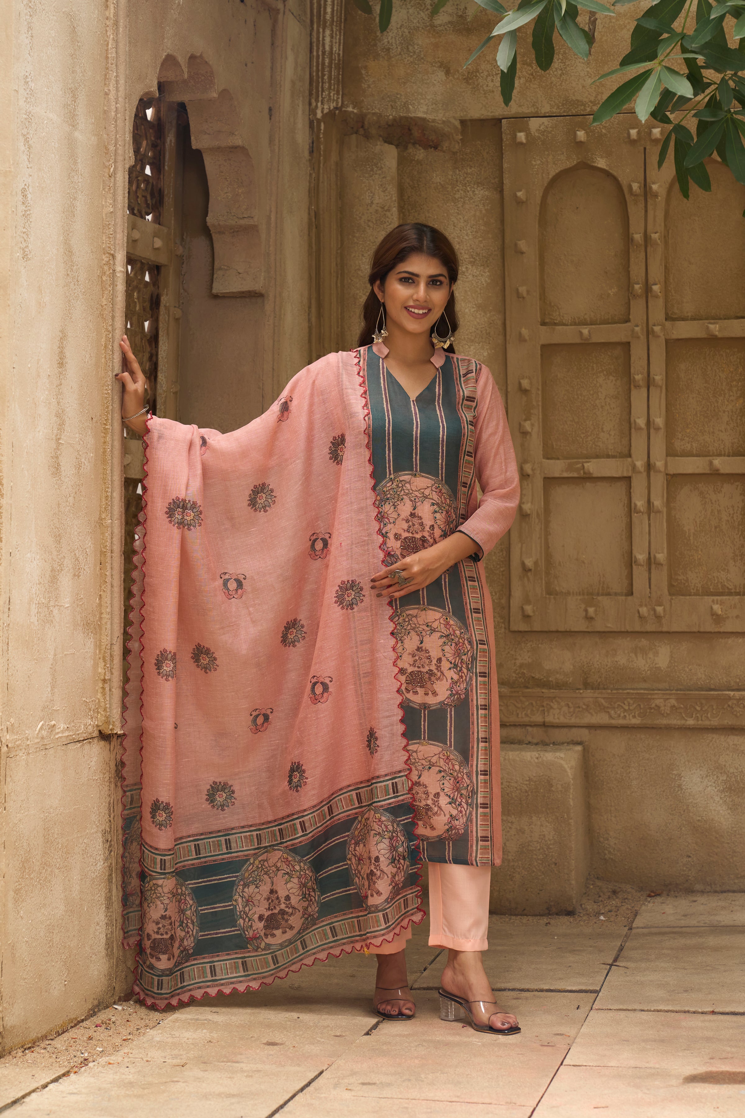 A delicate handwork kurta paired with a beautiful dupatta in soft blush tones. The floral motifs and striped details bring a perfect balance of elegance and tradition, making this suit set an ideal pick for festive occasions or daytime celebrations. Graceful, lightweight, and timeless — a piece that defines understated charm.