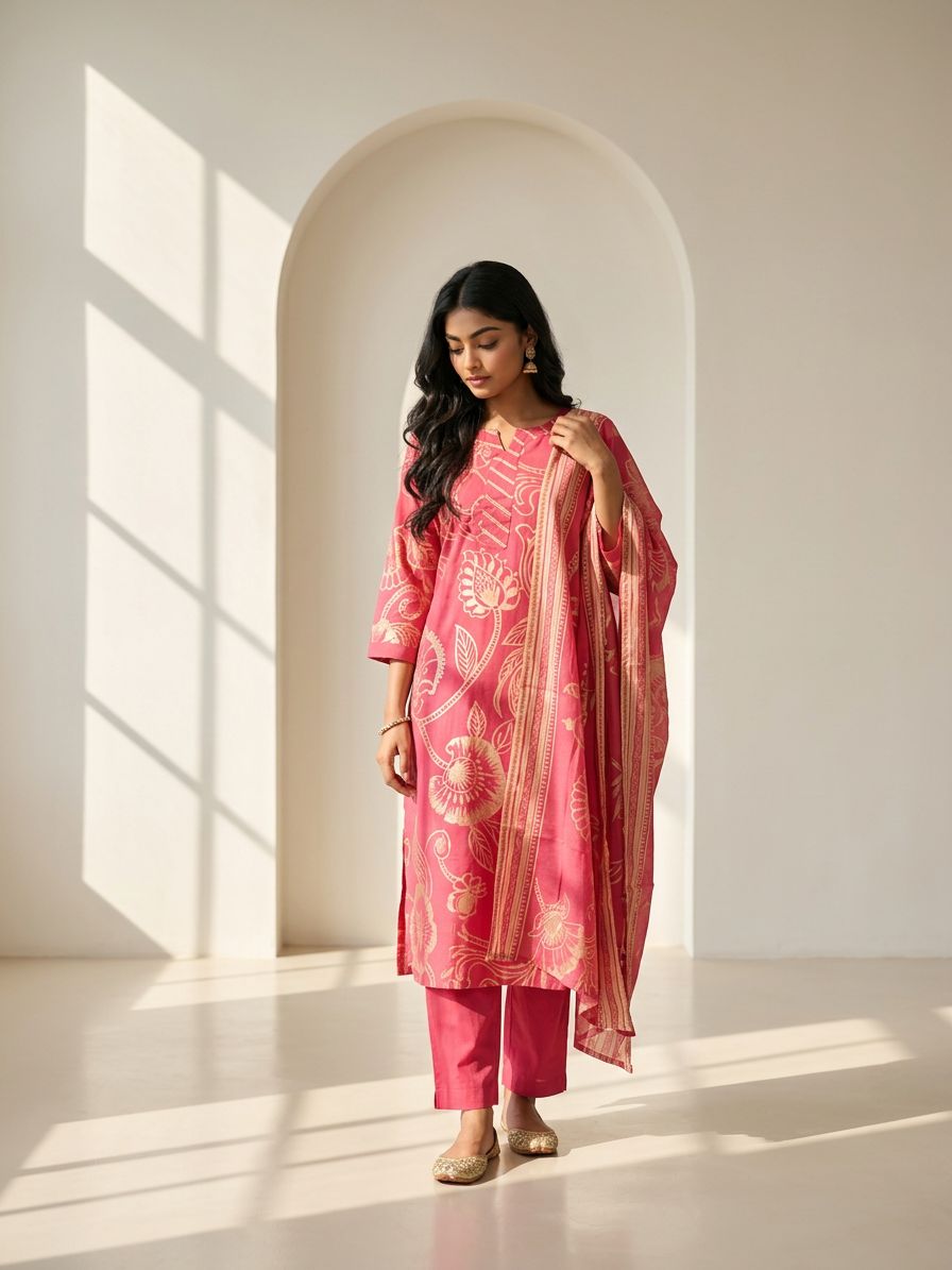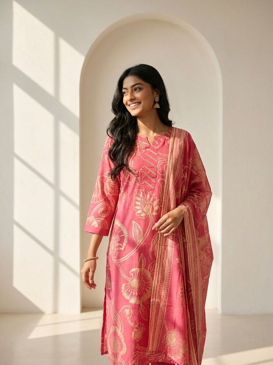 Bright floral prints flow beautifully across the outfit, giving it a lively and graceful look.