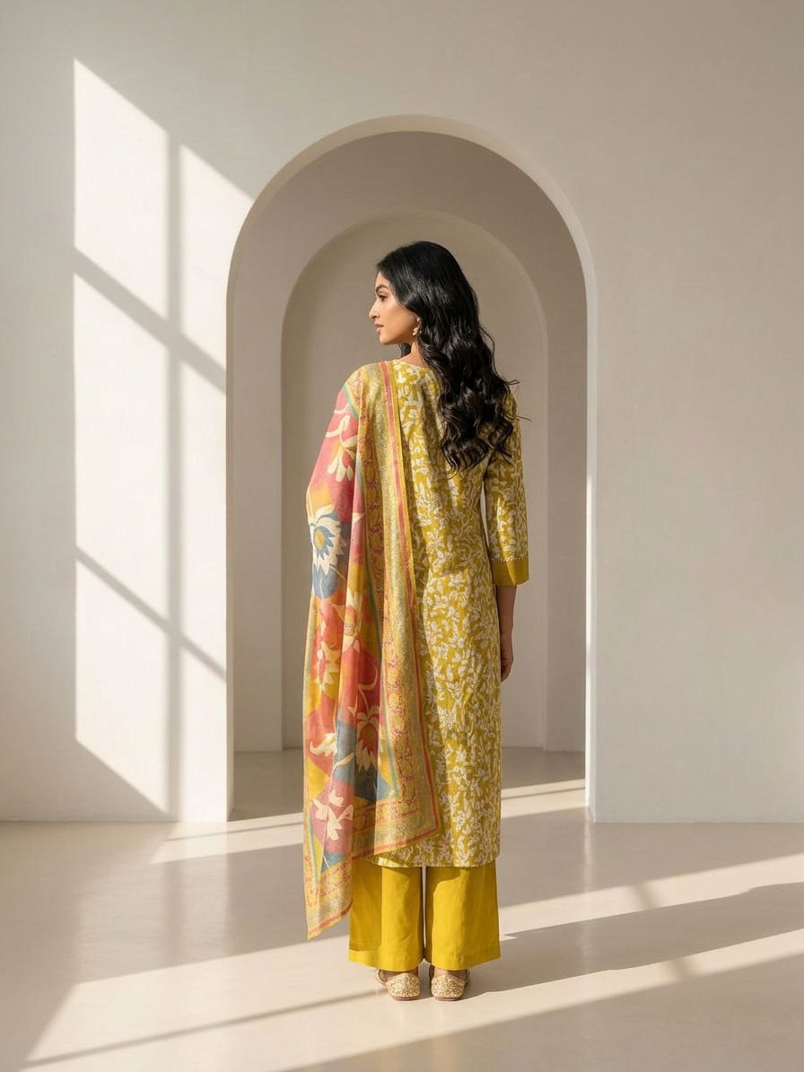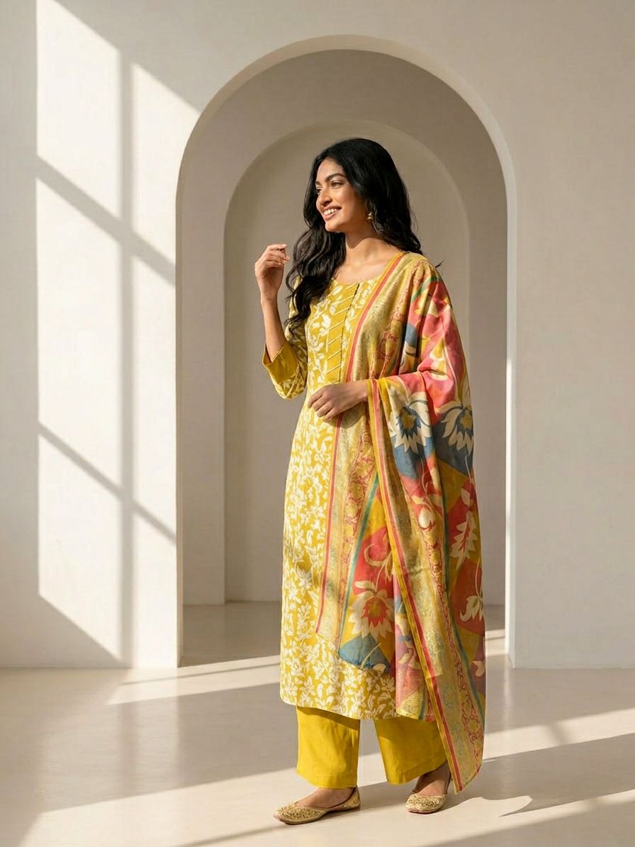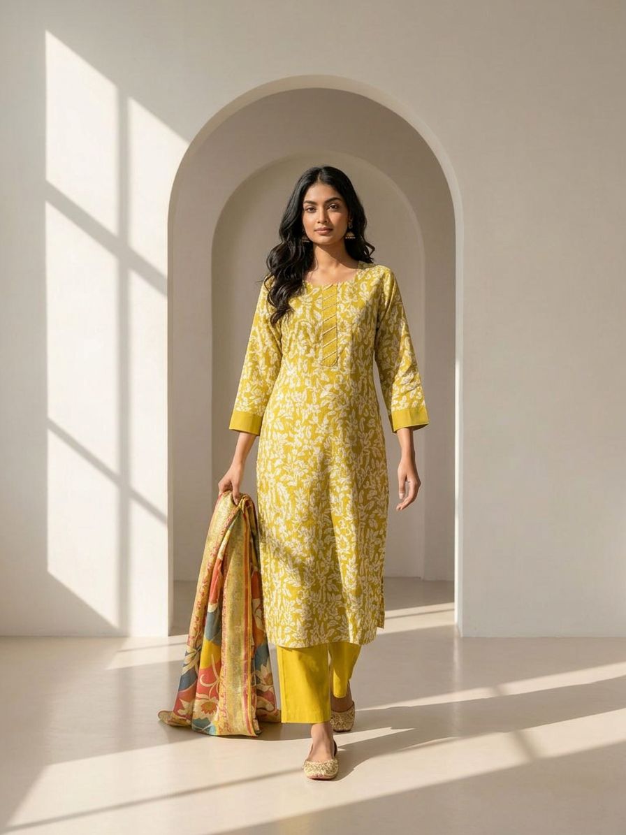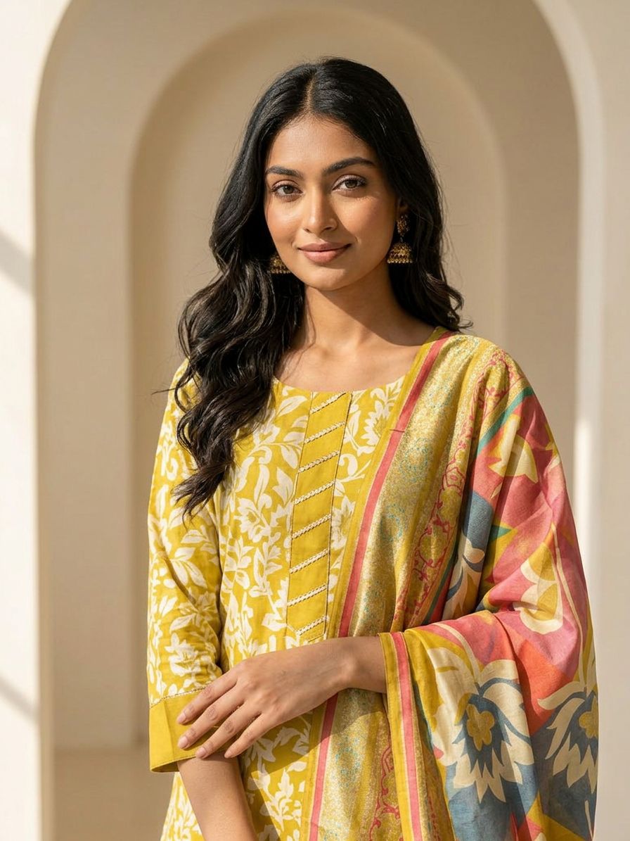 A bright yellow suit set featuring elegant white floral prints all over the kurta. The beautiful leafy and flower patterns give the outfit a fresh and graceful look. It comes with a colourful dupatta with bold floral designs and a decorative border. Perfect for a vibrant and stylish everyday ethnic look.