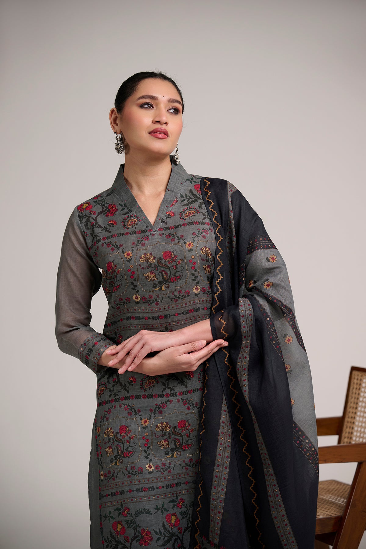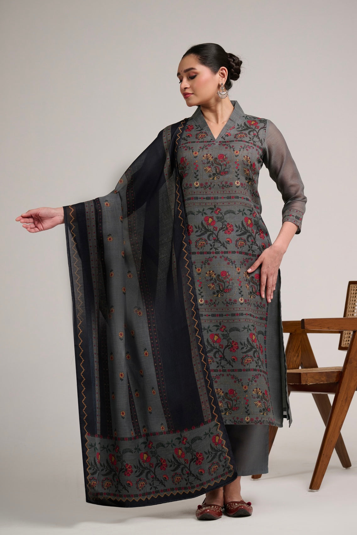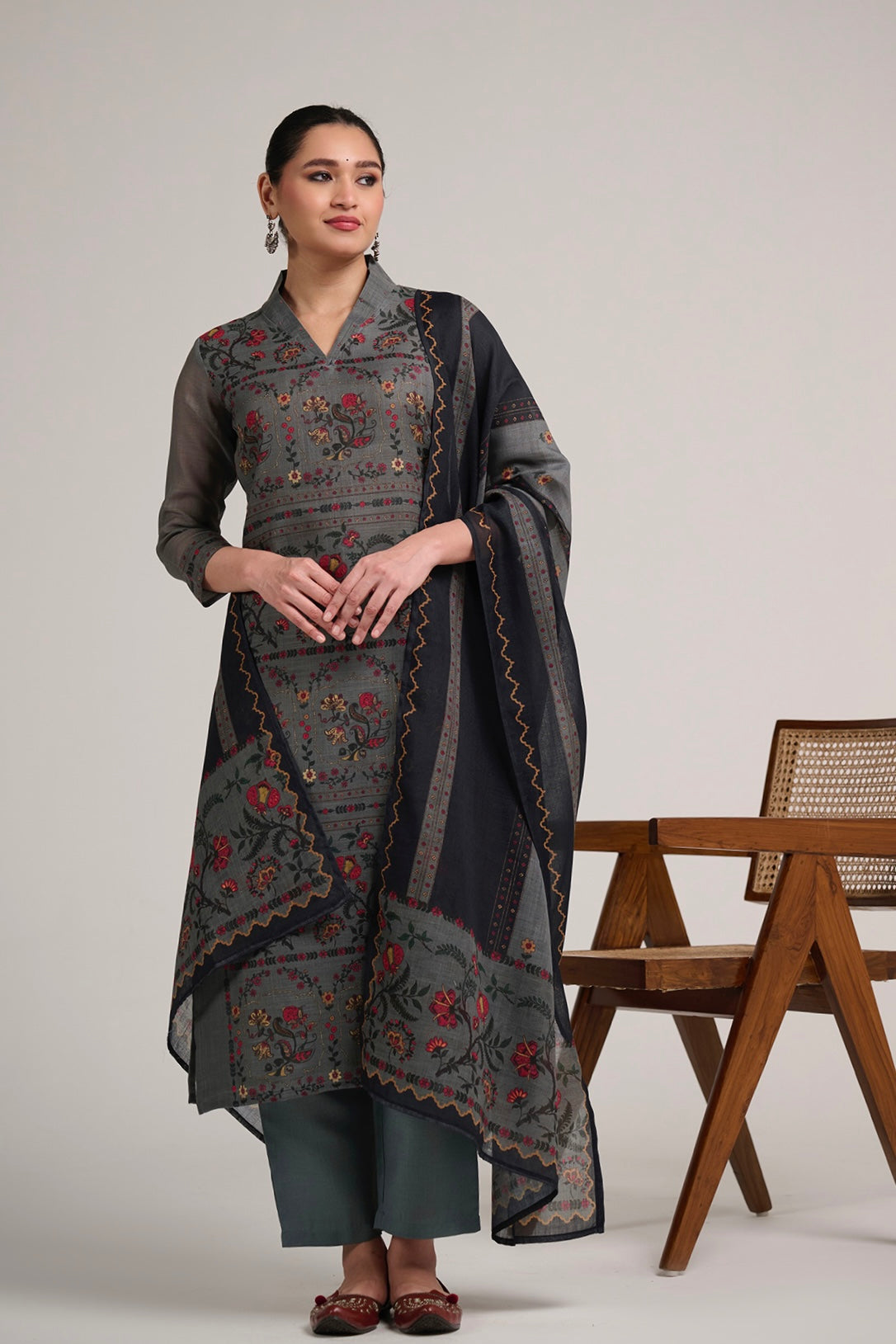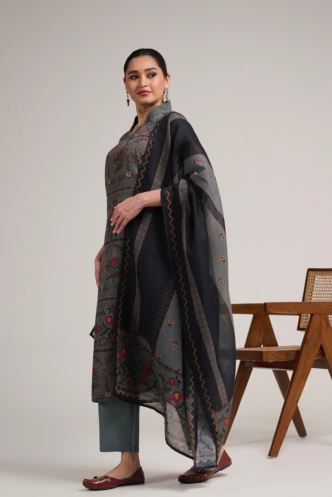 This refined linen suit set features intricate floral and traditional motif prints arranged in elegant panel patterns, paired with a beautifully bordered dupatta. The deep tonal palette adds richness while the breathable linen fabric ensures comfort and ease. A perfect choice for graceful day occasions and understated festive styling.