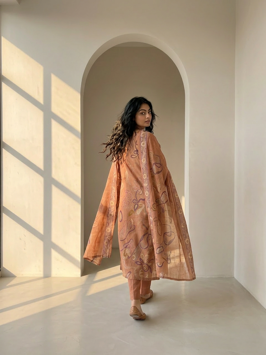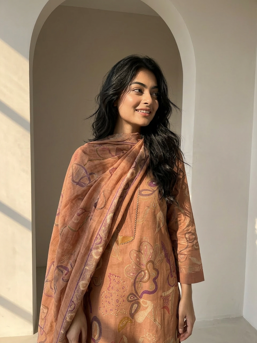 This outfit features artistic abstract floral prints spread beautifully across the kurta. The design has soft flowing shapes and modern motifs that create a stylish and unique look. The dupatta carries subtle printed detailing with a decorative border that adds elegance. The overall print style feels graceful, trendy, and eye-catching.