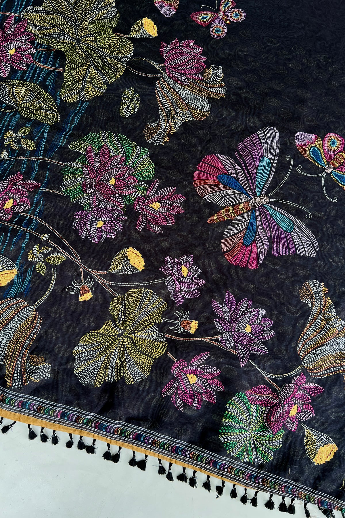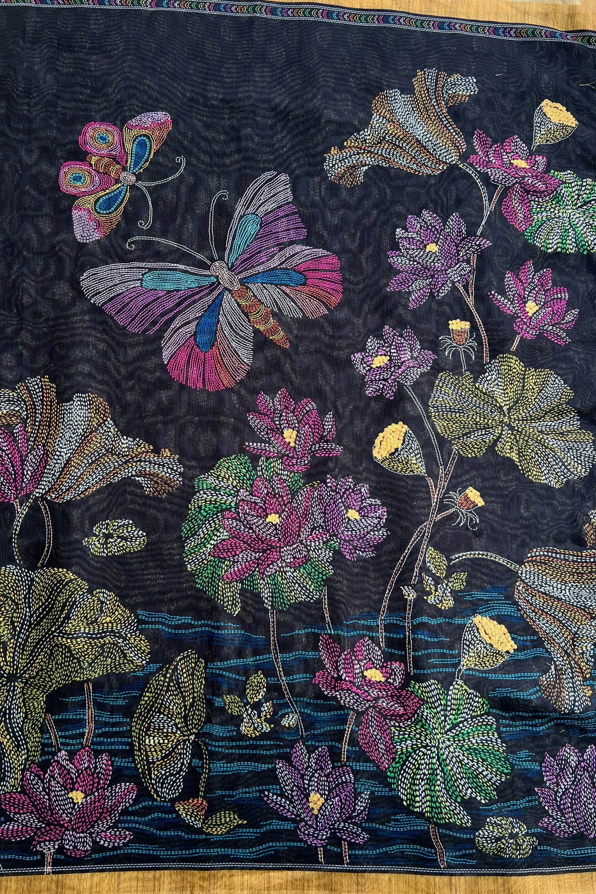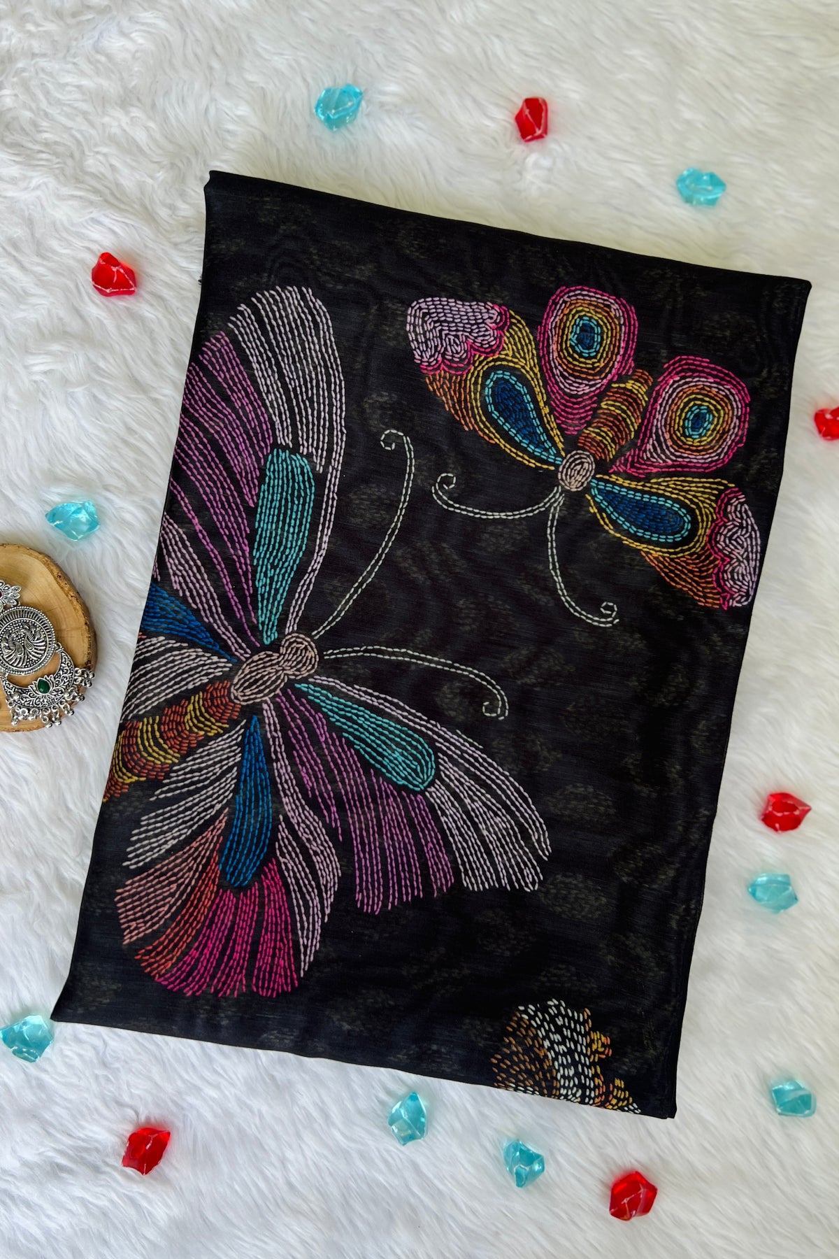 A graceful digitally printed saree that brings nature to life through its vivid, intricate prints. Featuring detailed butterflies, lotus blooms, and leafy vines in rich jewel tones, it carries a poetic and dreamlike charm. Perfect for those who love to wear stories woven in color and detail.