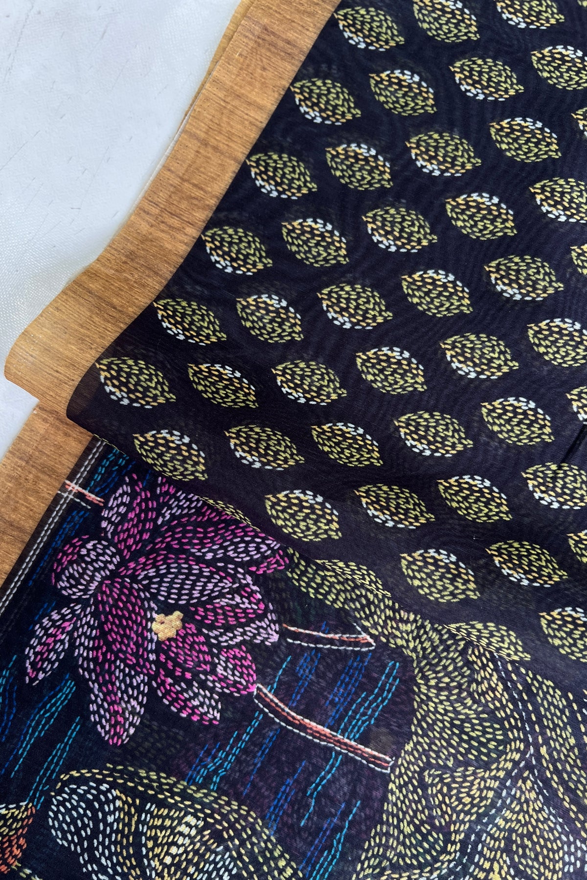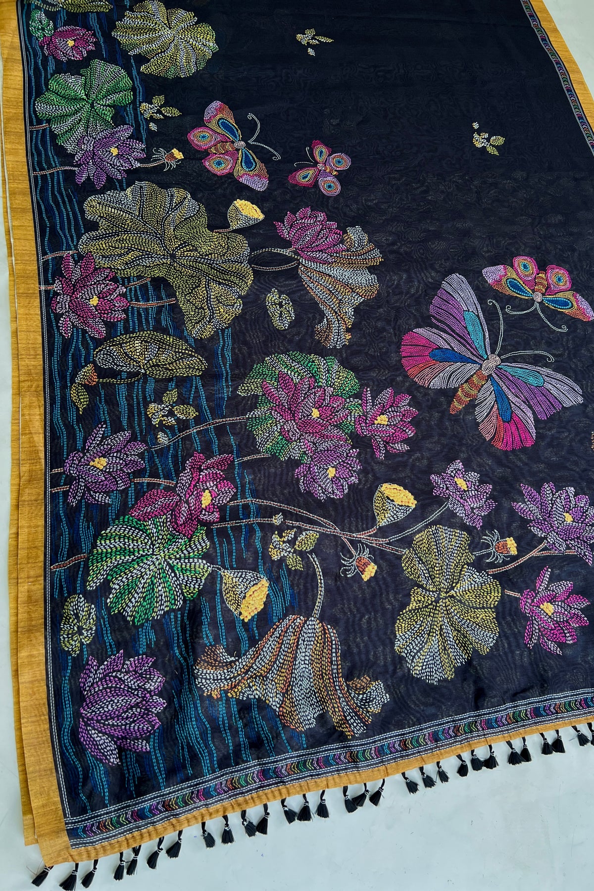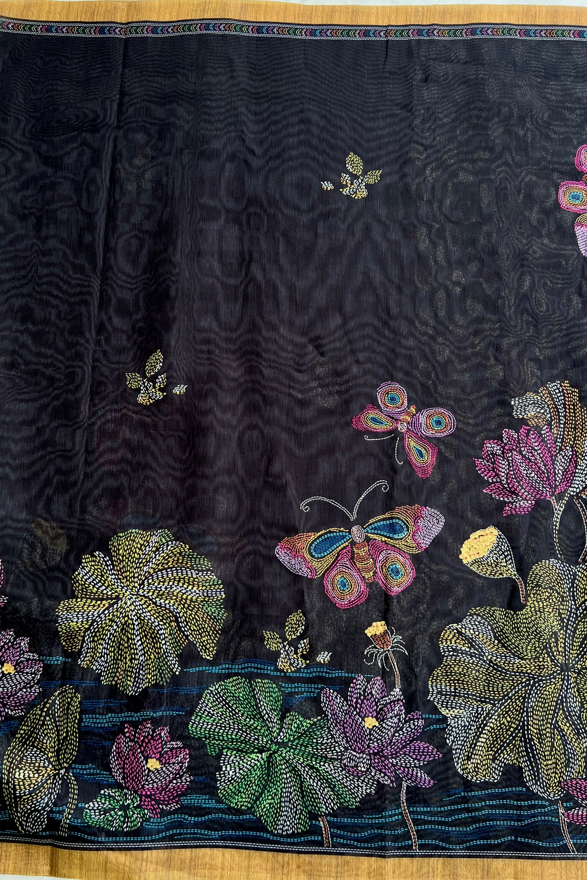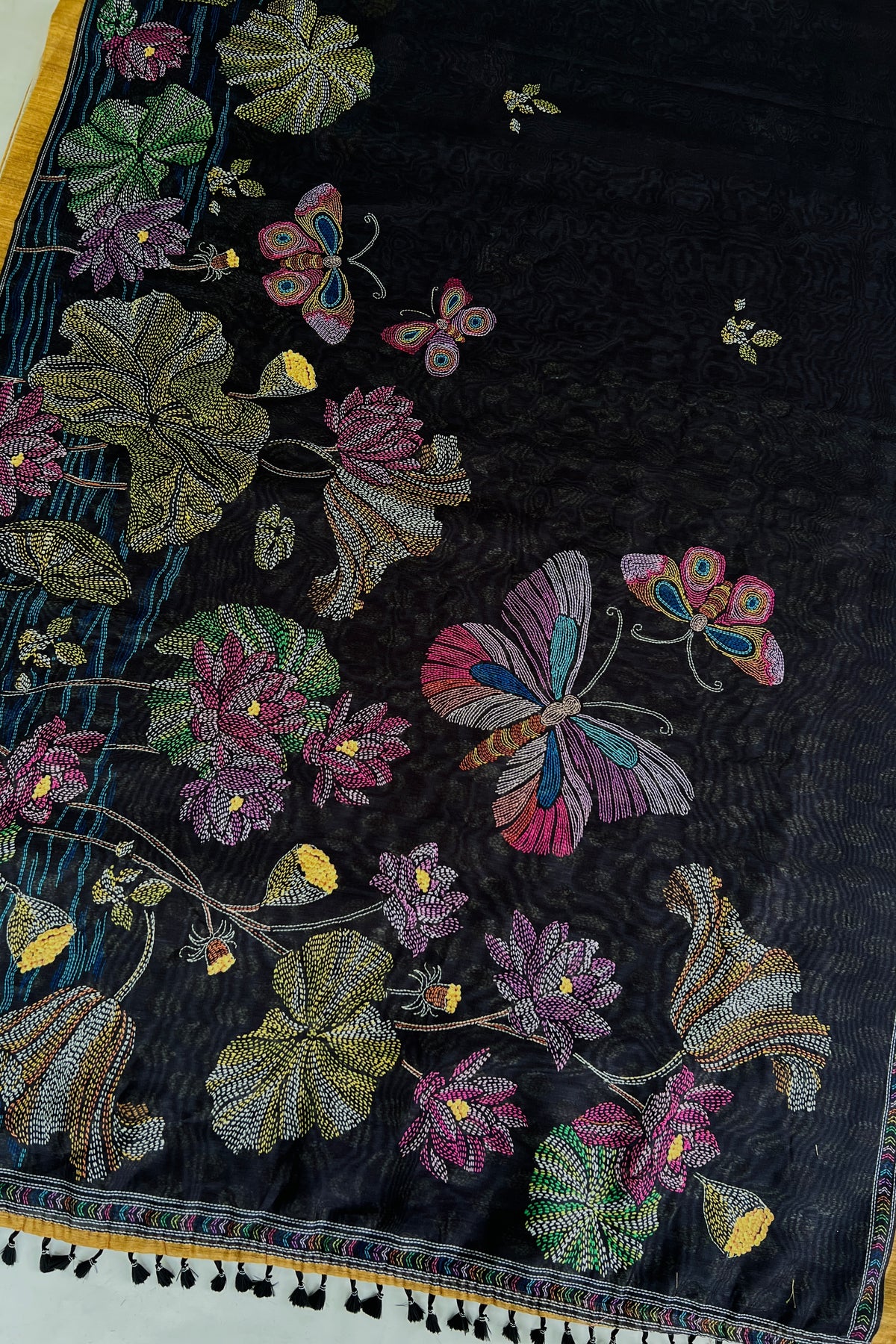 A graceful digitally printed saree that brings nature to life through its vivid, intricate prints. Featuring detailed butterflies, lotus blooms, and leafy vines in rich jewel tones, it carries a poetic and dreamlike charm. Perfect for those who love to wear stories woven in color and detail.