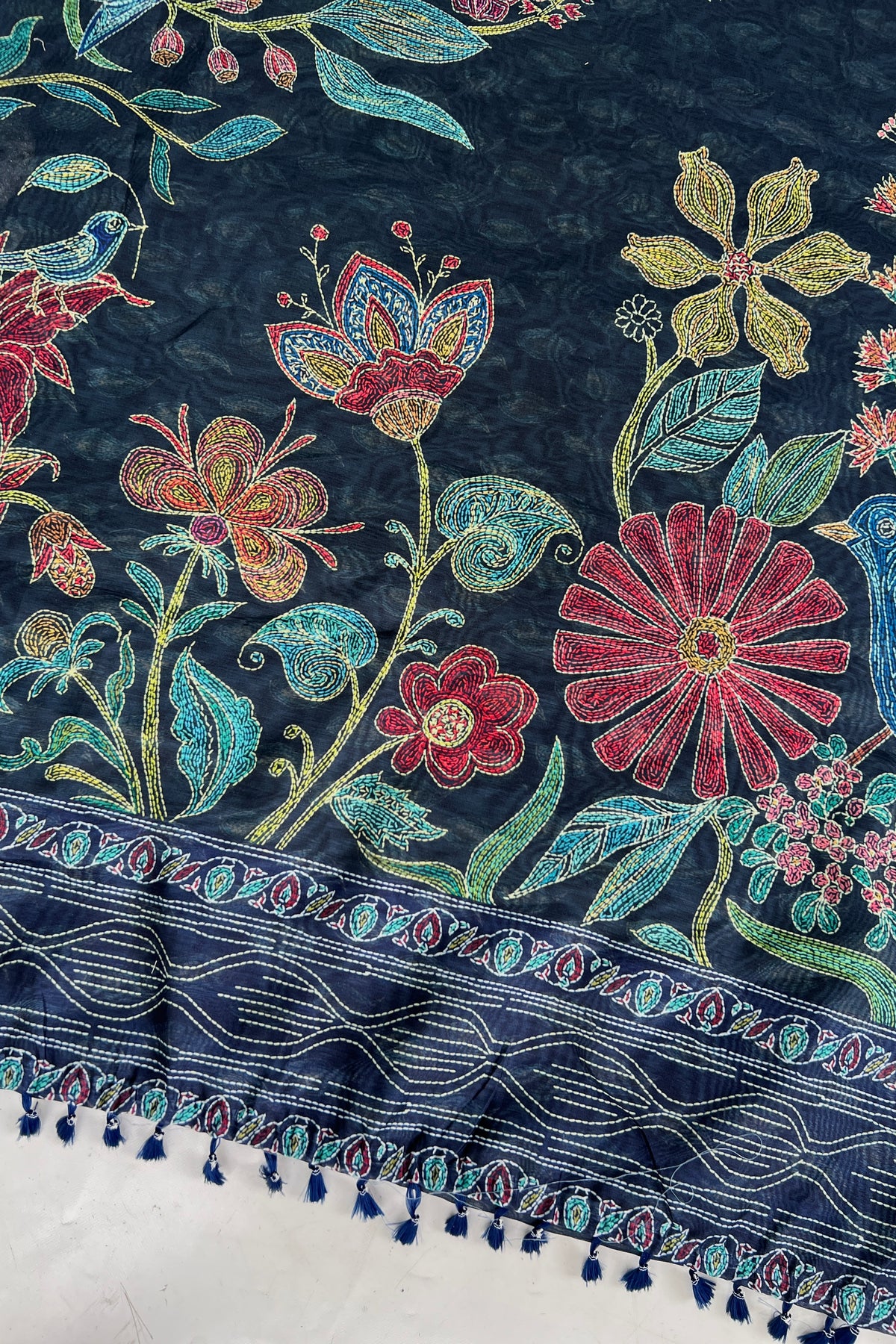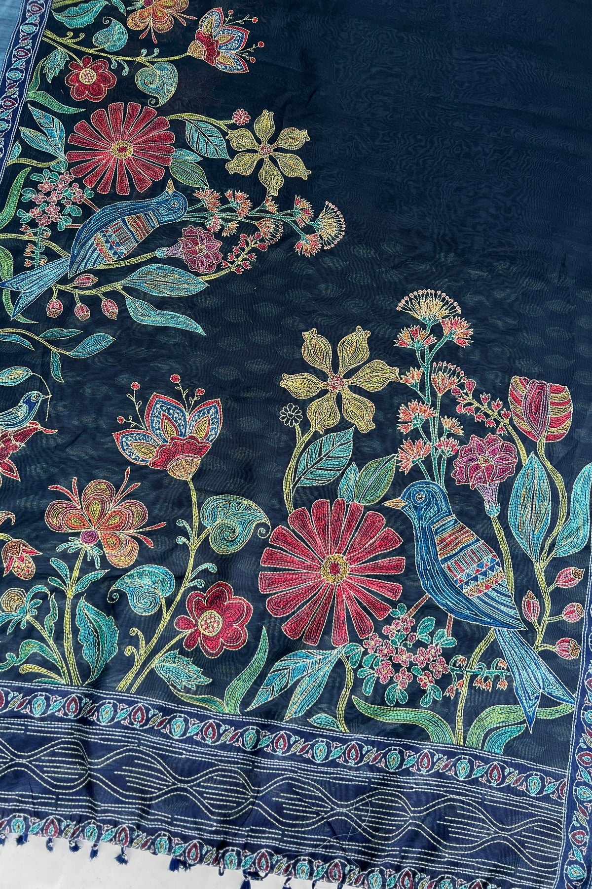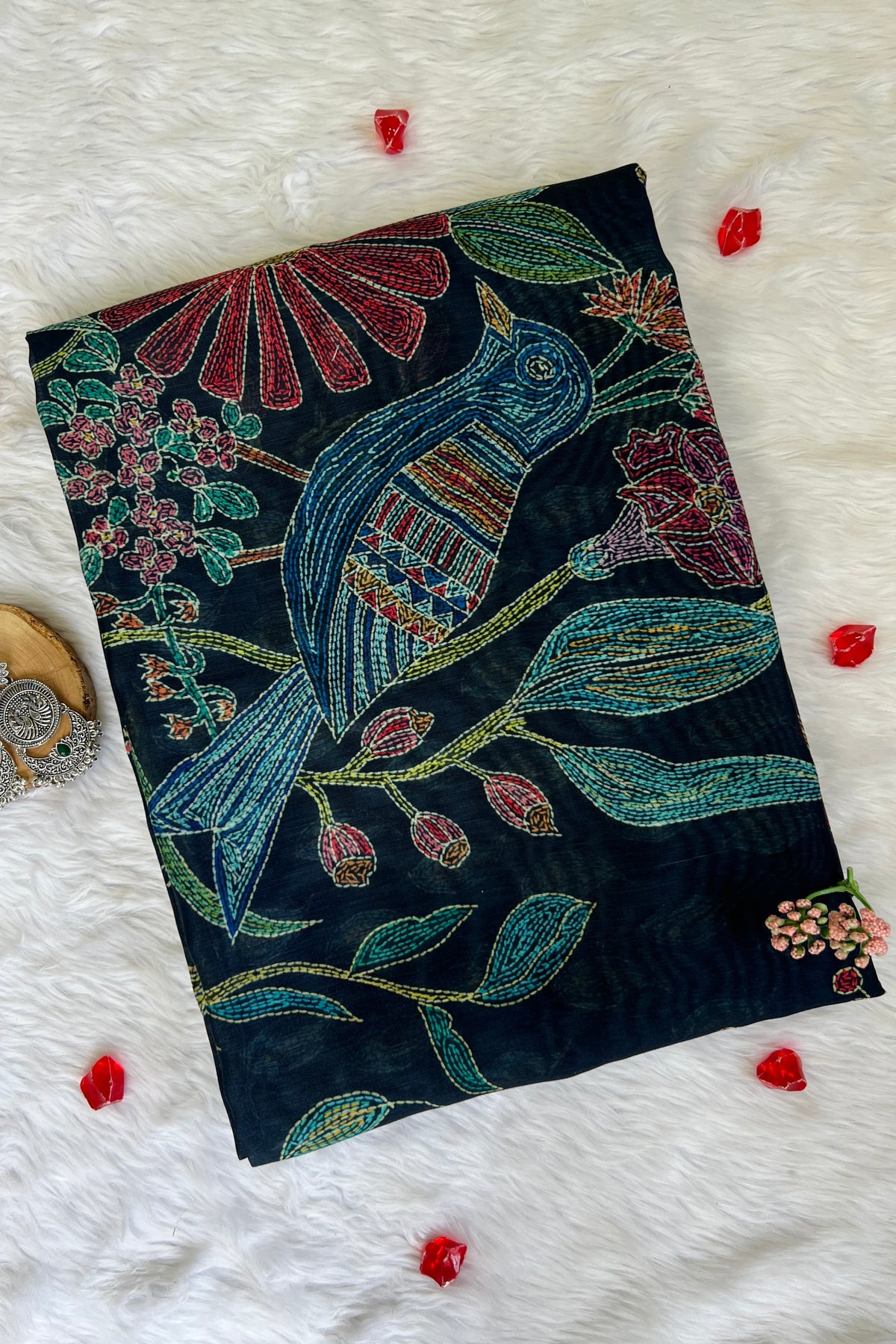 Elevate your festive wardrobe with this vibrant digitally printed saree, adorned with intricate floral and bird motifs. The pallu unfolds like a canvas of nature, offering a striking blend of color and artistic detail. A perfect choice for cultural events and celebrations that call for statement-making elegance.