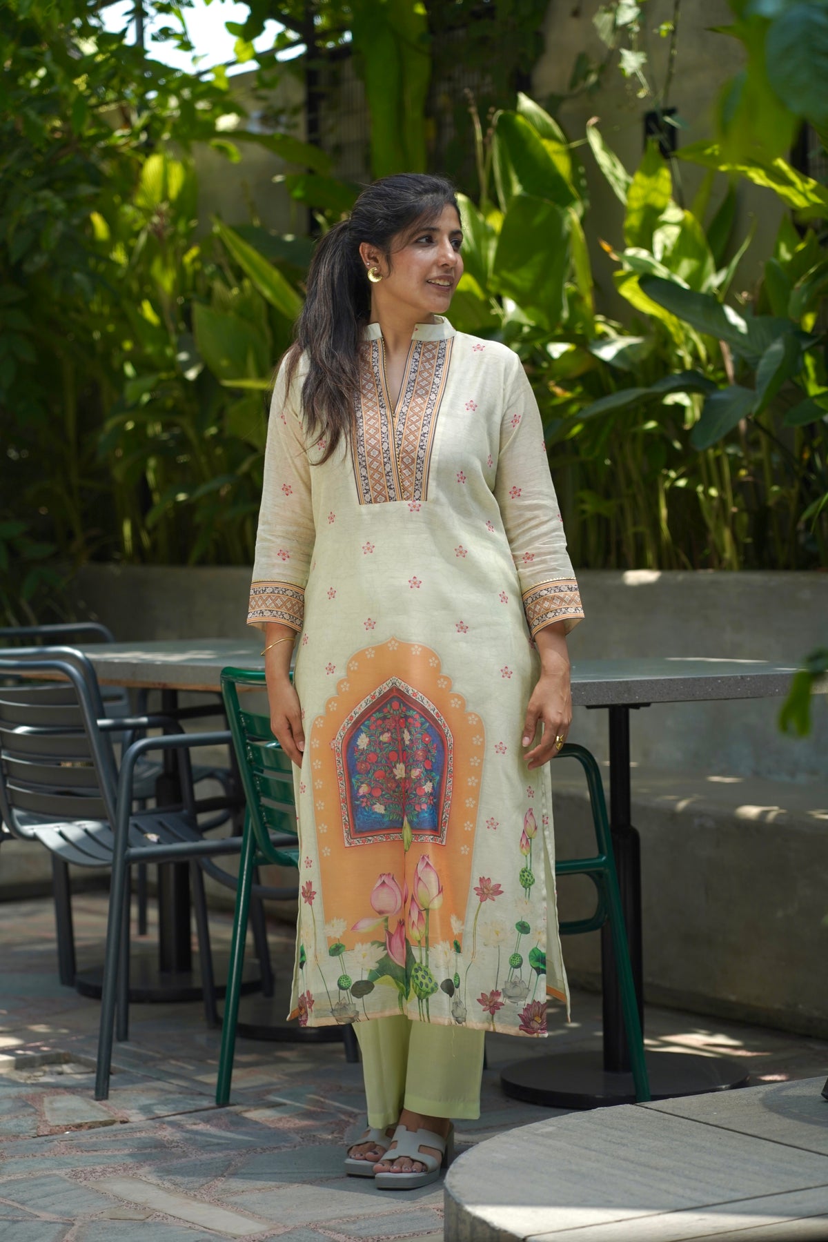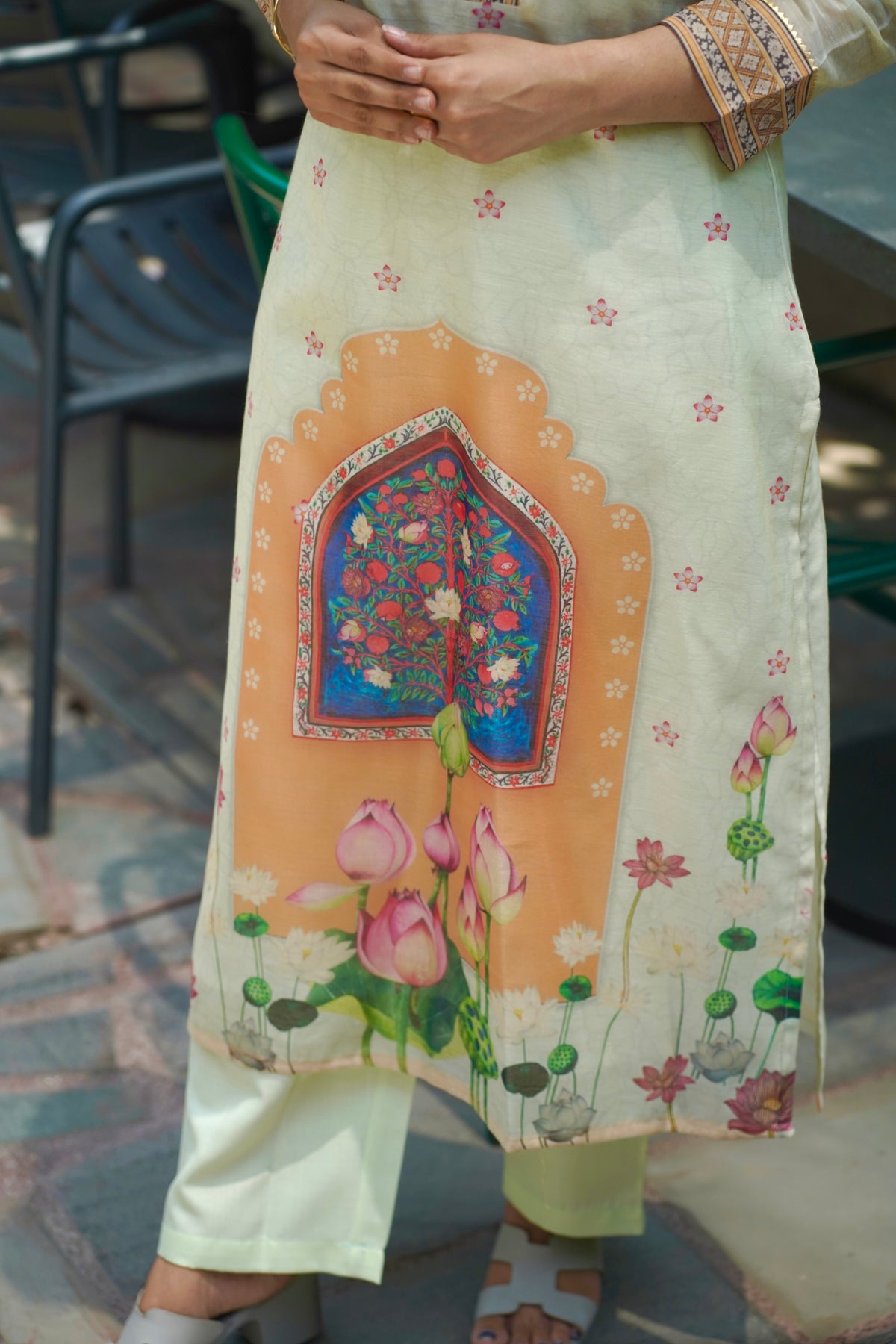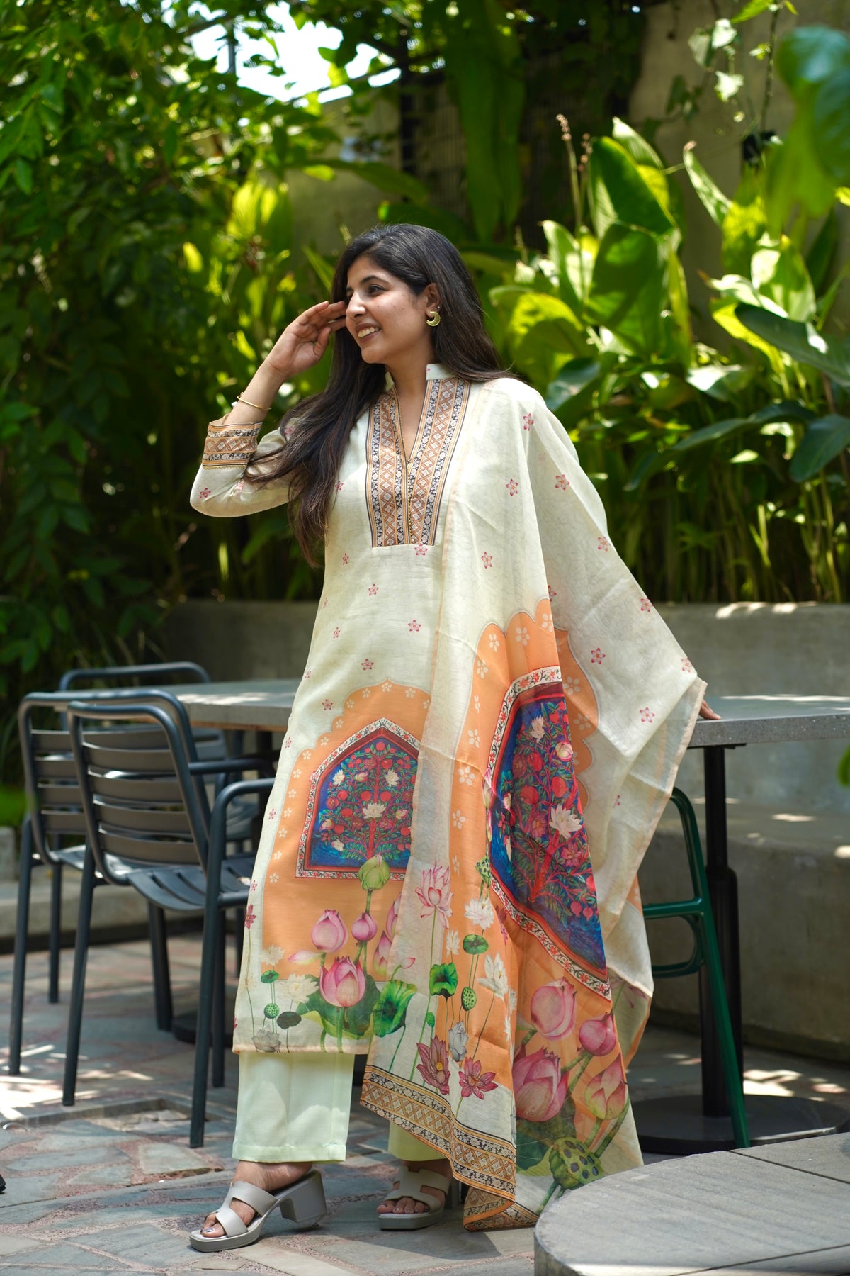 This serene cream suit set features beautifully detailed Mughal-style window frame prints, adorned with blooming lotus flowers and lush garden scenery. The soft peach border adds a charming contrast, highlighting the intricate artwork throughout. Delicate floral bootis scattered across the kurta add to its graceful appeal. A perfect blend of timeless art and refreshing color palette, ideal for daytime festivities or elegant casual wear.