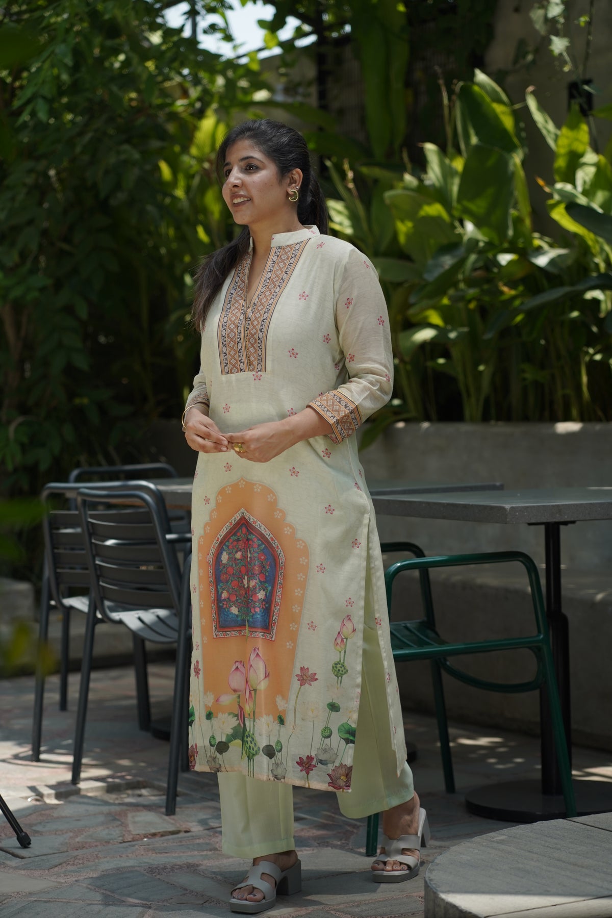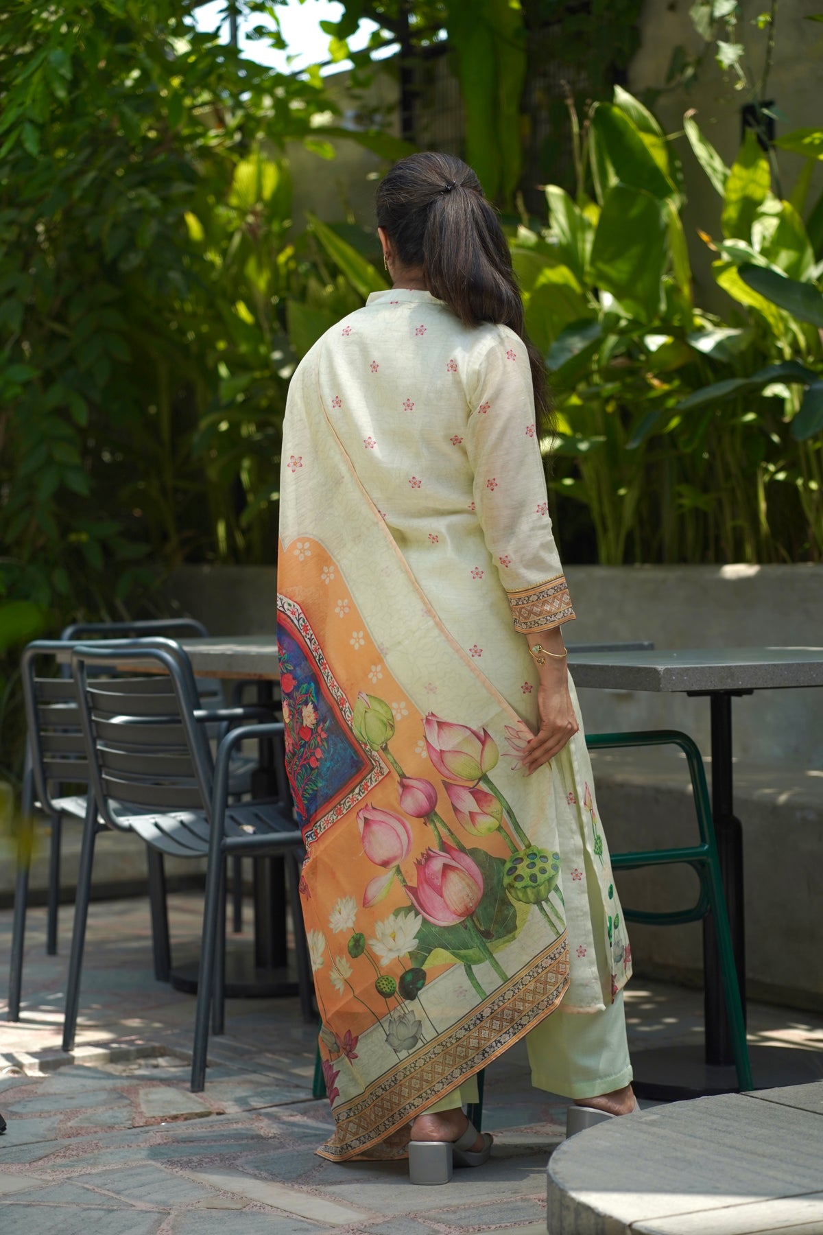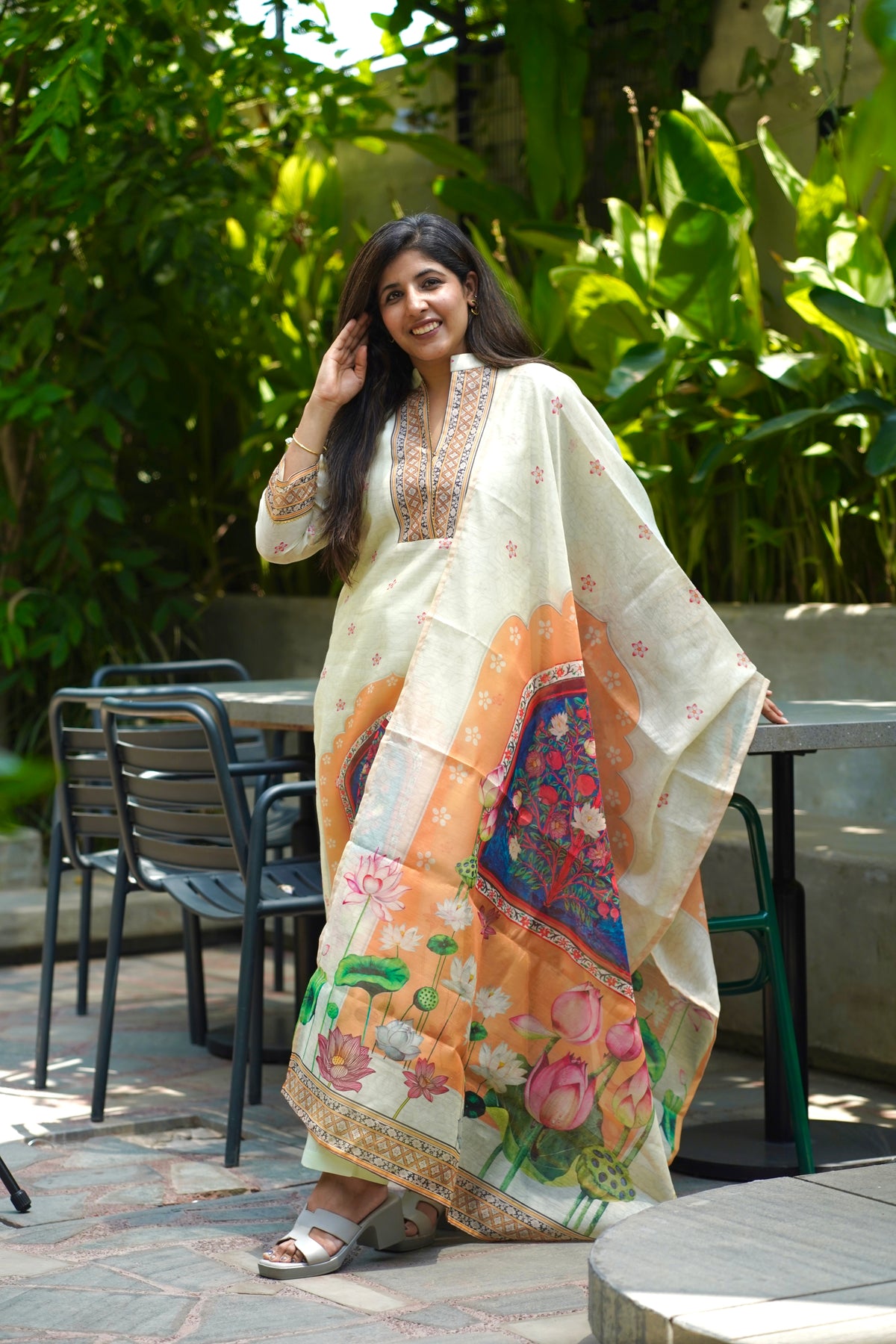 This serene cream suit set features beautifully detailed Mughal-style window frame prints, adorned with blooming lotus flowers and lush garden scenery. The soft peach border adds a charming contrast, highlighting the intricate artwork throughout. Delicate floral bootis scattered across the kurta add to its graceful appeal. A perfect blend of timeless art and refreshing color palette, ideal for daytime festivities or elegant casual wear.