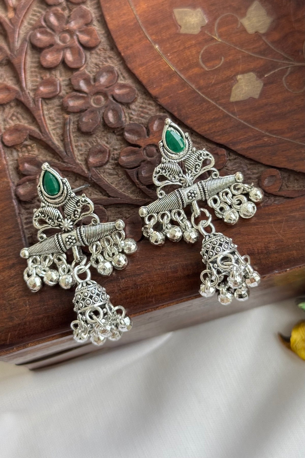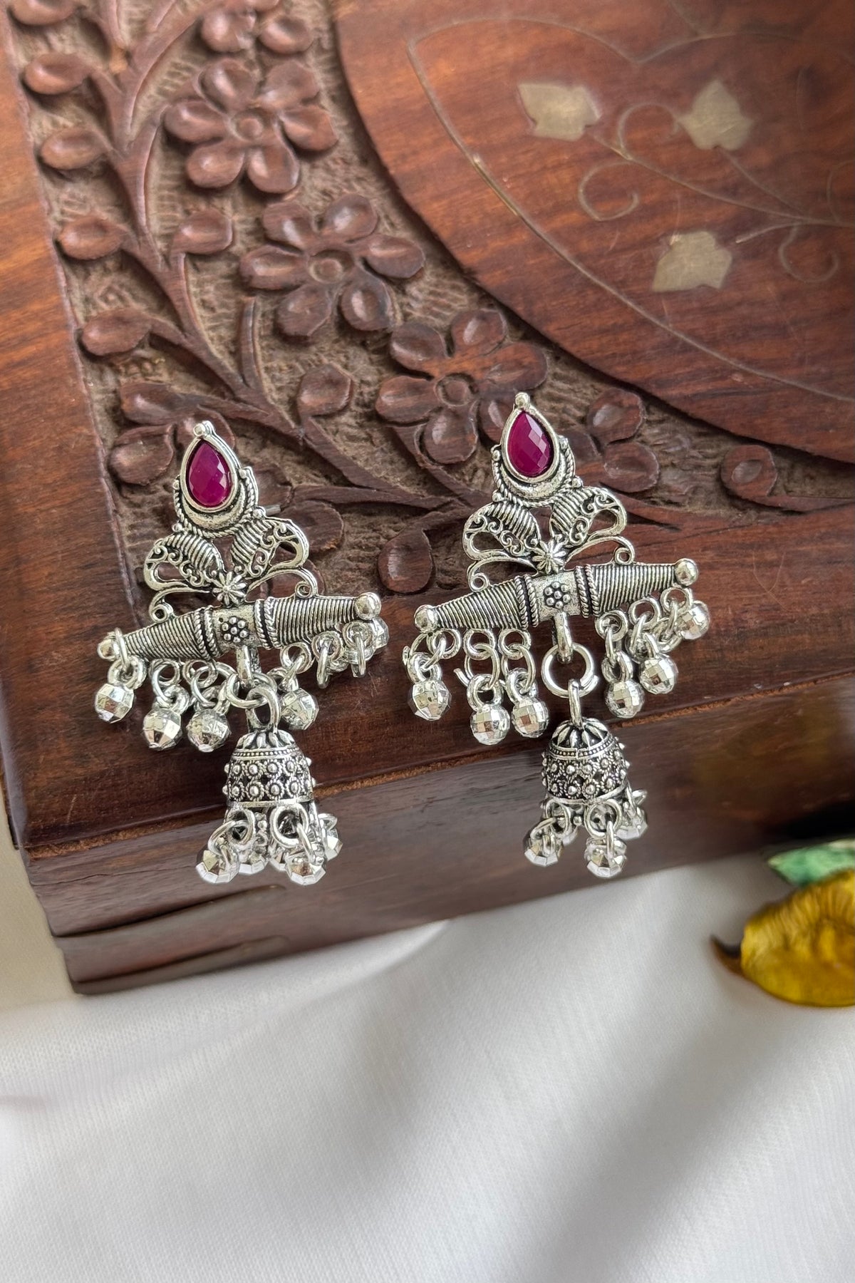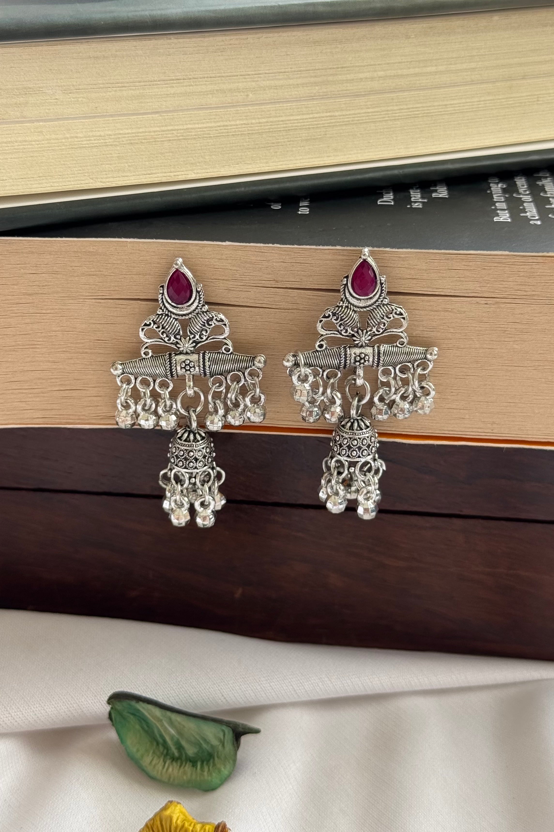 Grace meets tradition in these silver-toned jhumkas, adorned with rich Ruby Pink and Emerald Green stone accents.