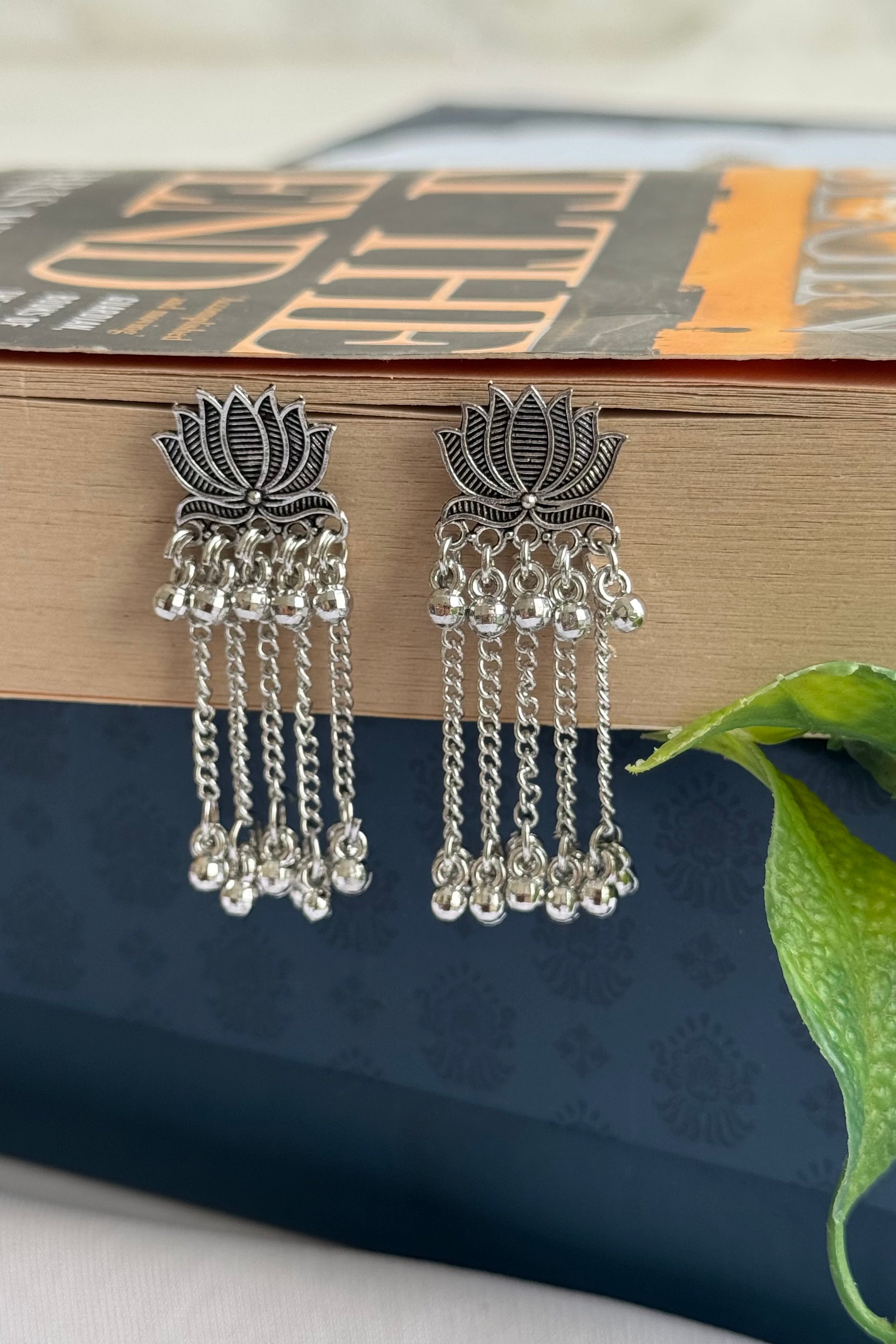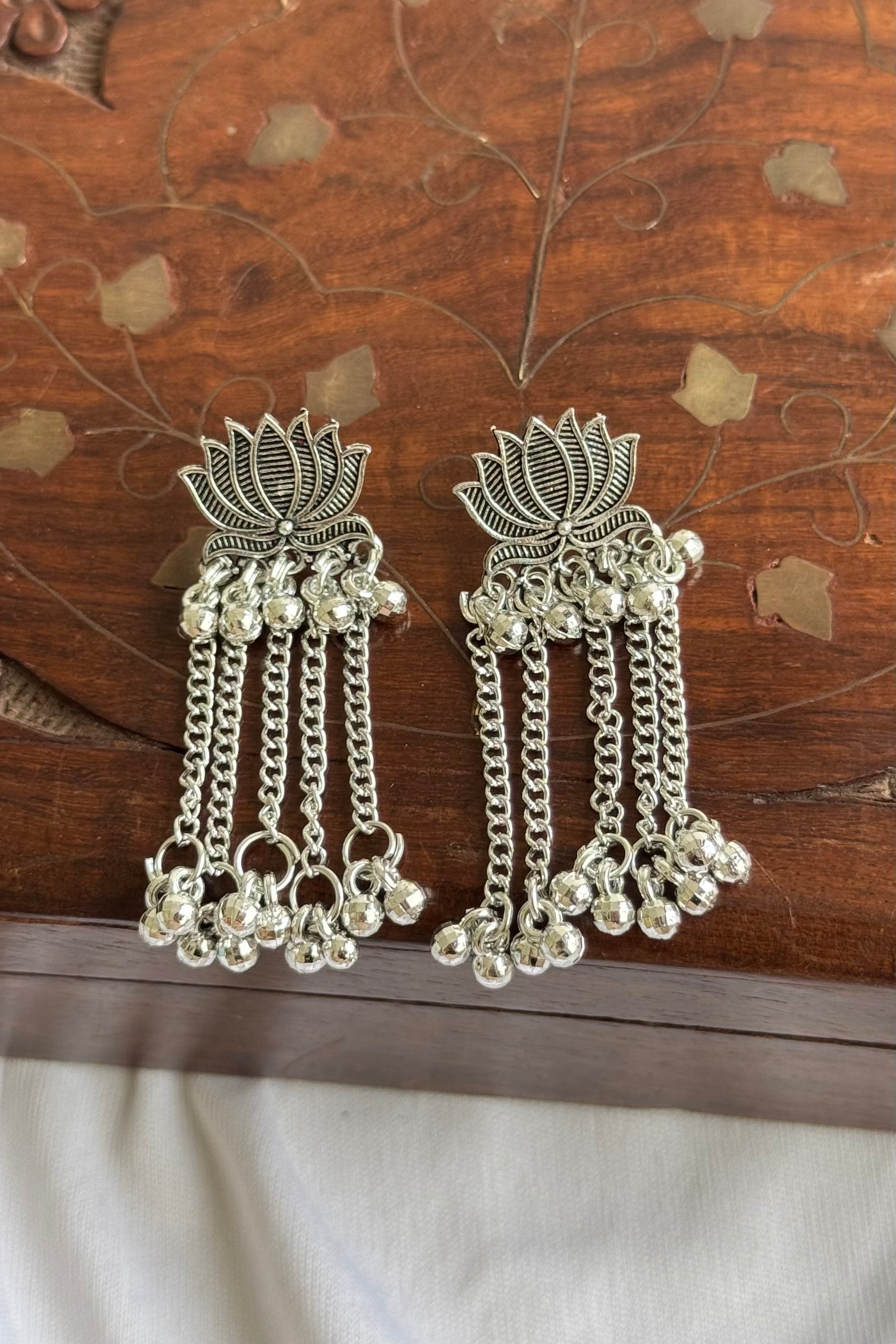 These earrings are designed with a lotus motif, detailed with fine engraved lines. Multiple oxidised silver-tone chains fall gracefully, finished with small bead drops that add movement and charm. The design feels traditional yet contemporary, making it a statement piece for festive and ethnic looks.
