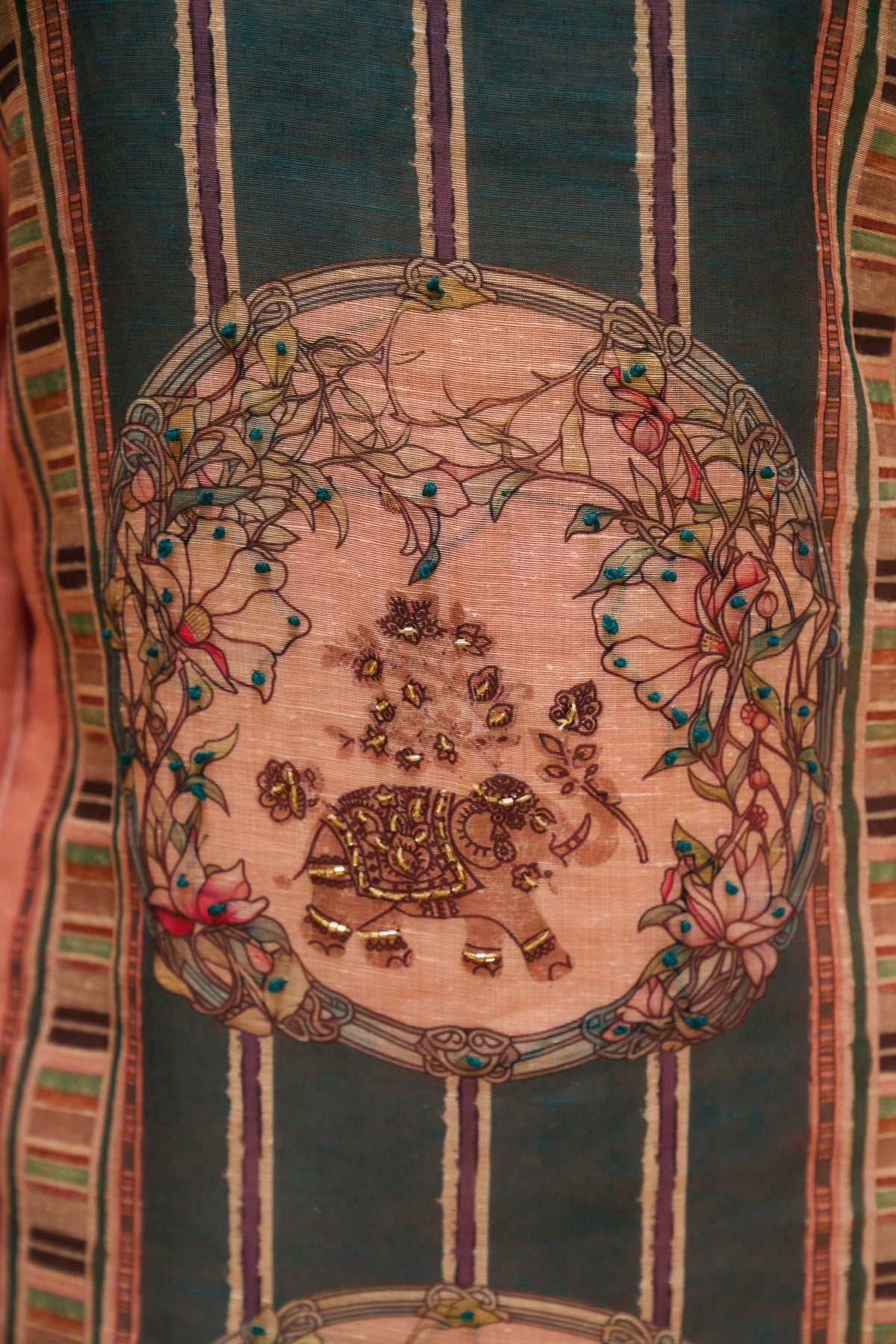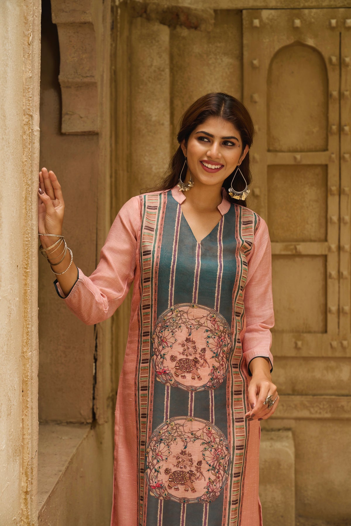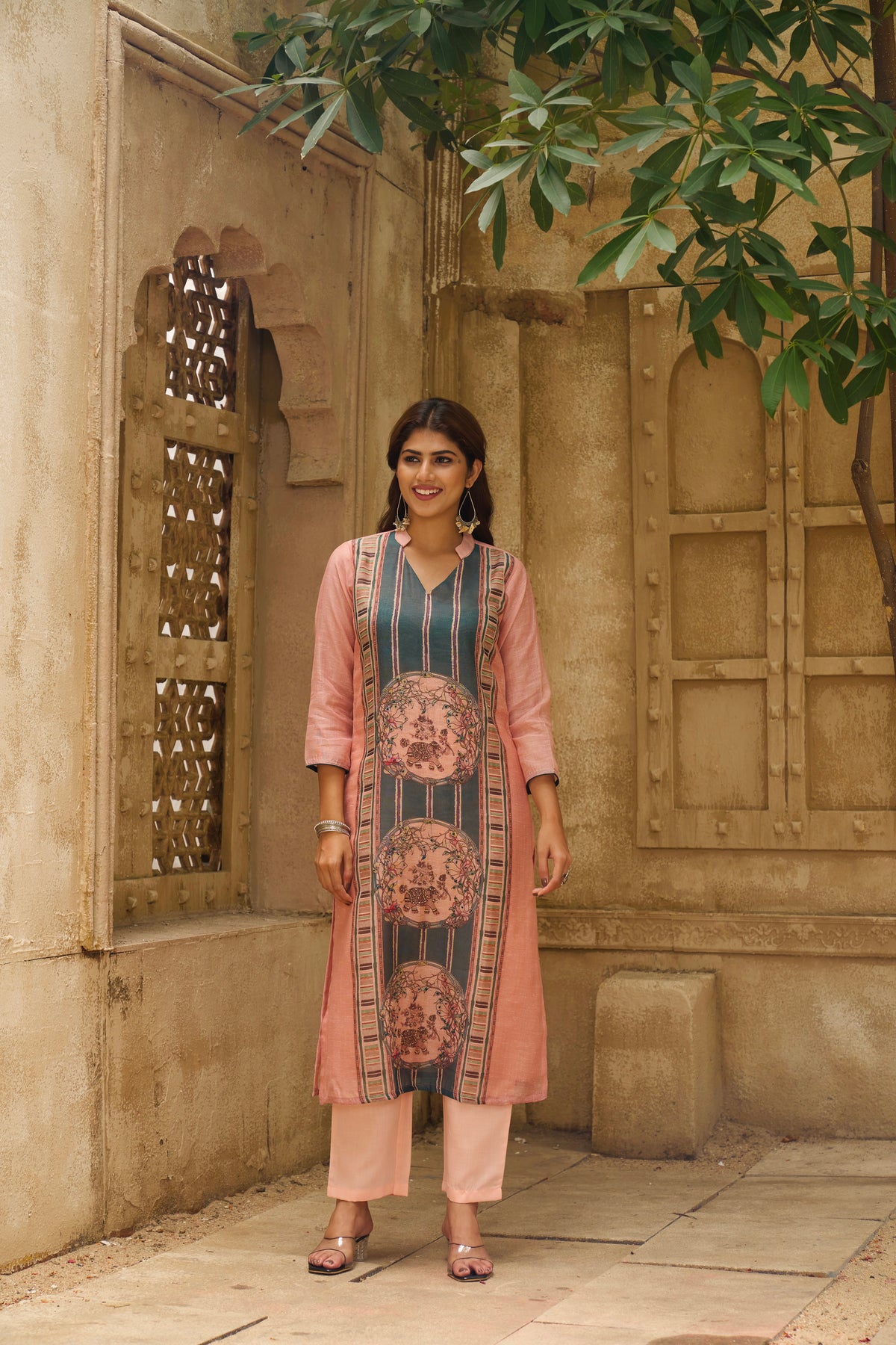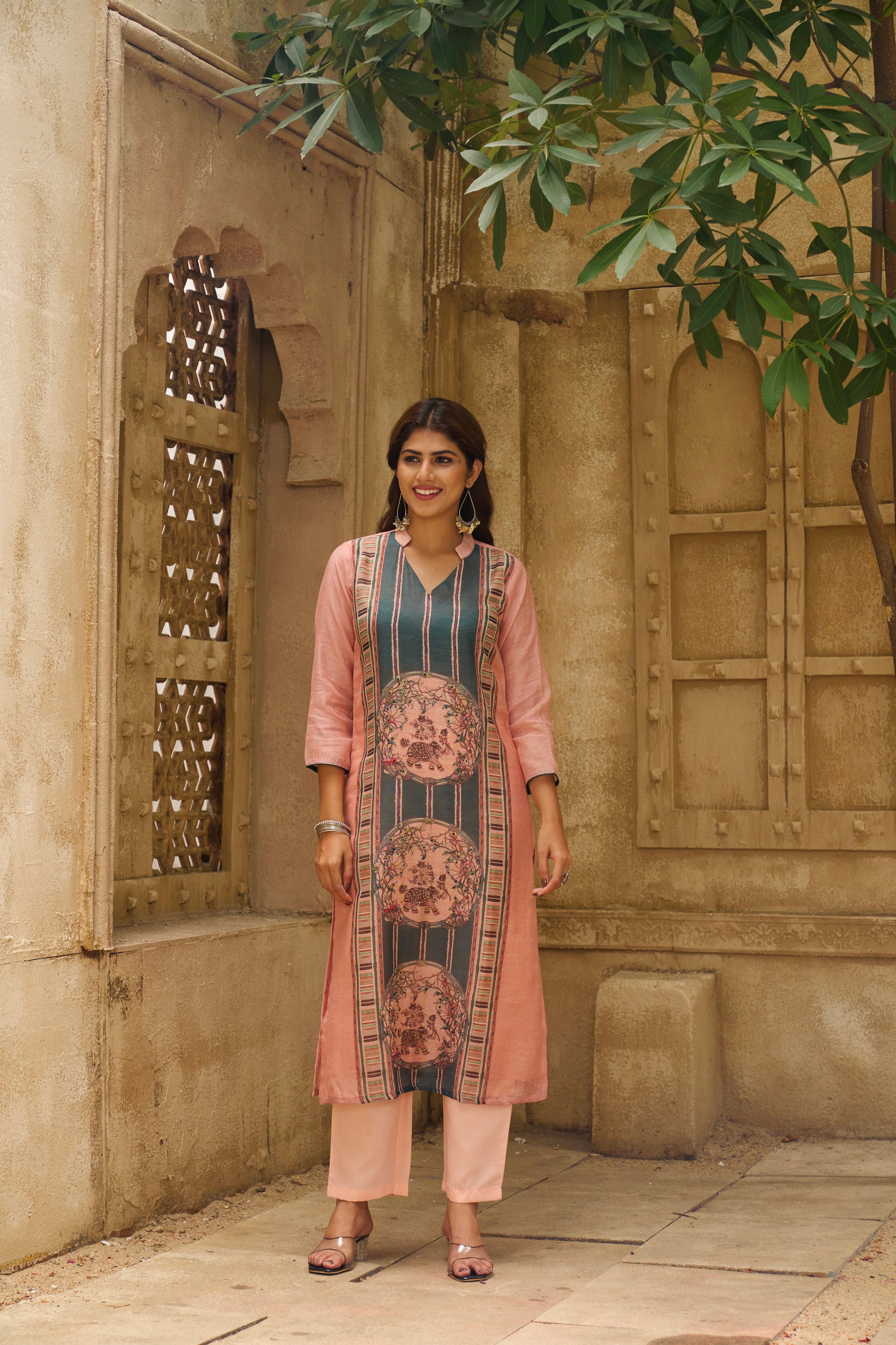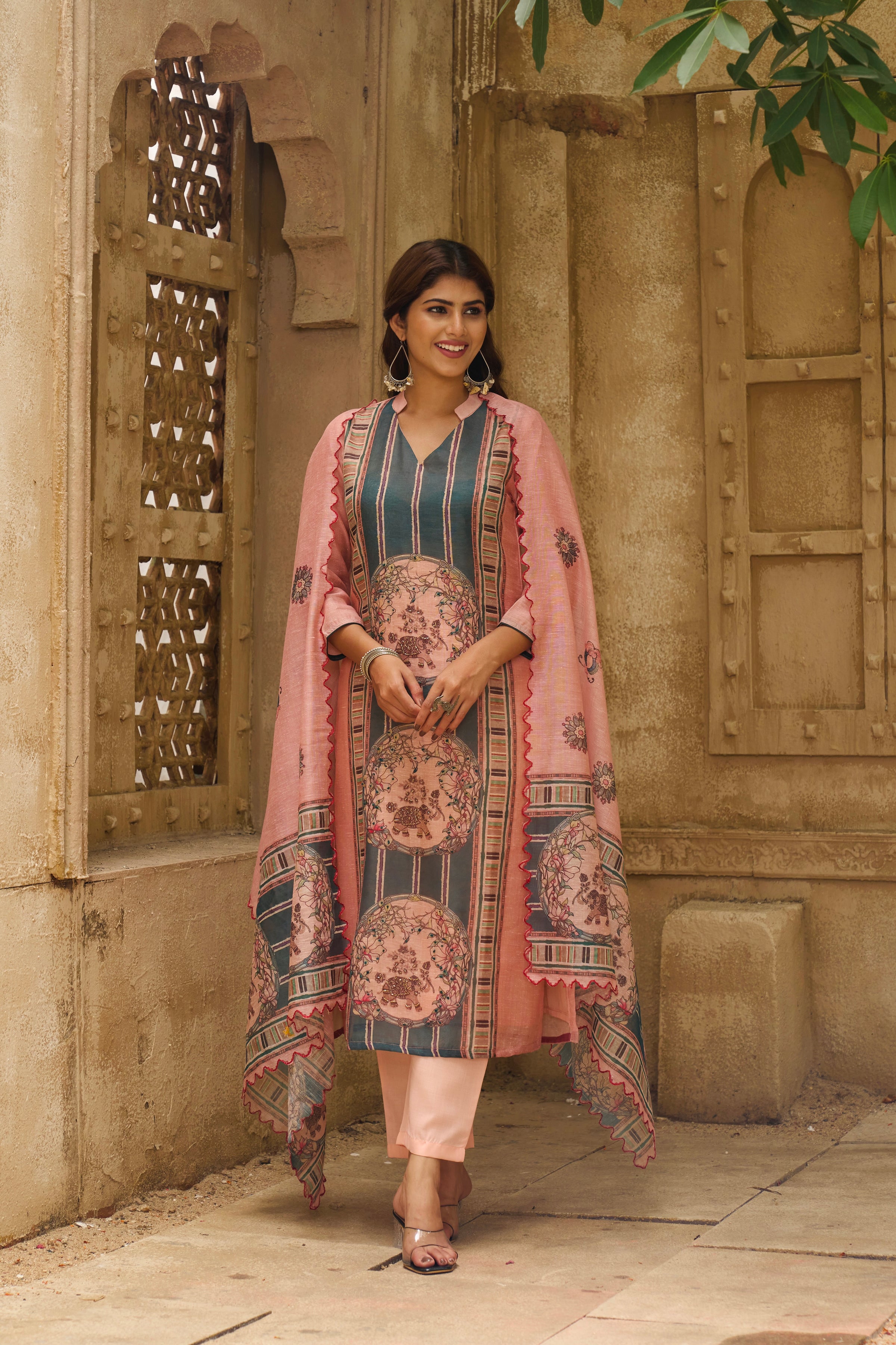 A delicate handwork kurta paired with a beautiful dupatta in soft blush tones. The floral motifs and striped details bring a perfect balance of elegance and tradition, making this suit set an ideal pick for festive occasions or daytime celebrations. Graceful, lightweight, and timeless — a piece that defines understated charm.