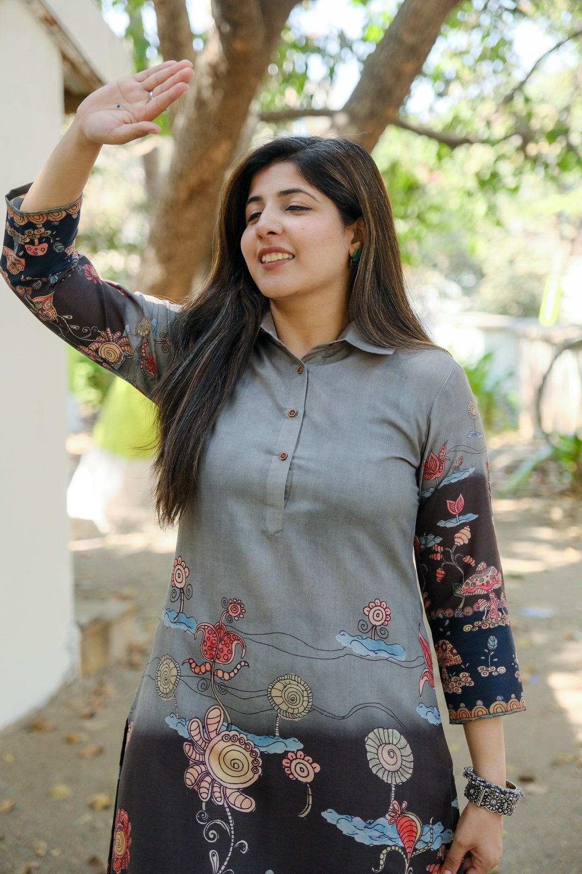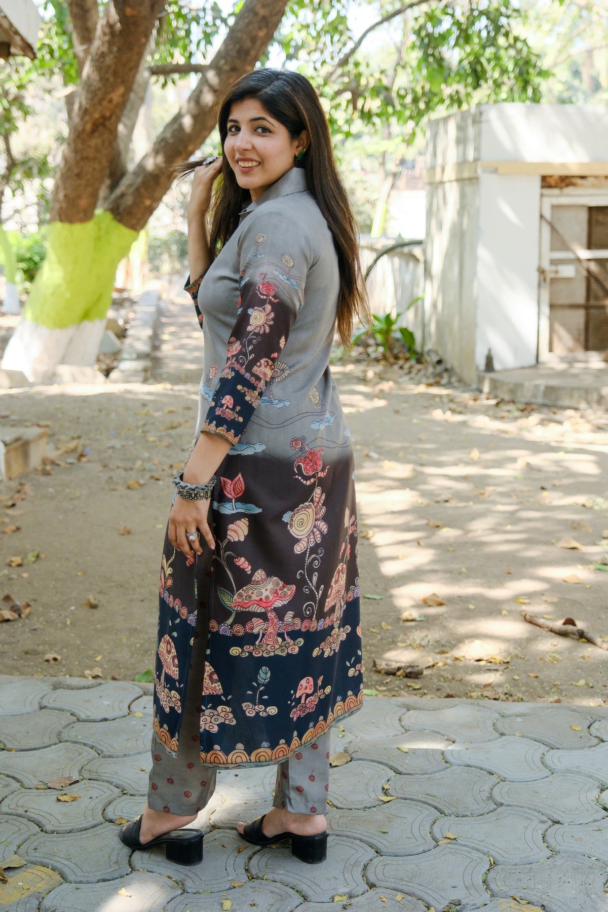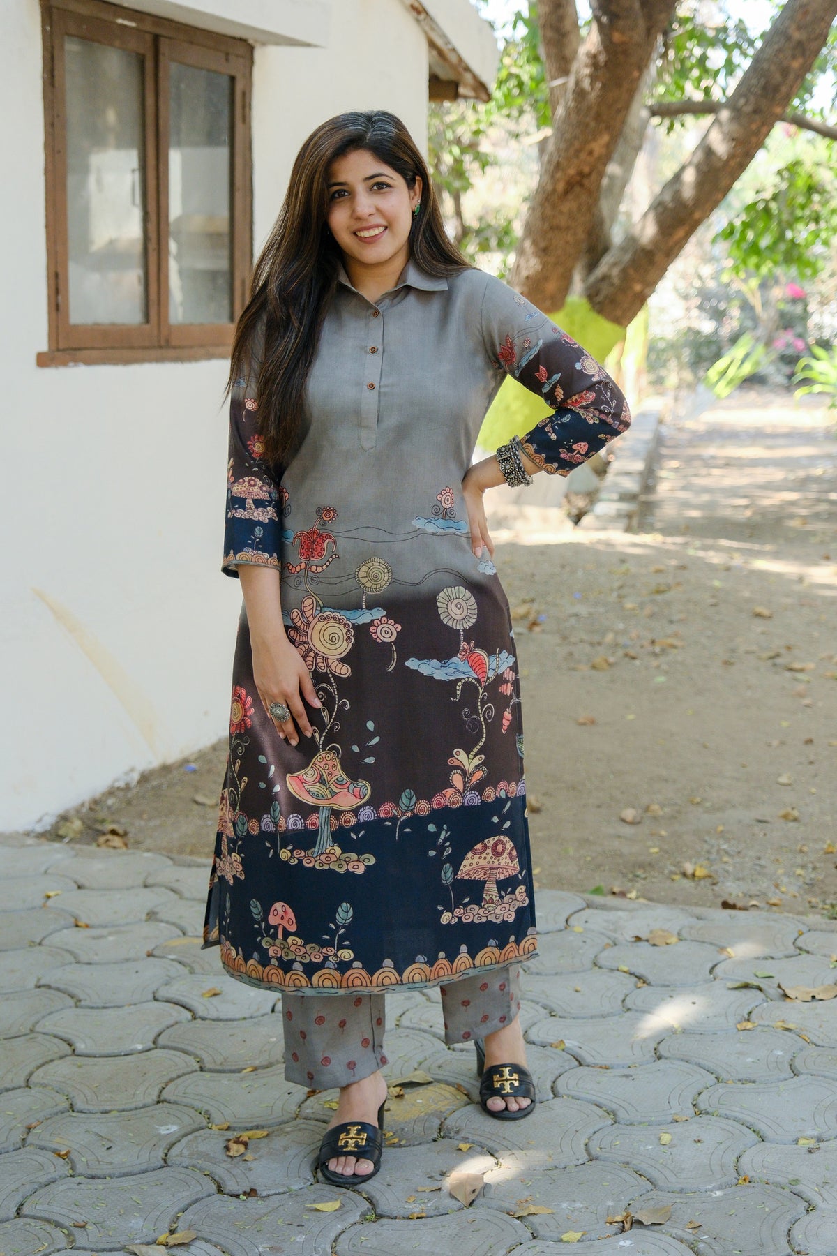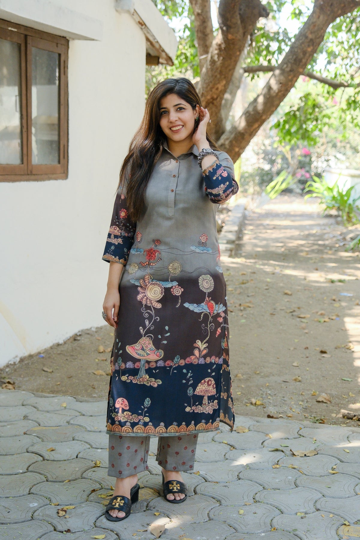 This kurta set brings a fresh twist with its charming mushroom and floral prints. The blend of muted grey and bold patterns creates a striking contrast, giving it a trendy yet traditional look. A great choice for brunch dates or family get-togethers.