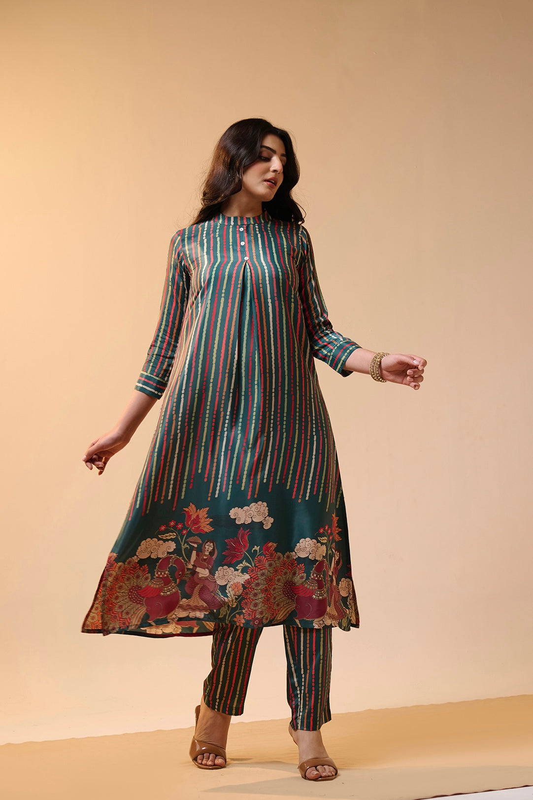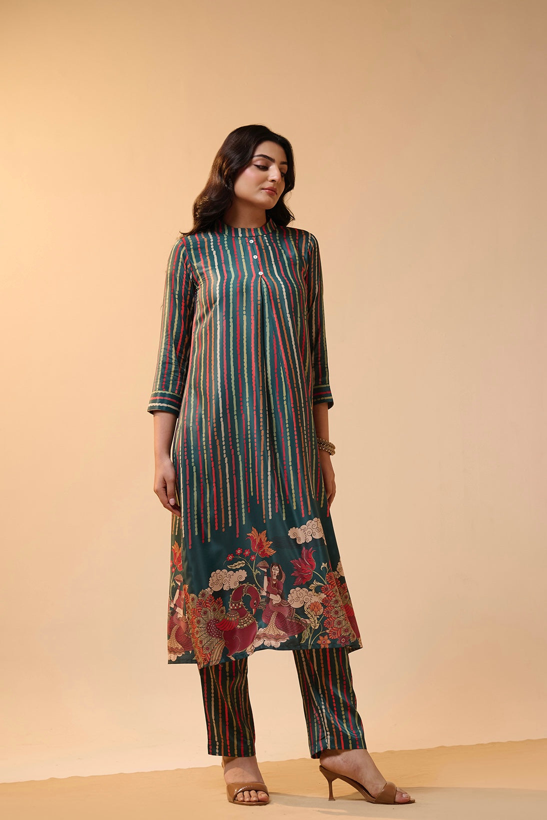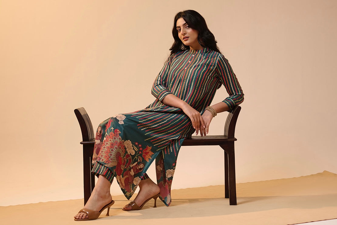 This kurta set comes in soft modal crepe fabric with stylish vertical stripe prints.