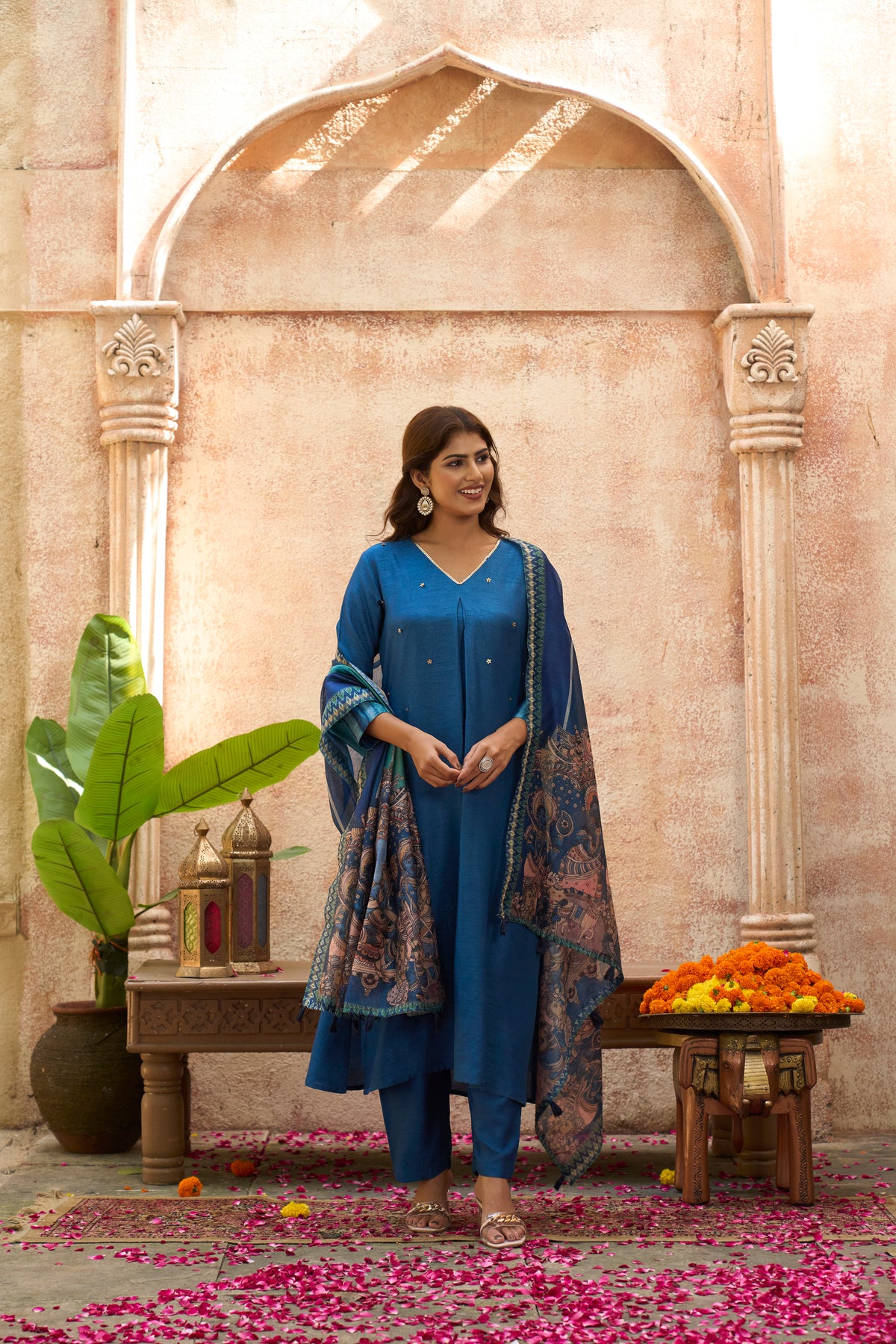 This blue kurta set is made in pure dola silk with a handloom cotton silk dupatta. This elegant blue suit features a striking blend of deep and light blue tones. The highlight is its dupatta with beautiful mythological-inspired prints along the border, adding a regal and artistic touch. Perfect for festive and traditional occasions, it brings a graceful yet unique look.