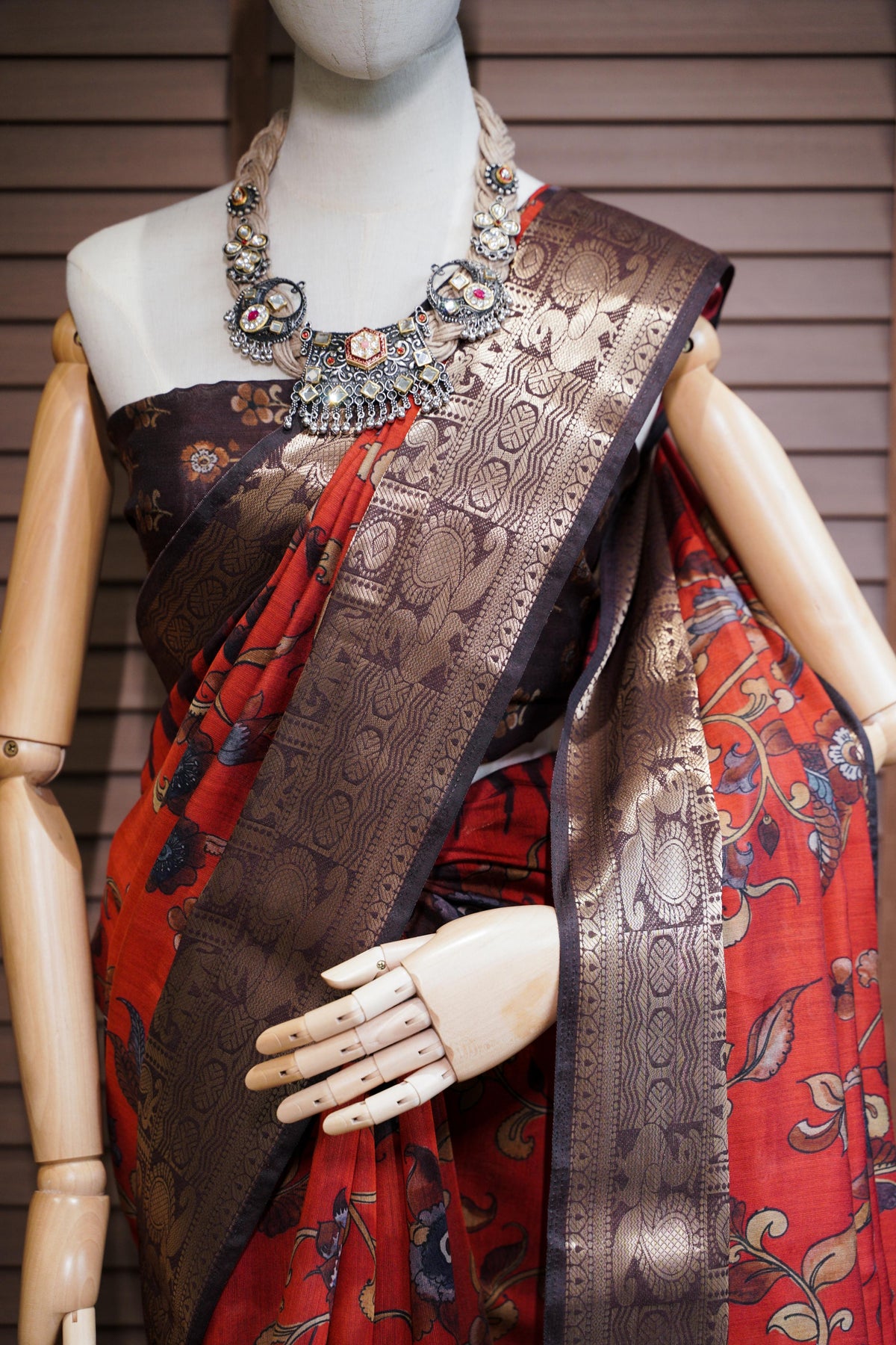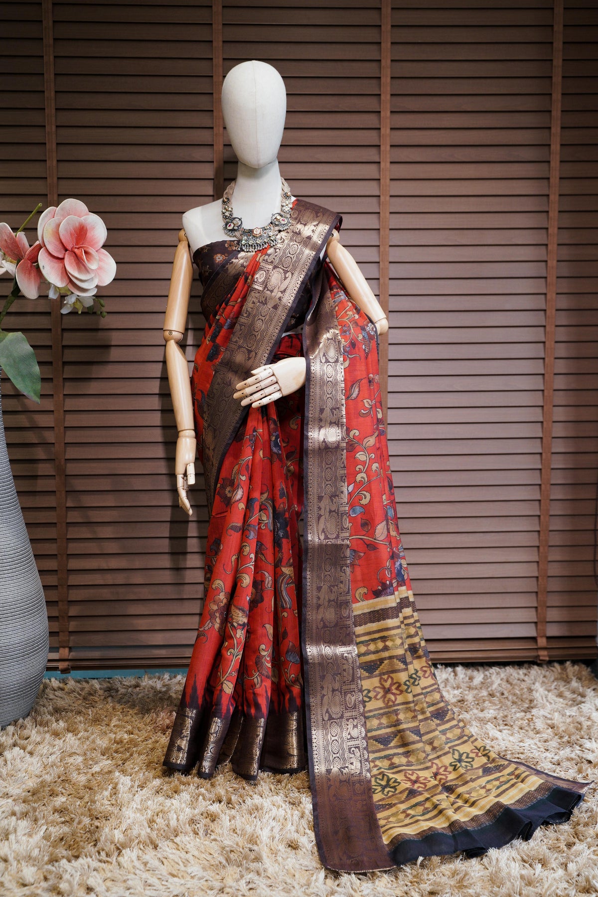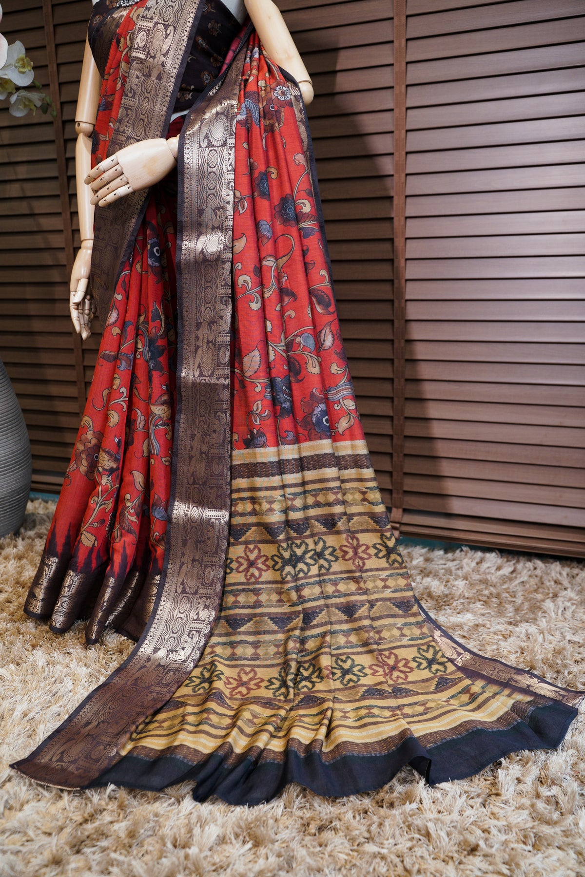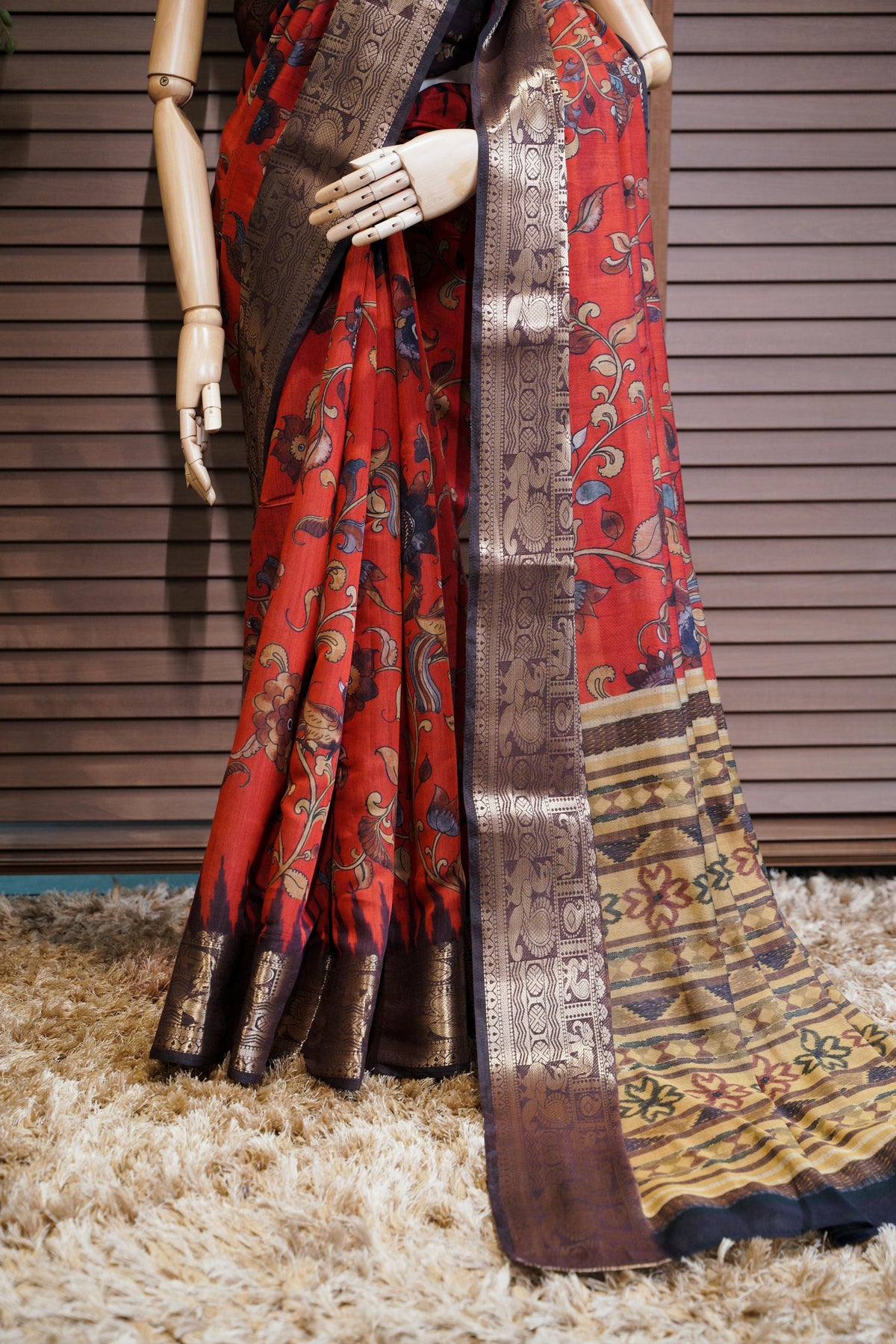 Make a bold statement with this exquisite saree featuring a vibrant red base adorned with intricate floral and bird motifs that add a touch of elegance. The rich contrast border showcases traditional patterns in deep gold and brown tones, enhancing its regal appeal. The pallu is beautifully highlighted with striking geometric and floral designs, creating a stunning visual balance. Perfect for festive occasions or cultural celebrations, this saree blends timeless charm with artistic flair.