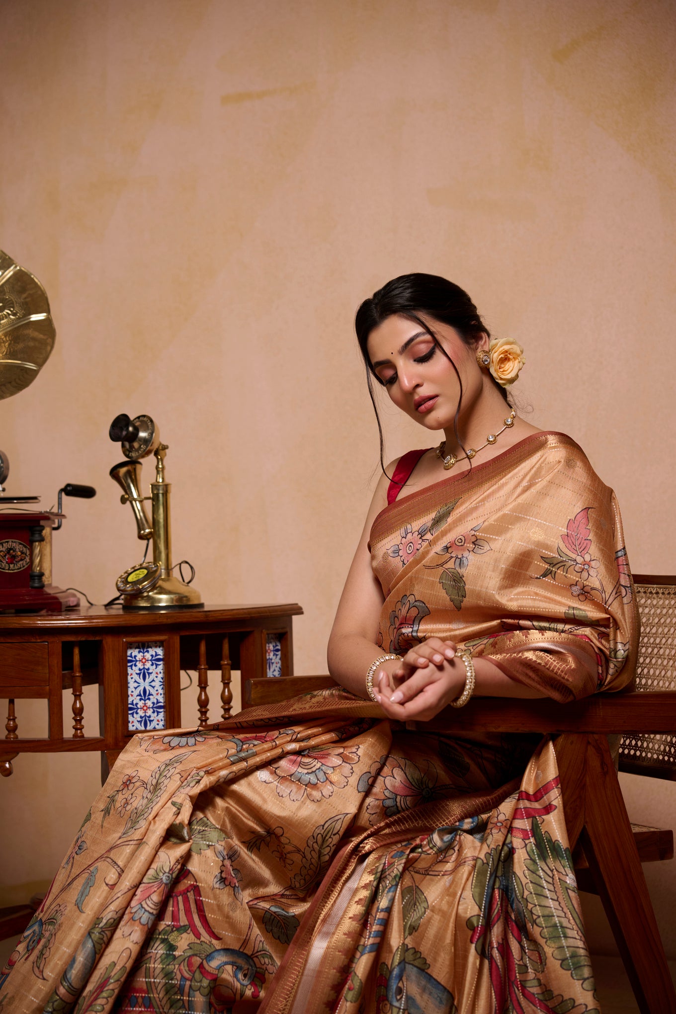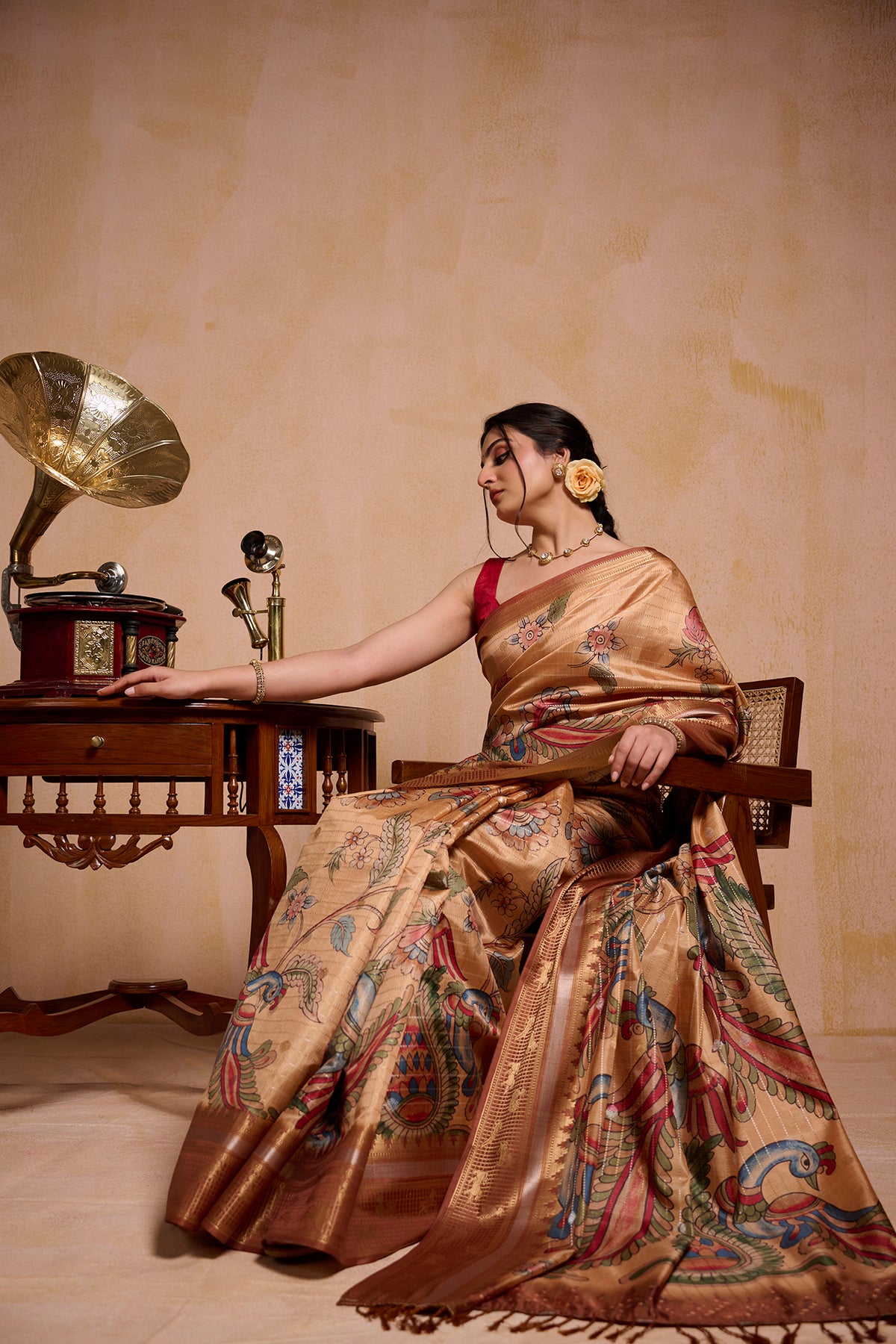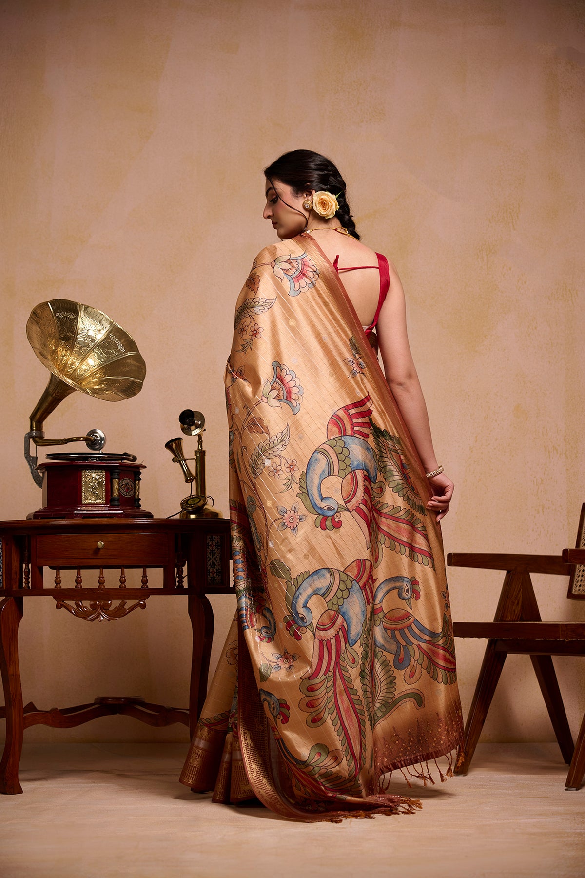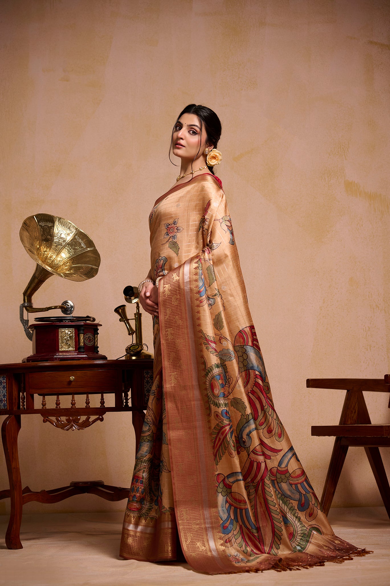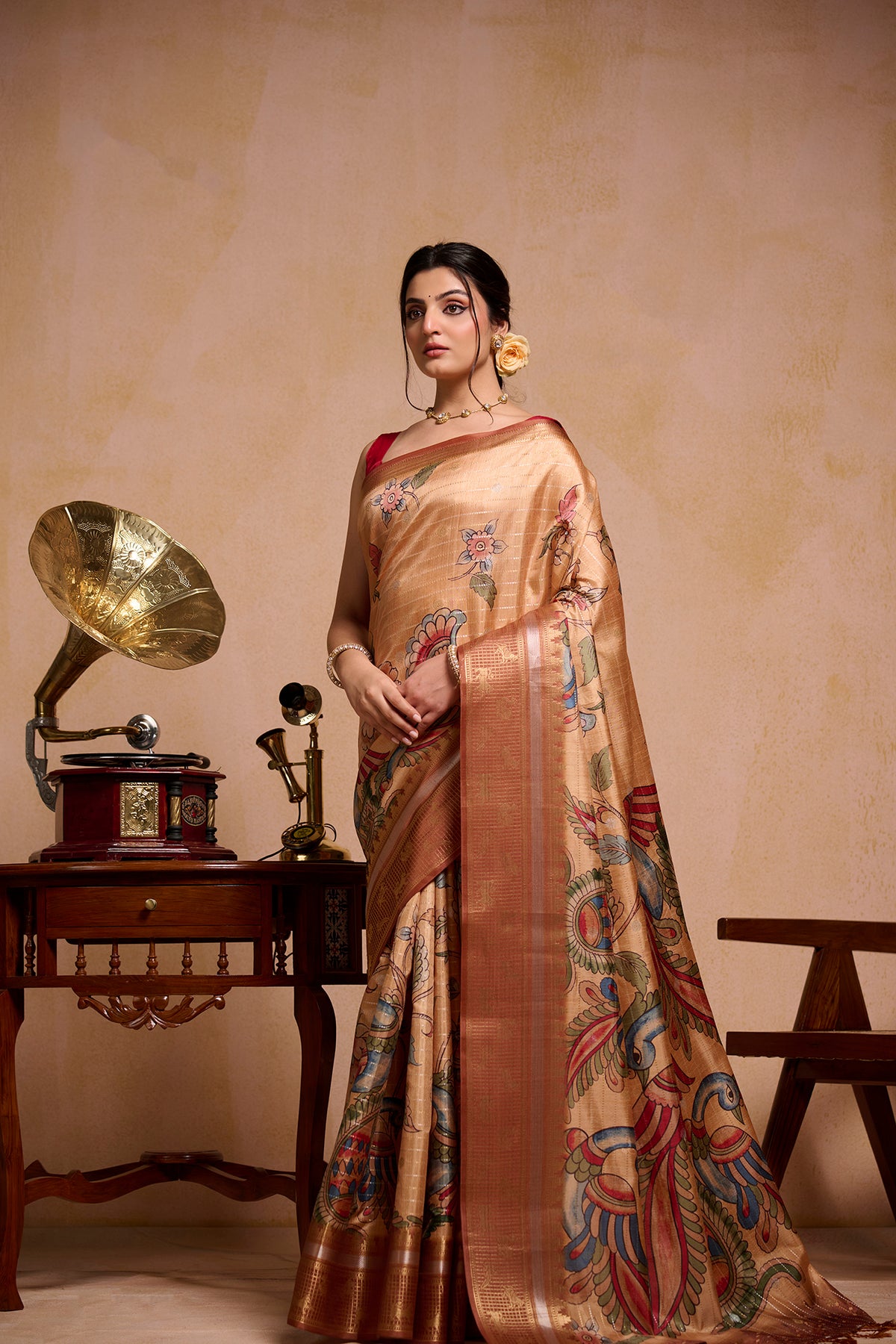This saree comes in a warm golden shade with beautiful floral and peacock prints all over. The design looks rich and elegant, making it perfect for weddings, festive events, and special occasions. The fabric drapes smoothly and feels comfortable to wear for long hours. Style it with minimal jewellery for a graceful and stylish look.