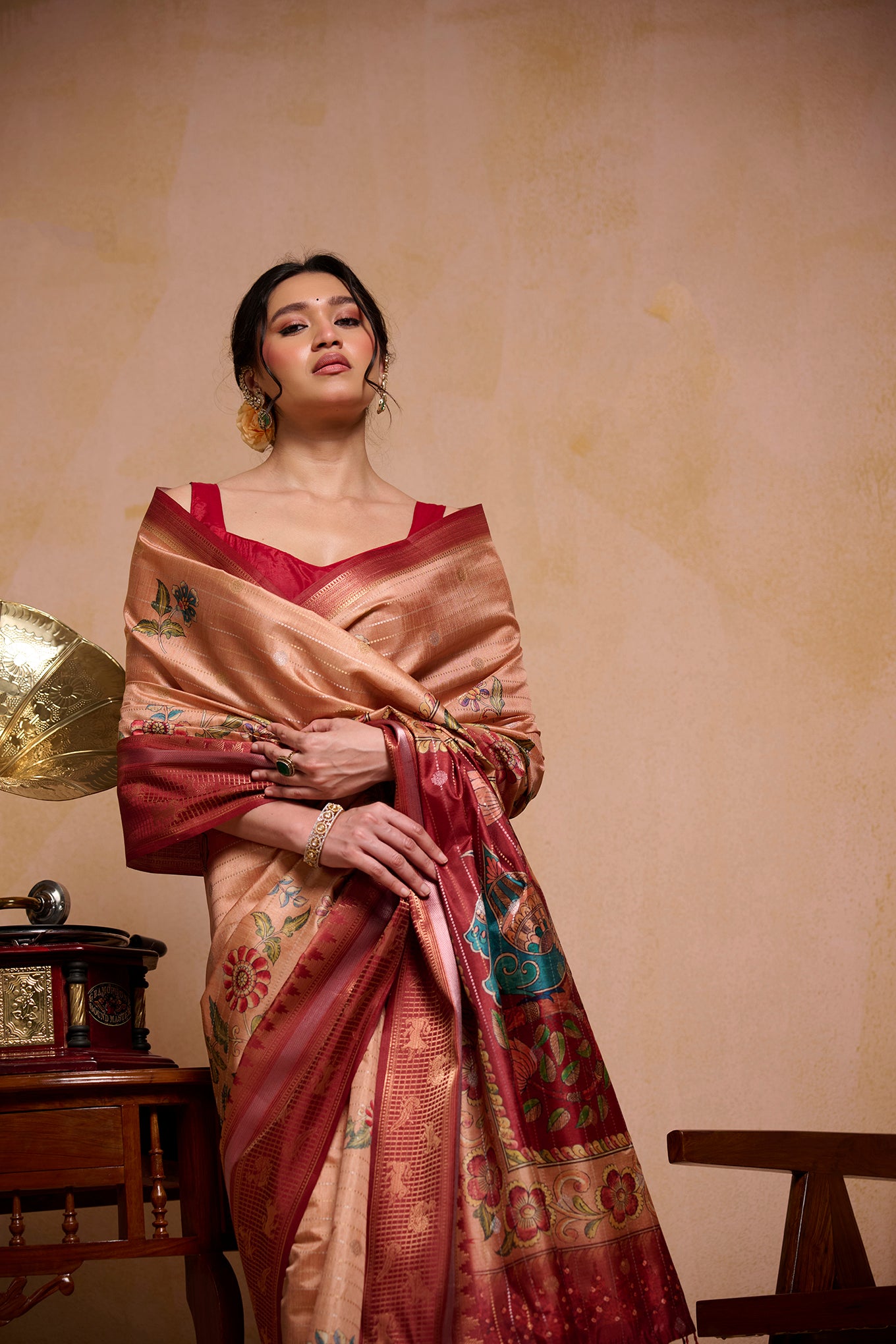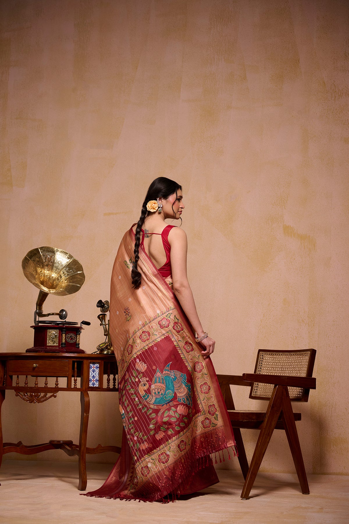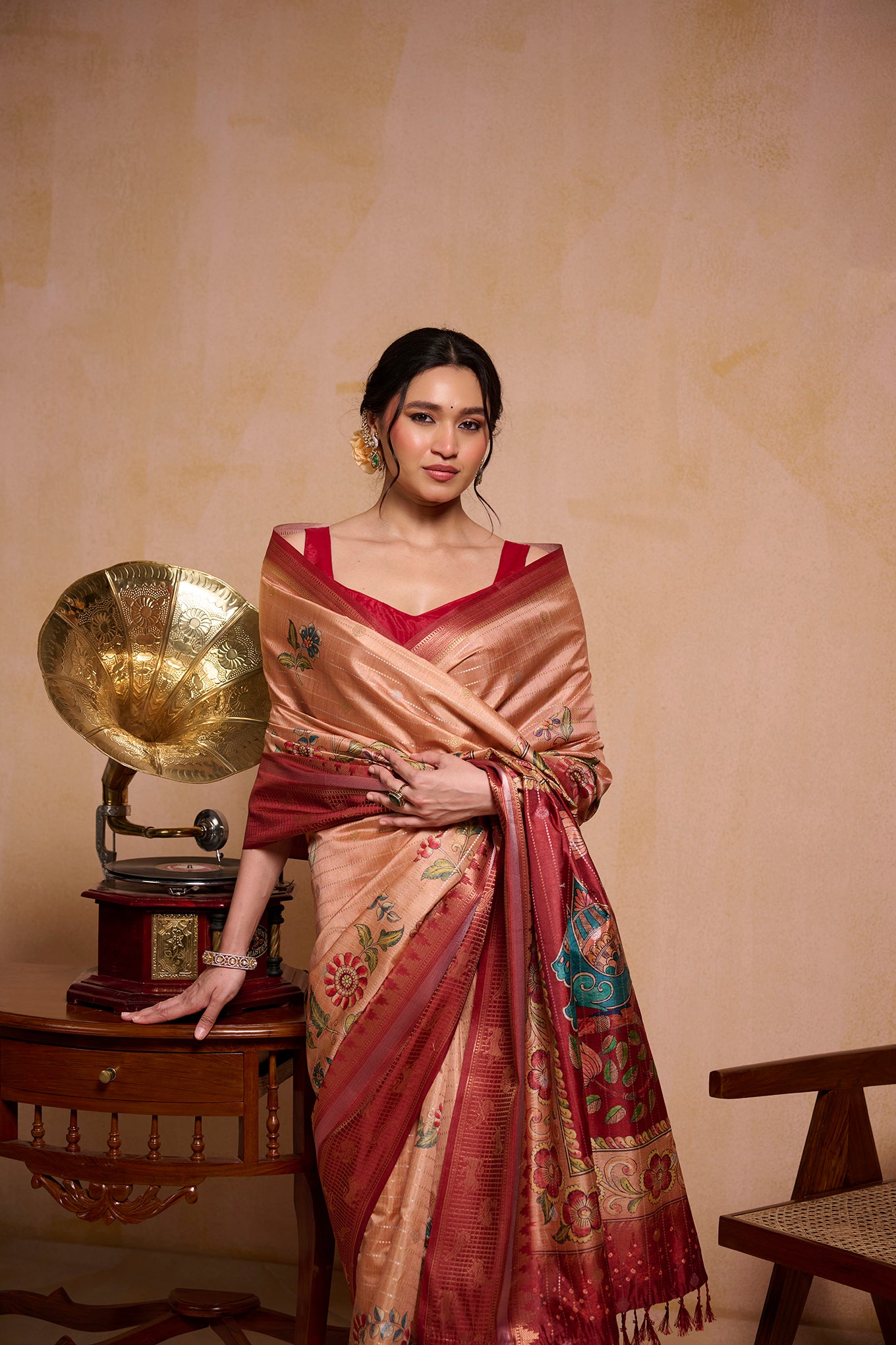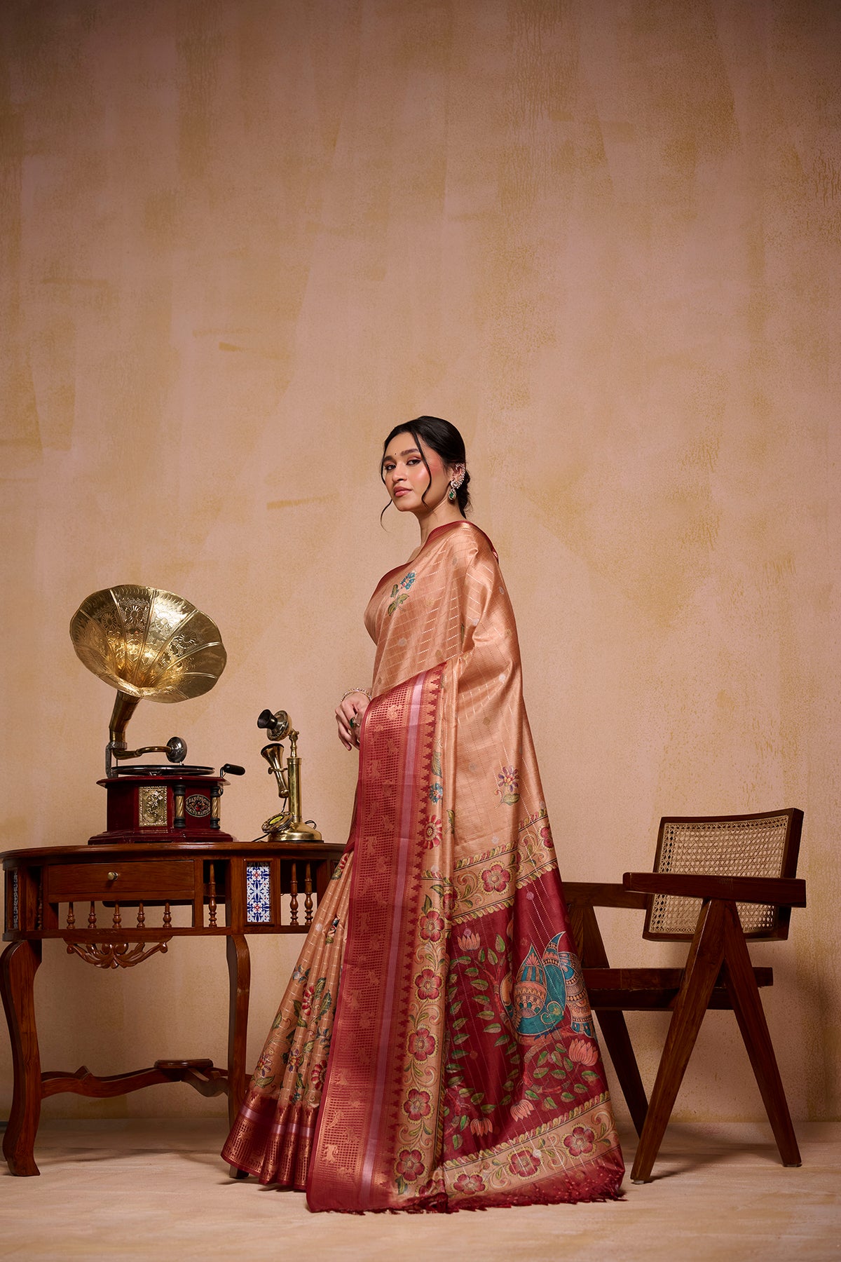 This elegant saree features soft floral and traditional motifs spread across a warm peach base. The rich printed pallu and contrasting border add depth and visual charm. Delicate patterns throughout give it a graceful and festive appeal. A perfect pick for celebrations and special occasions.