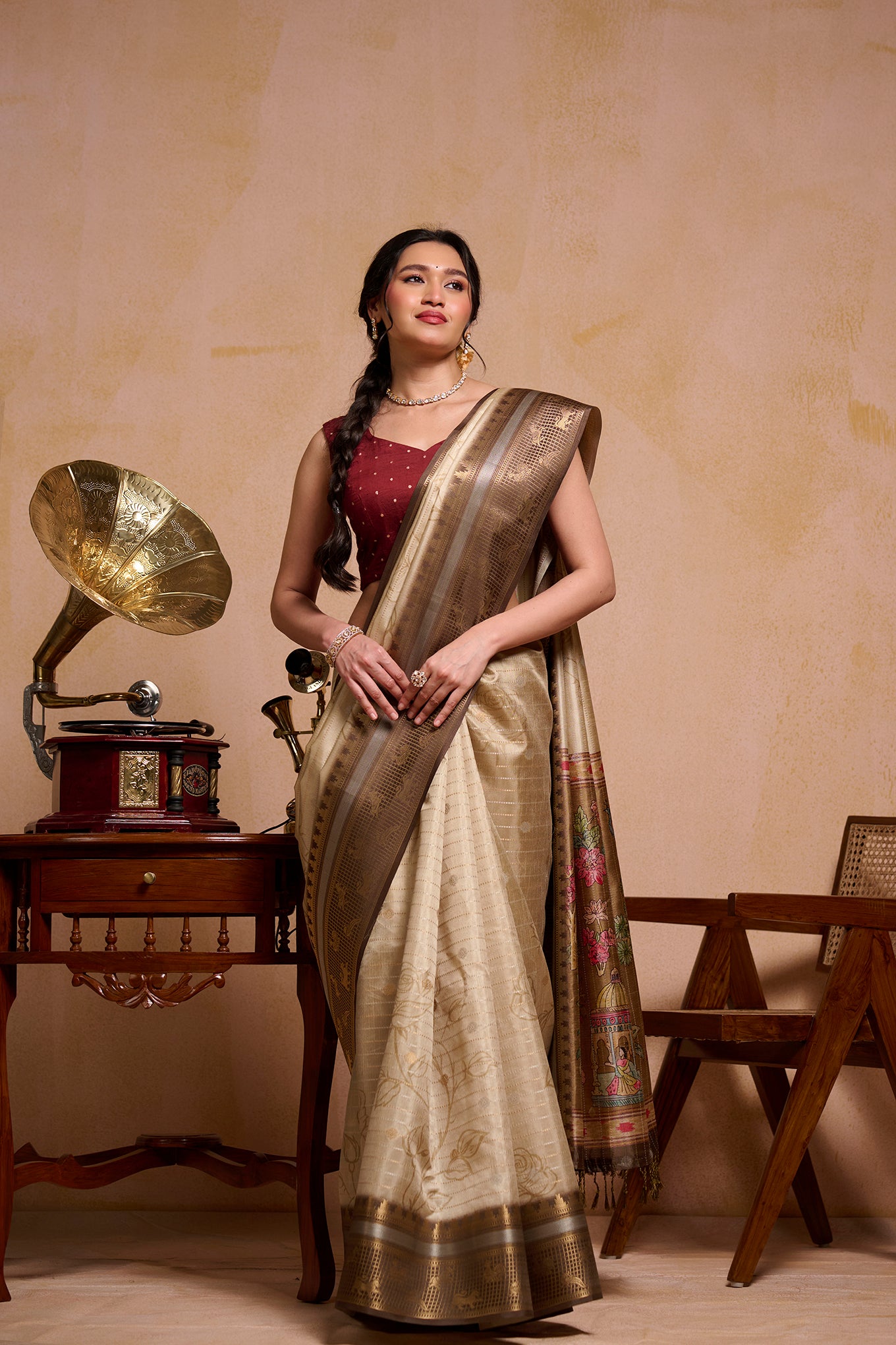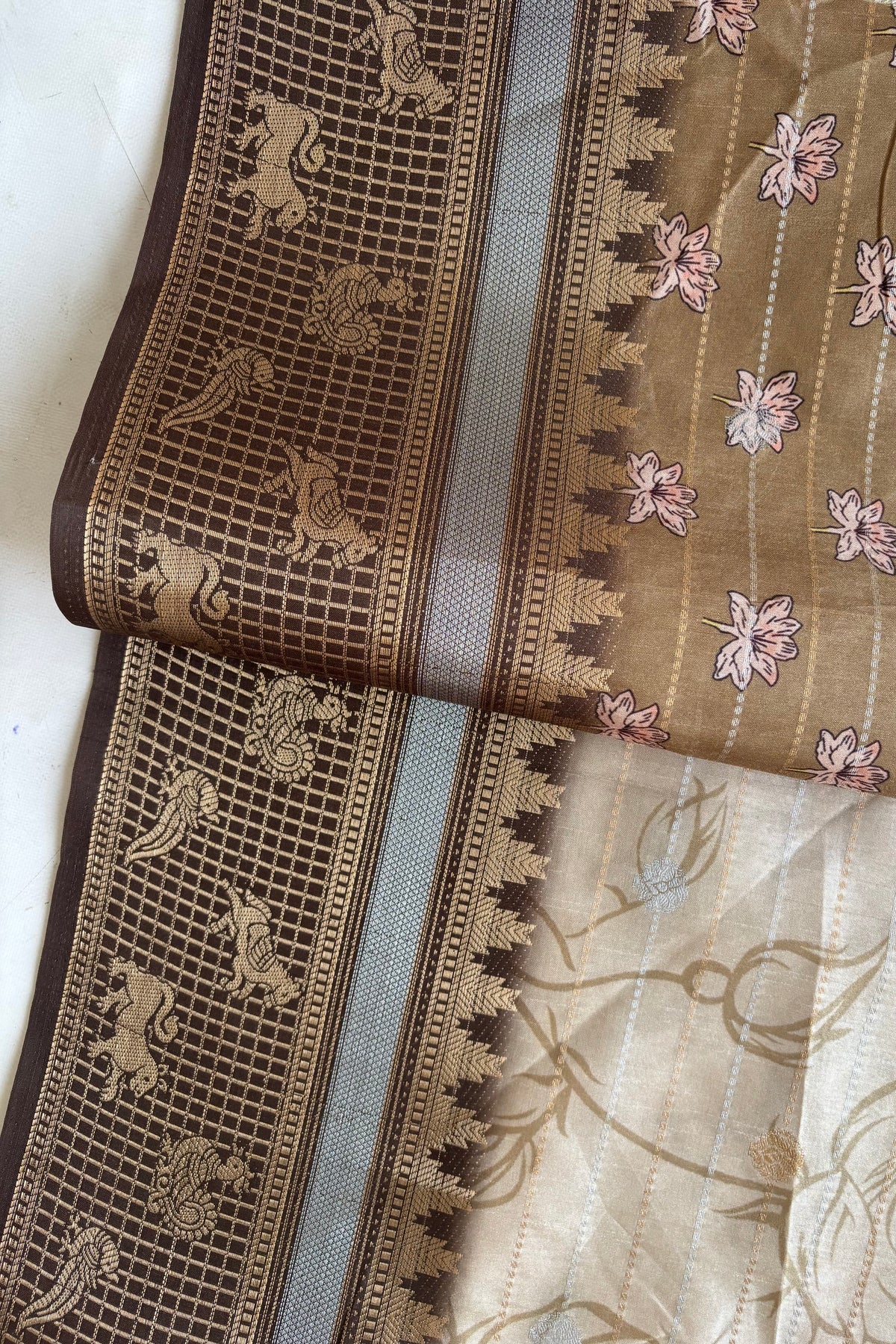 Detailed panel-style artwork brings depth and charm, making the saree visually rich yet graceful. Perfect for those who love artistic prints with a calm, classic feel.