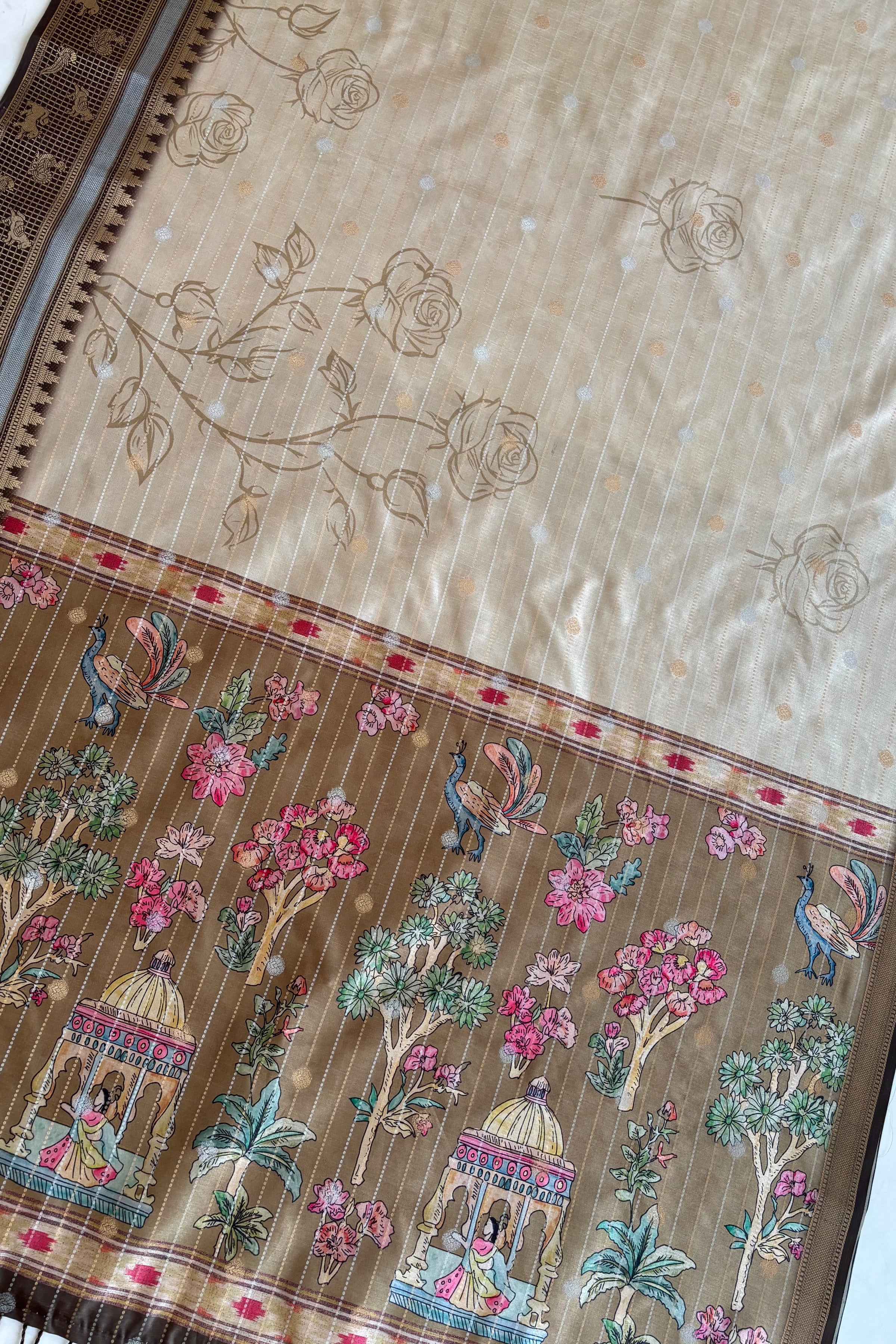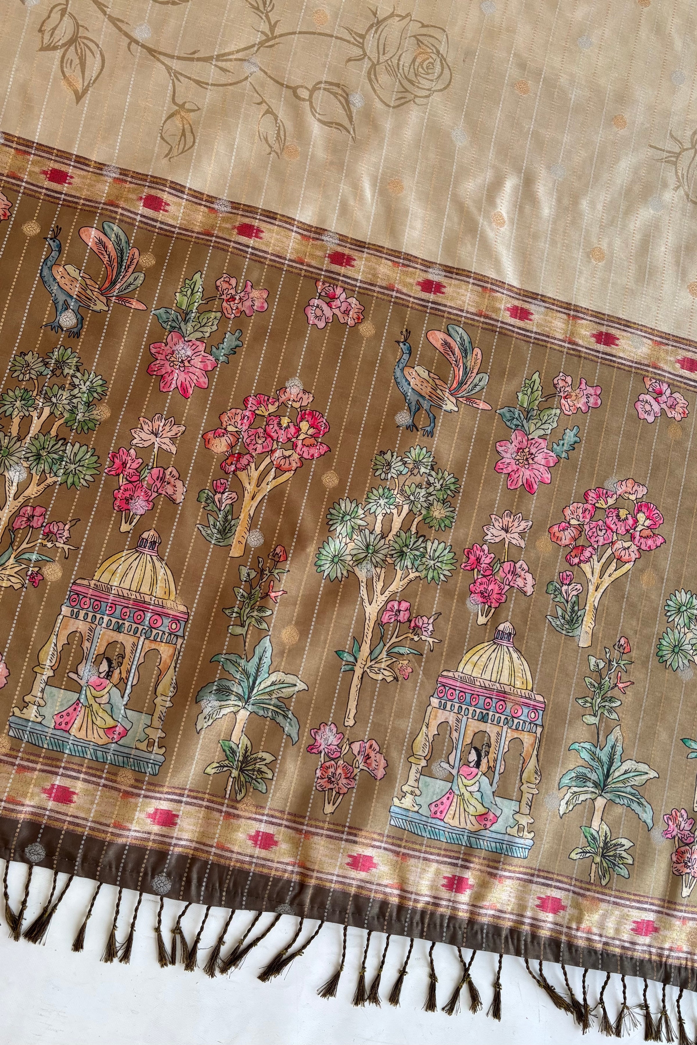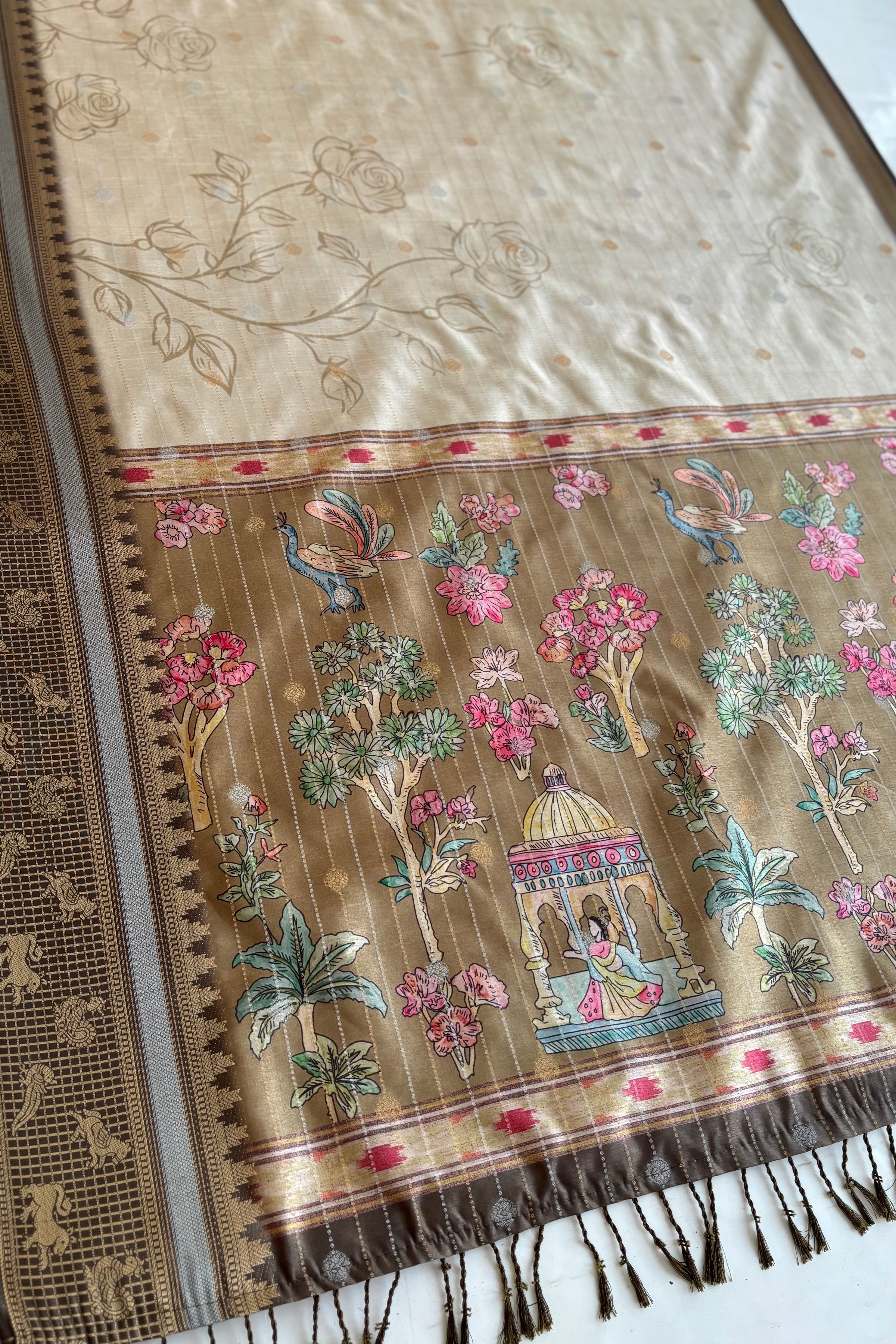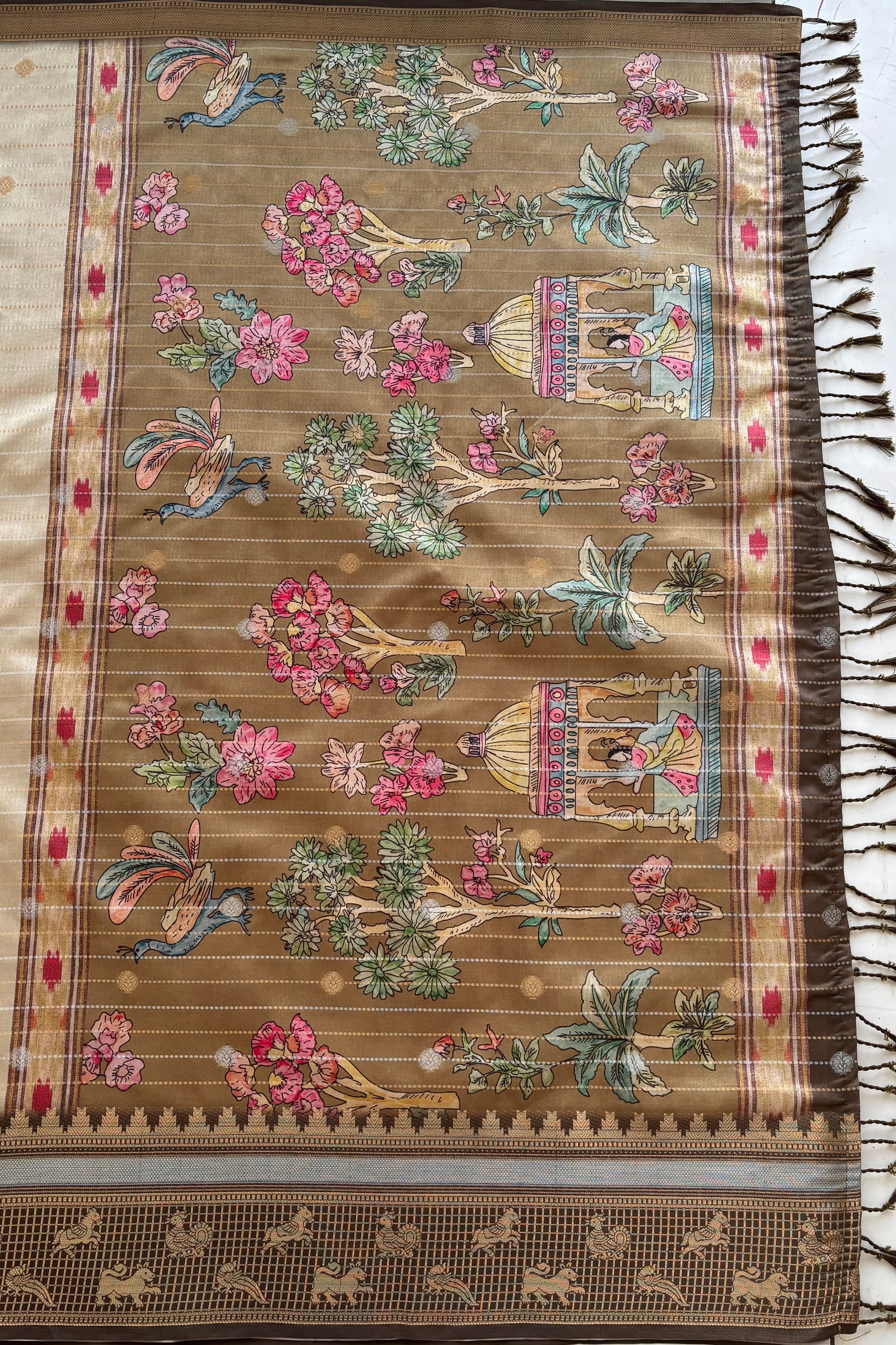 The pallu stands out with scenic prints of garden landscapes, birds, and architectural elements, creating a beautiful storytelling effect.