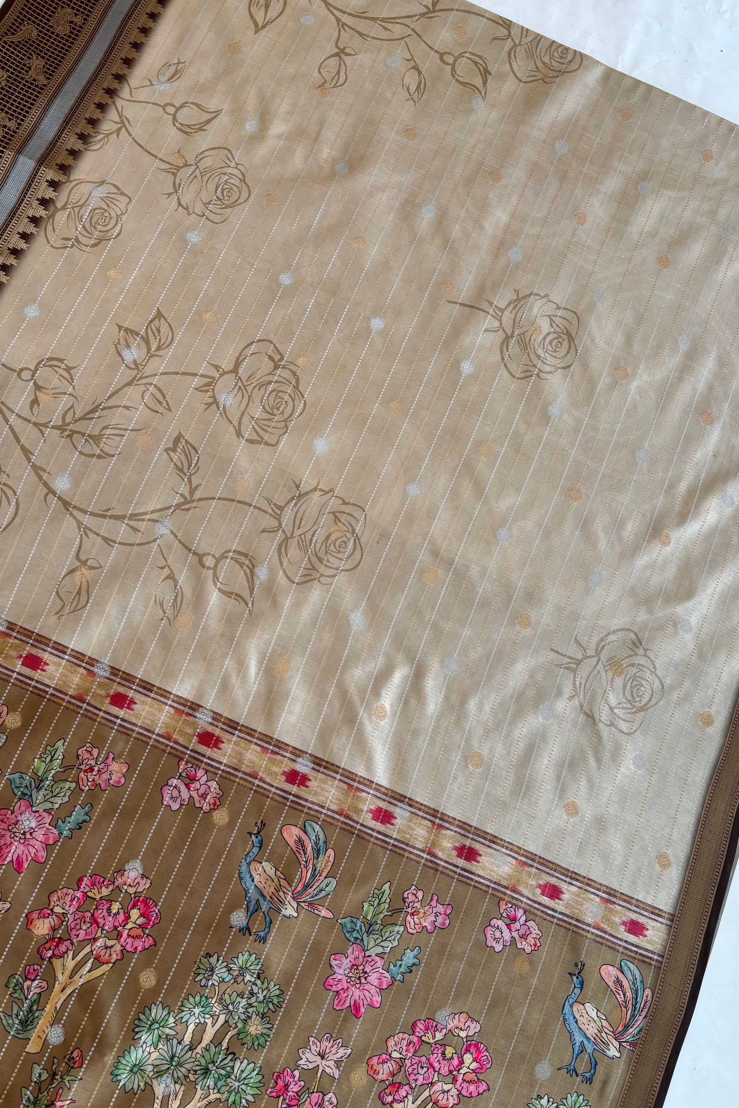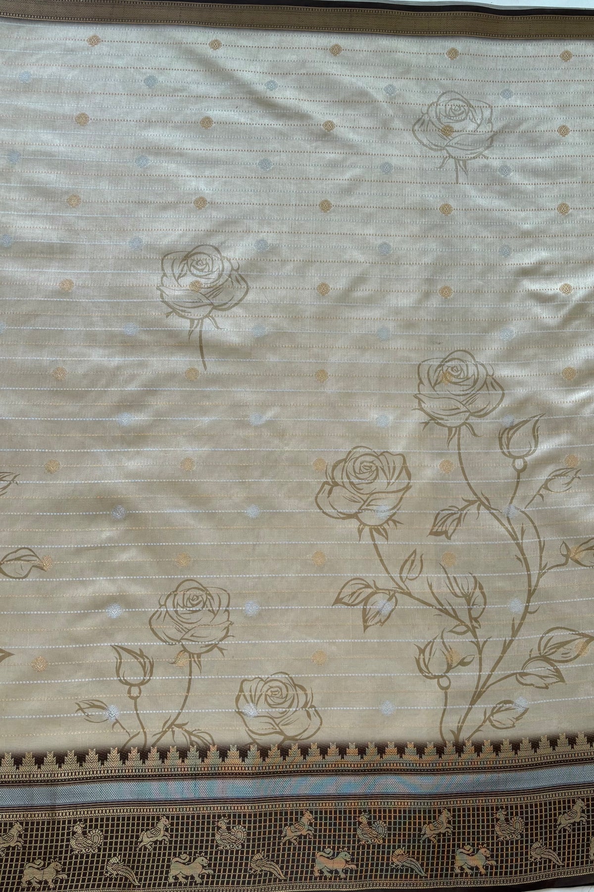 This saree features delicate rose-inspired motifs across the body, paired with fine dotted lines that add a soft, elegant rhythm.