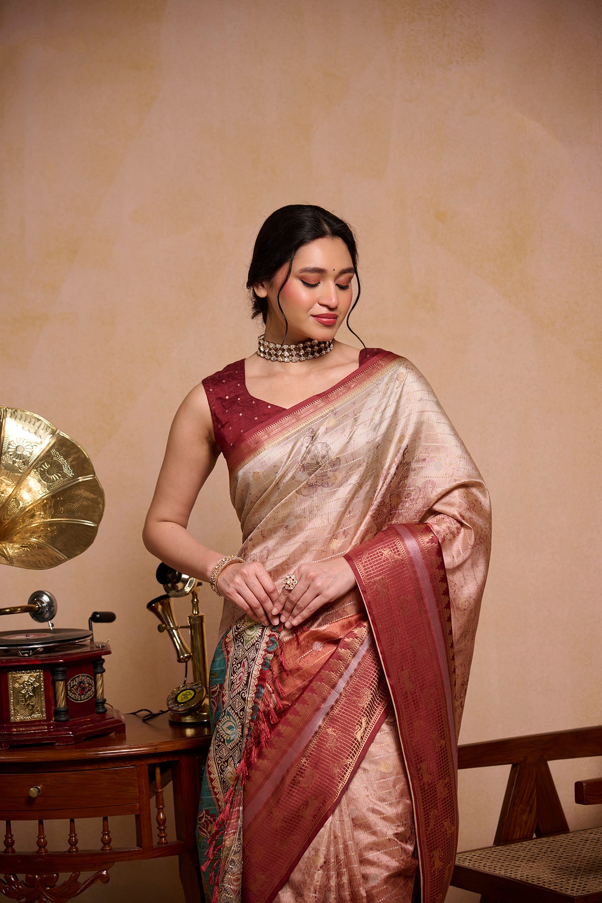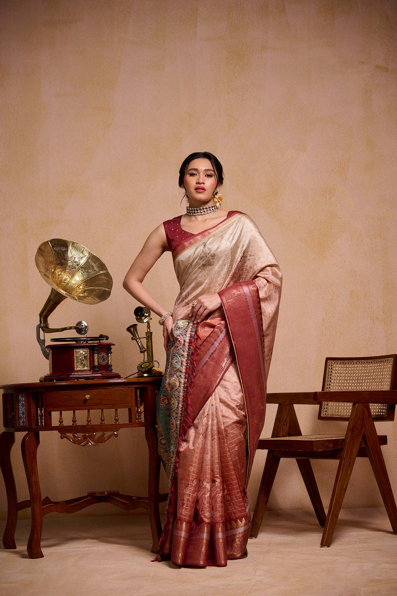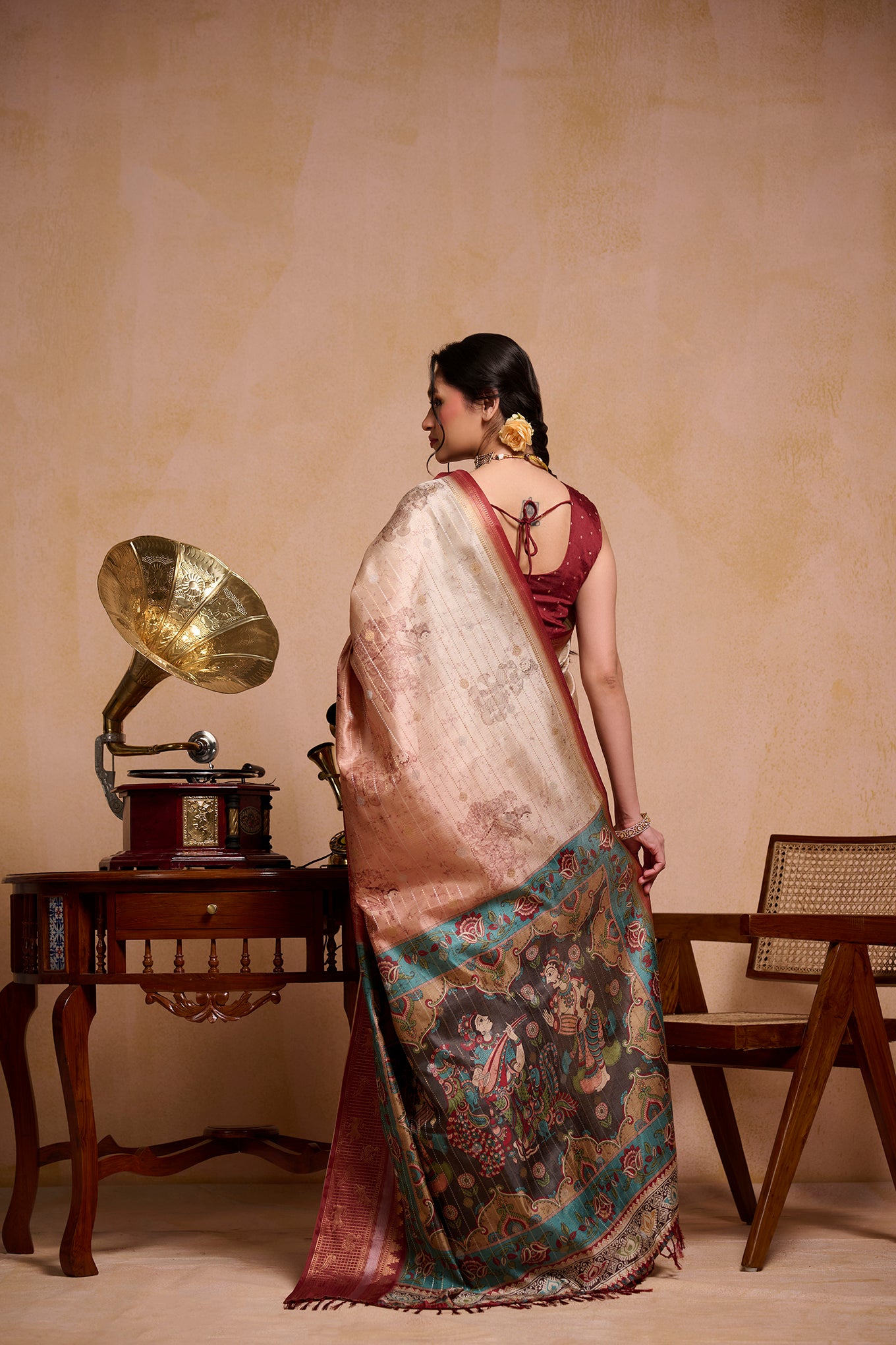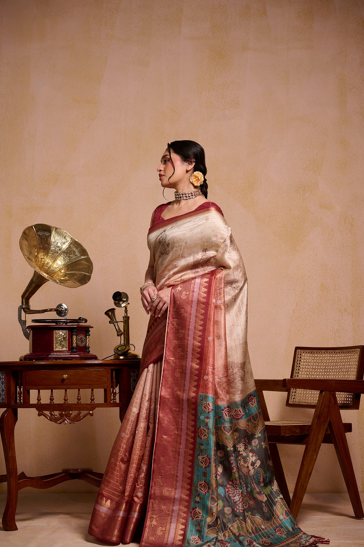 This pattu silk saree features bold figurative prints inspired by classical temple art and storytelling. The pallu showcases musician and dancer motifs framed in panel-style designs, while traditional geometric borders add a rich heritage touch. Perfect for festive and cultural occasions.