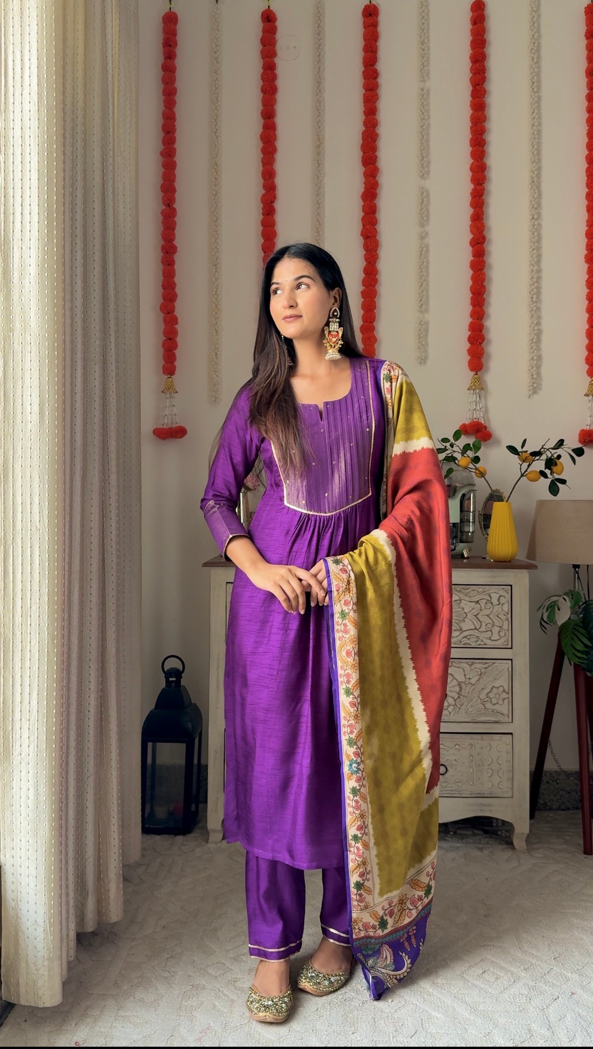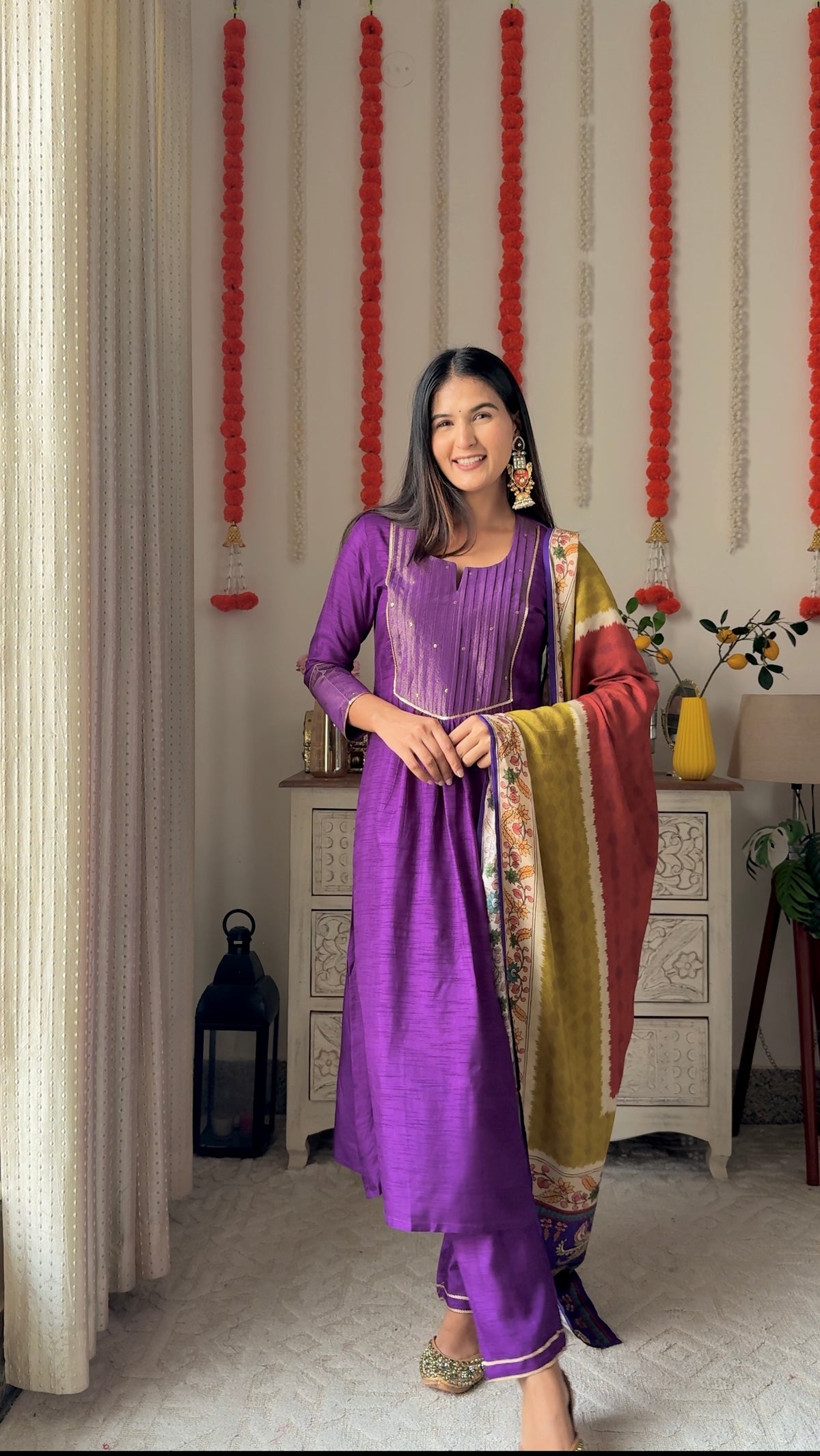 This purple kurta set is made in pure dola silk with a pure muslin dupatta. Elevate your festive style with this kurta set, featuring delicate pintuck detailing and subtle sequin accents on the yoke and sleeves. A graceful blend of simplicity and sparkle, perfect for special occasions.